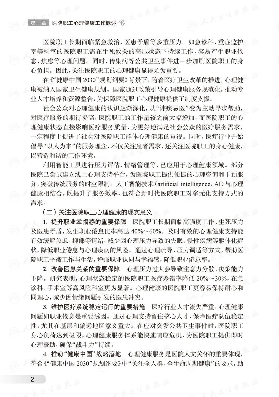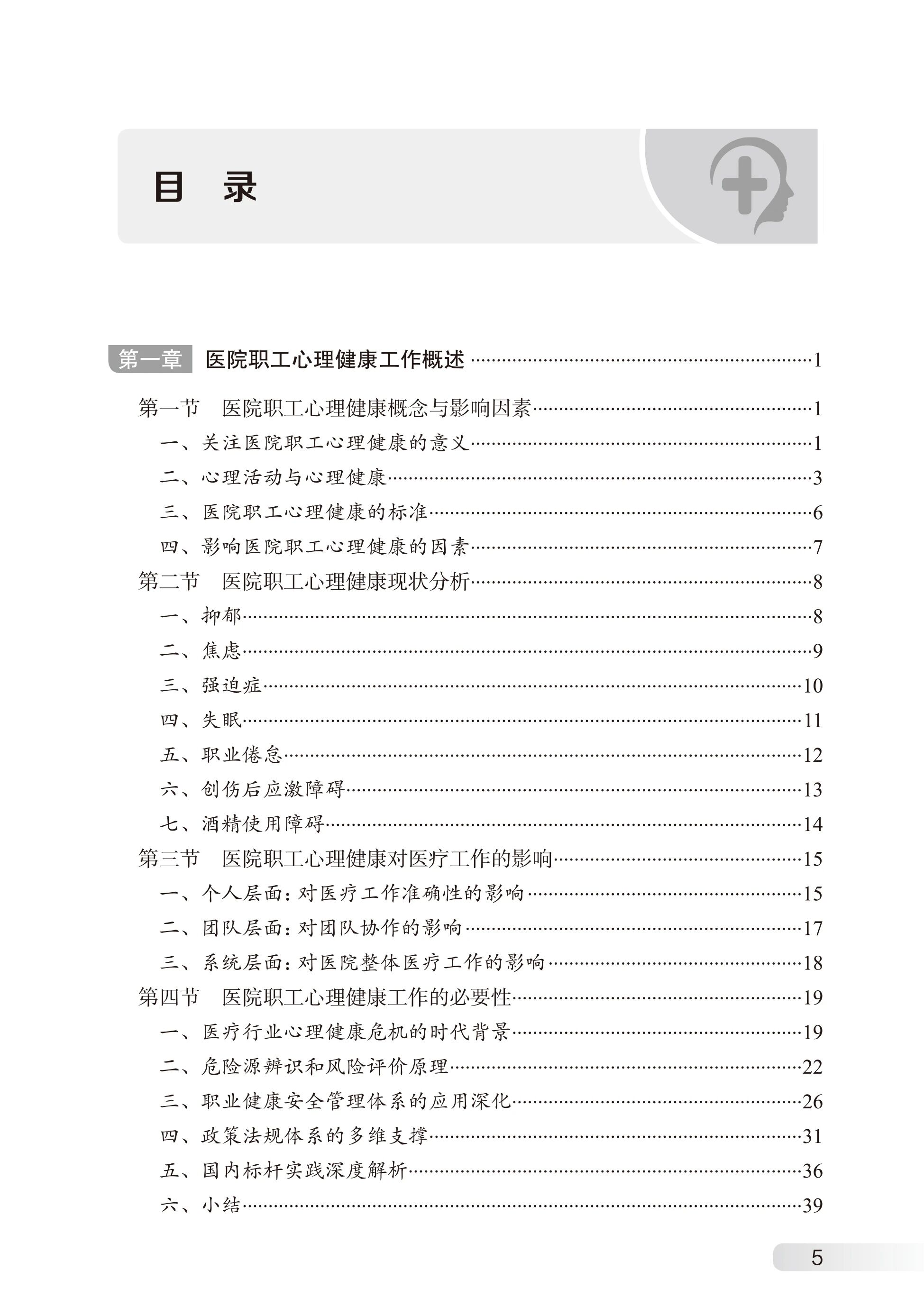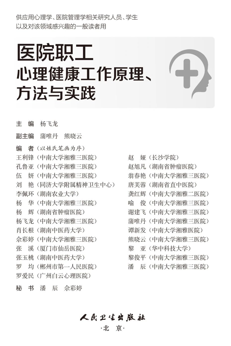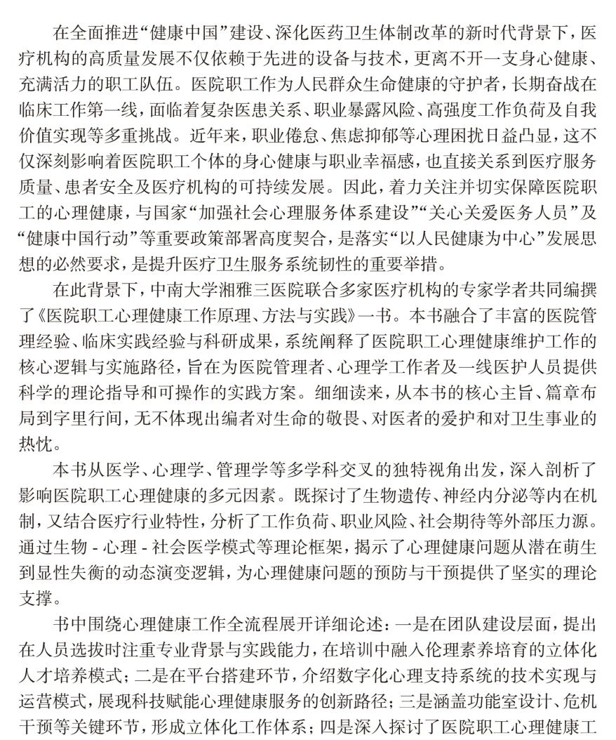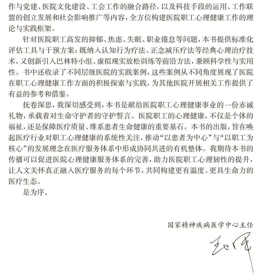 内容全面,针对性强:涵盖心理健康工作的基础理论、评估、干预、治疗、预防等多个方面,形成完整的知识体系;同时针对医院职工这一特定群体,提供针对性强的解决方案。