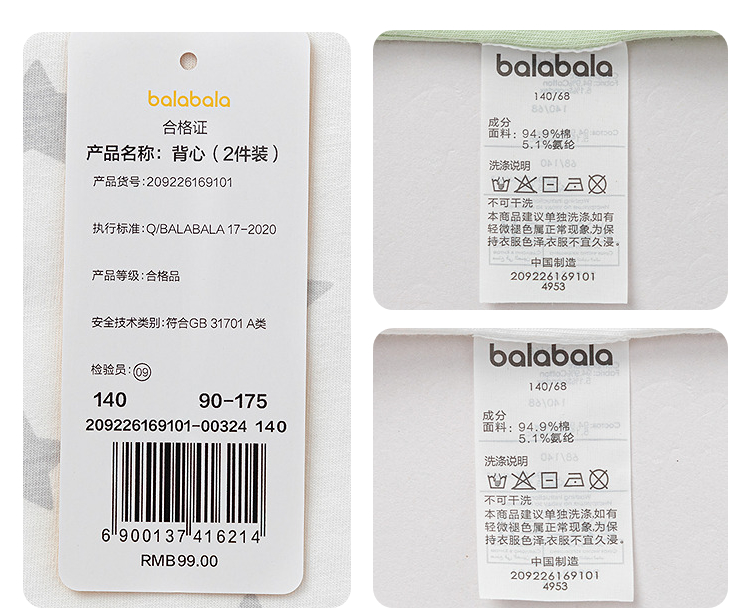 巴拉巴拉儿童背心夏季新款宝宝男童打底衫a类无袖亲肤舒适两件装