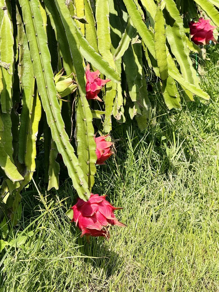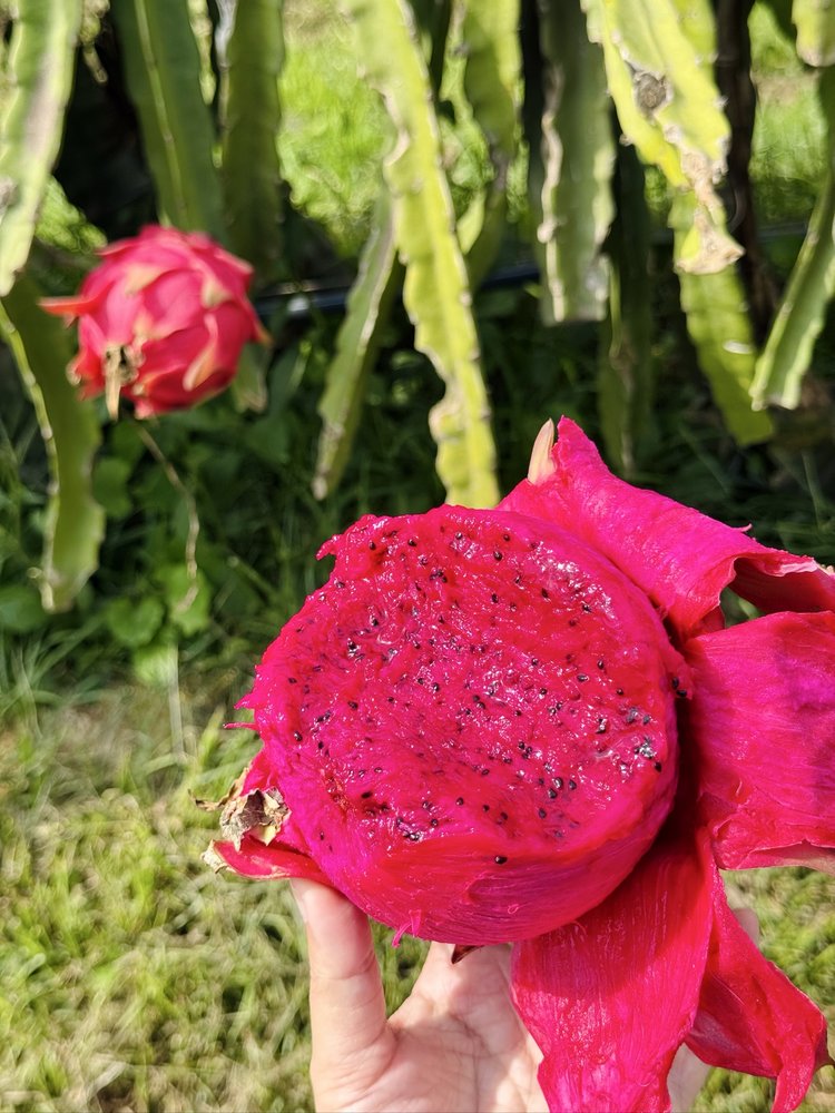 火龙果基地科学性种植管理,以绿色生态为核心,种植出的的火龙果 果色深红有光泽,再加上留至自然熟,果形饱满.每株火龙果留有一定的行间距在保证产量的同时,同时留有充足的空间间隙,可以保证日照充足
