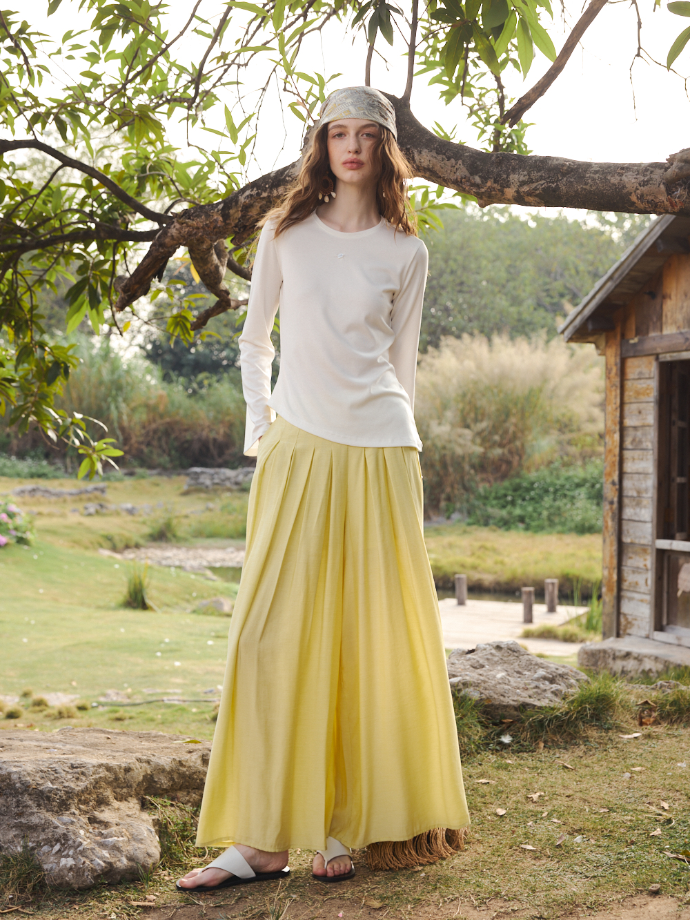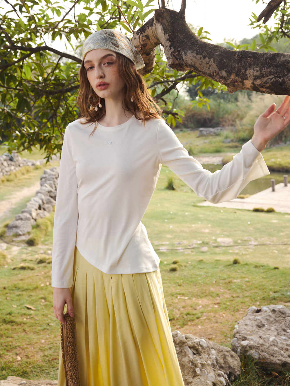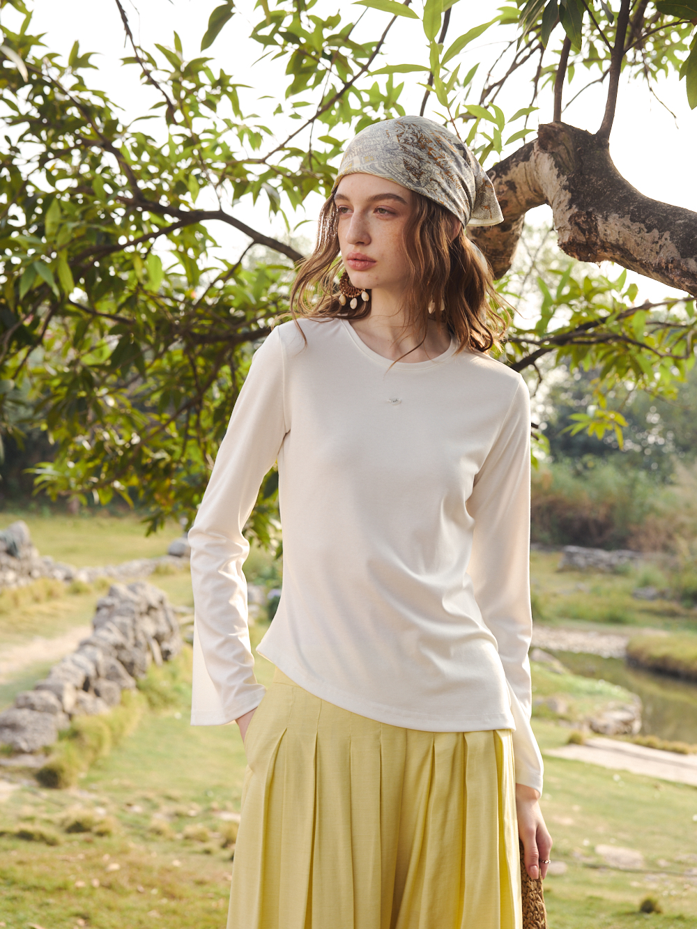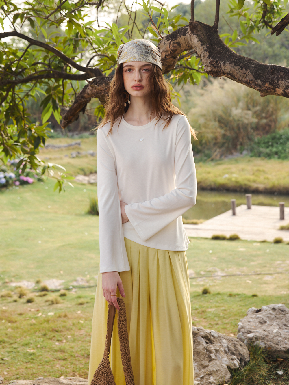 OLrain欧芮儿2026春白色简约宽松慵懒长袖T恤圆领上衣女针织