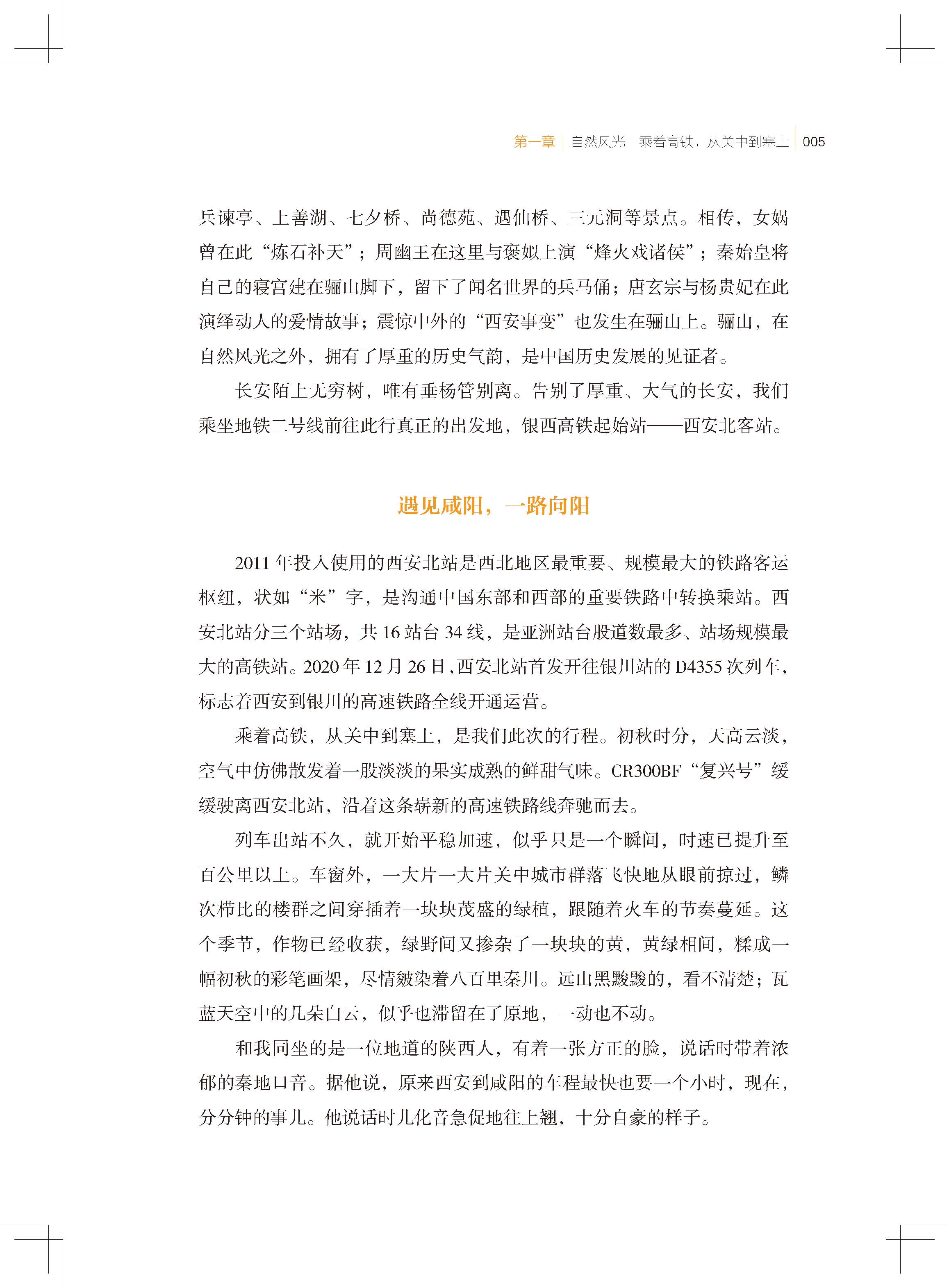 《巨龙西行——银西高铁纪行》是一本记录8位作者银西高铁沿途见闻感受的铁路游记文化类图书。内容由自然风光、百姓生活、悠久历史、物华天宝和红色基因五部分组成。全书图文并茂,文字简洁优美、风格各异,图片精彩纷呈,立体展现铁路沿线的风土人情,宣传铁路的建设成果和对经济社会的贡献,抒发铁路赓续红色基因的家国情怀。