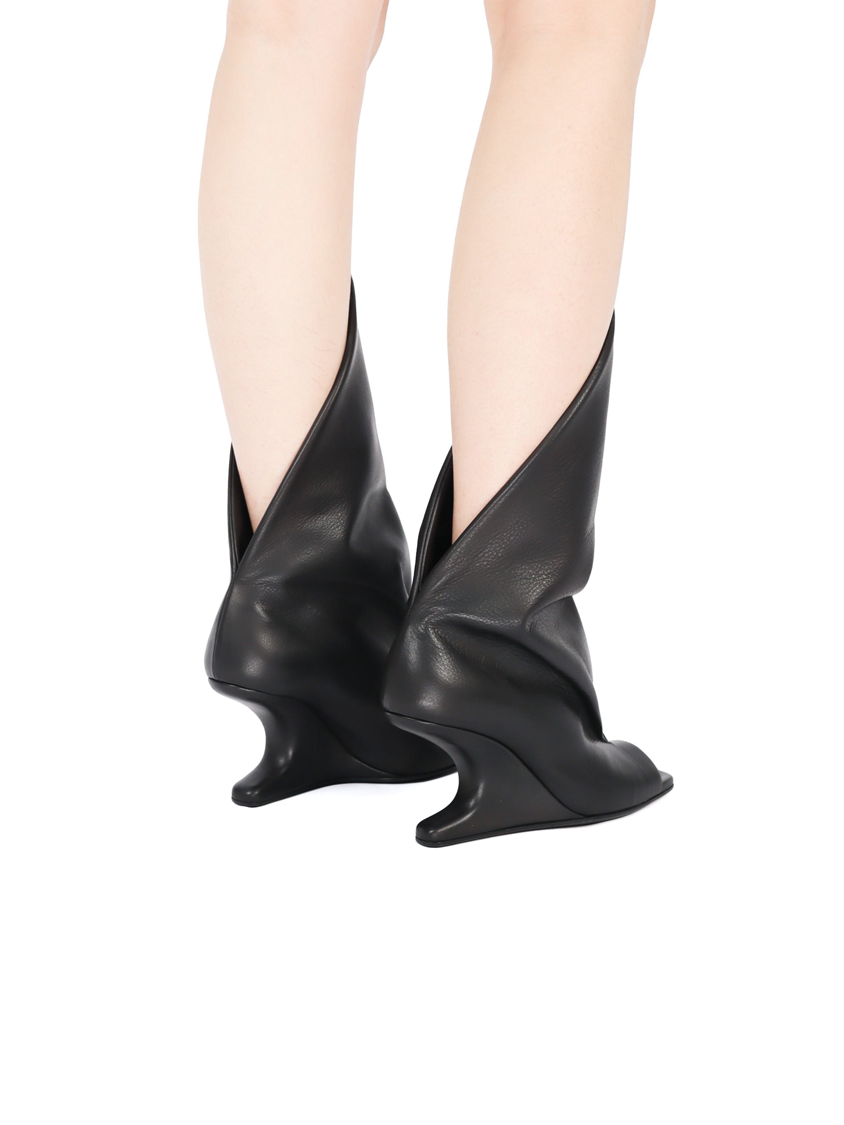 这款8厘米悬臂式凉鞋鞋跟前部呈尖状。鞋面采用皮革材质,从横跨脚趾的绑带处向前展开。鞋跟高8厘米,后跟露跟设计。