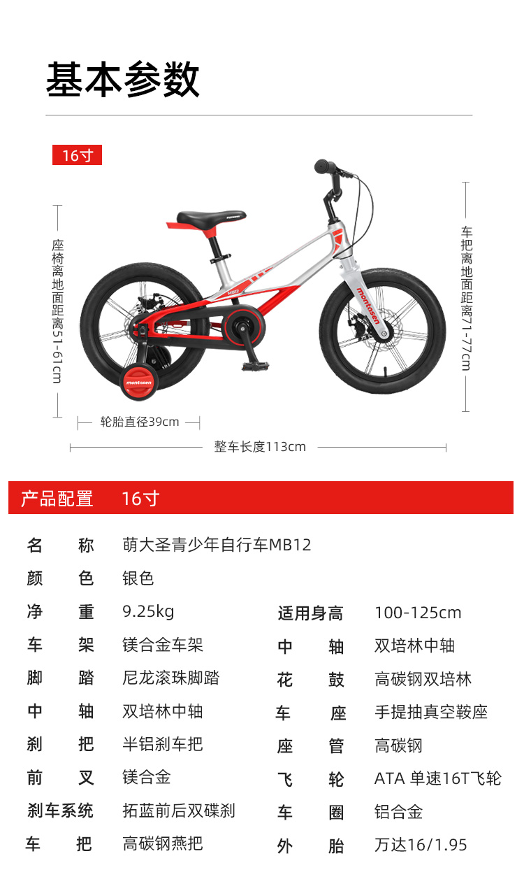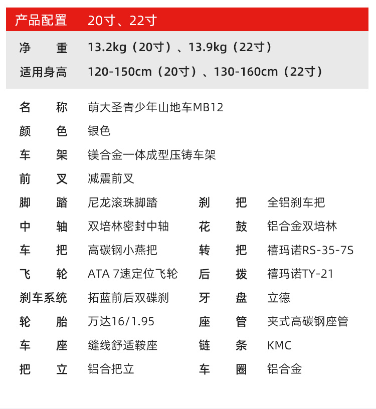 萌大圣MB12儿童自行车中大童男孩女孩6一8一12岁学生单车轻便小孩