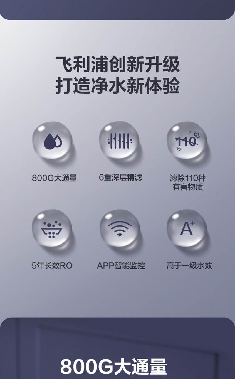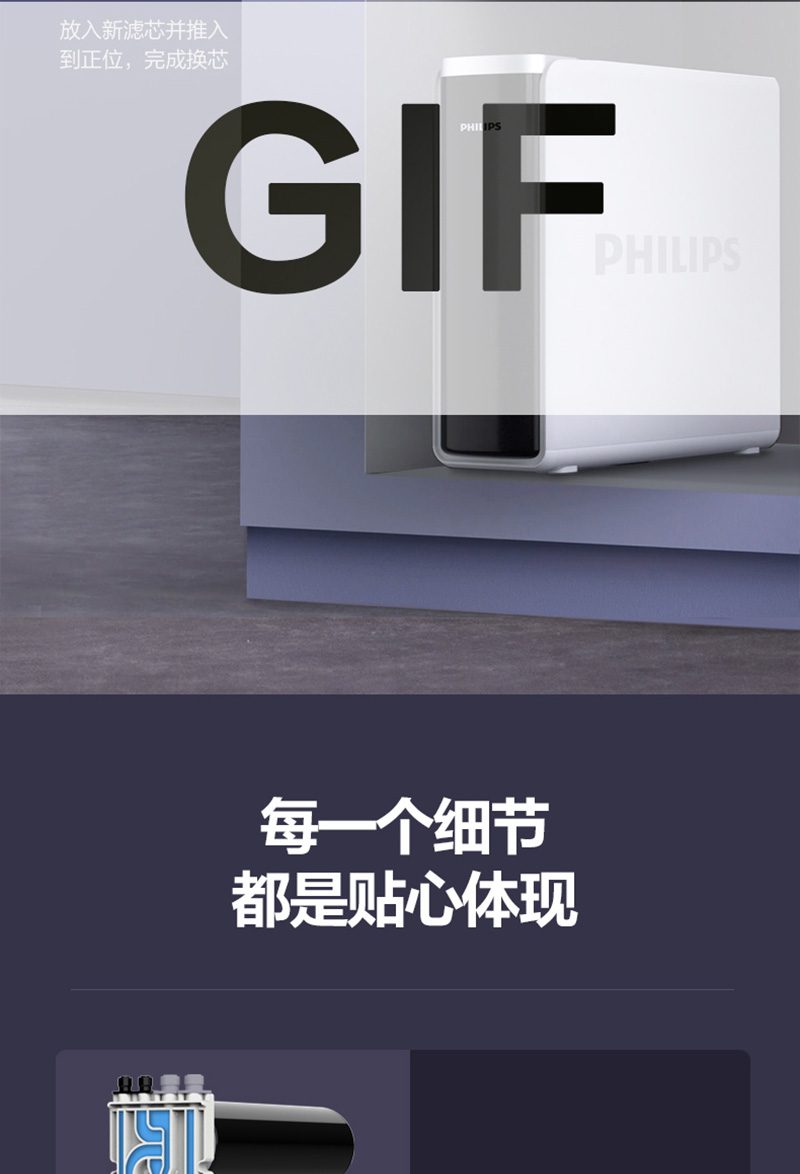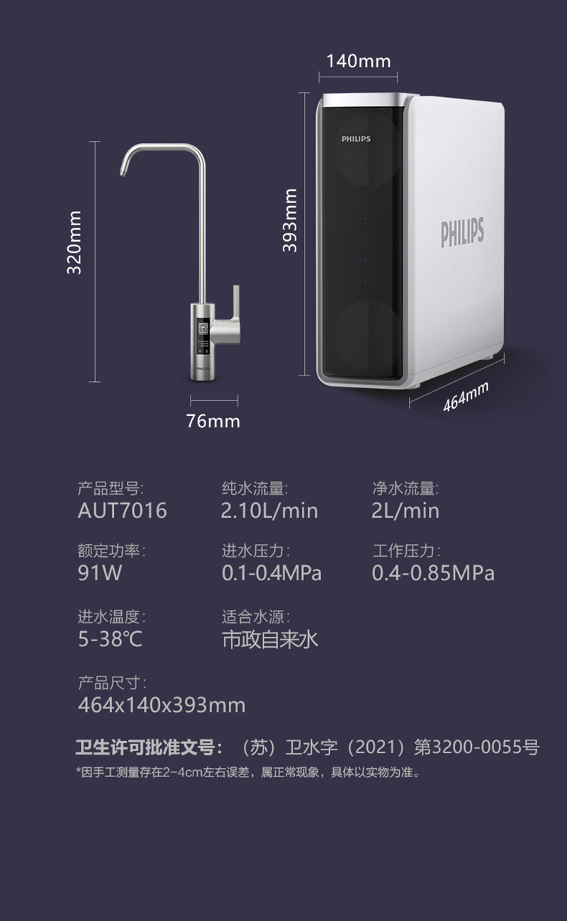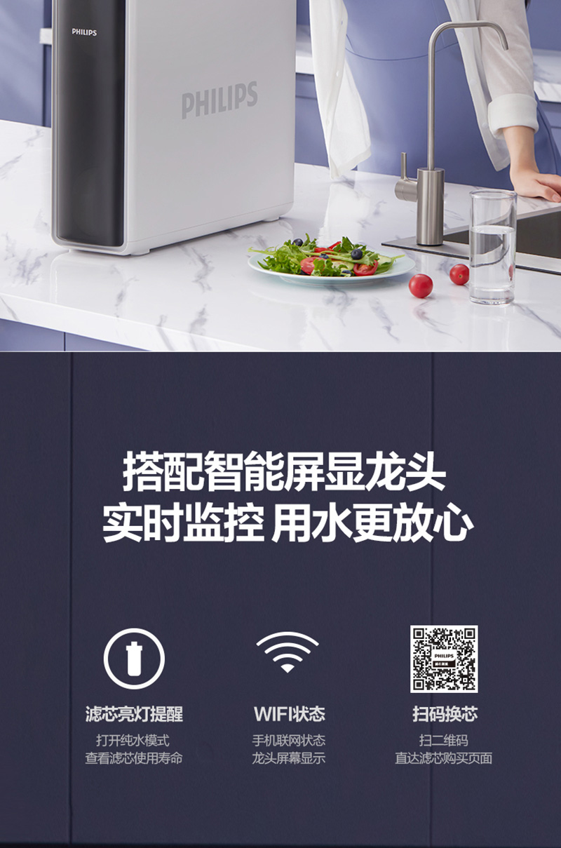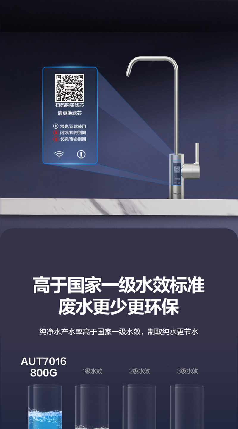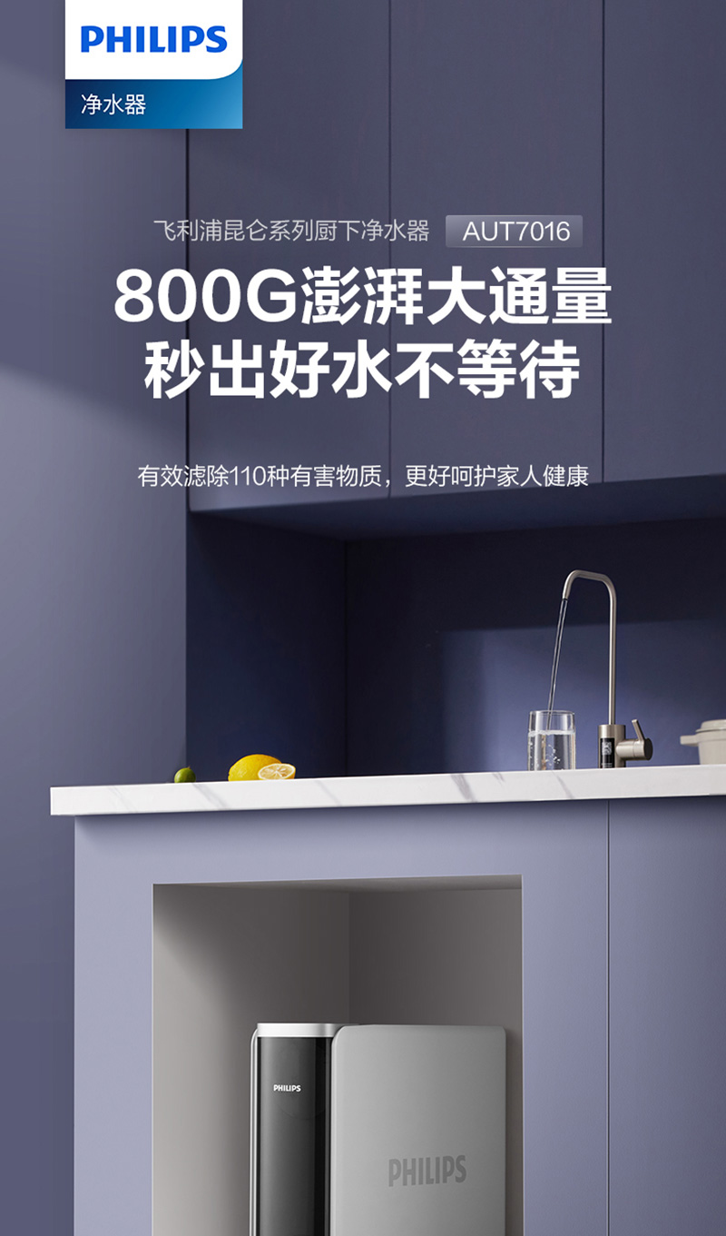 飞利浦 双出水家用净水器 800加仑无桶反渗透直饮纯水机AUT7016