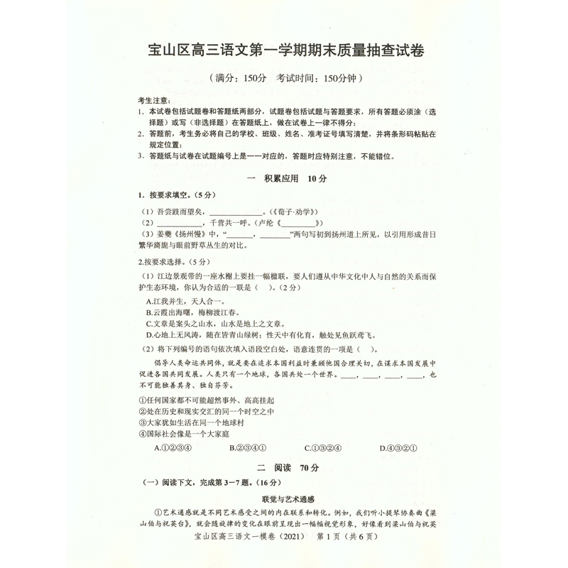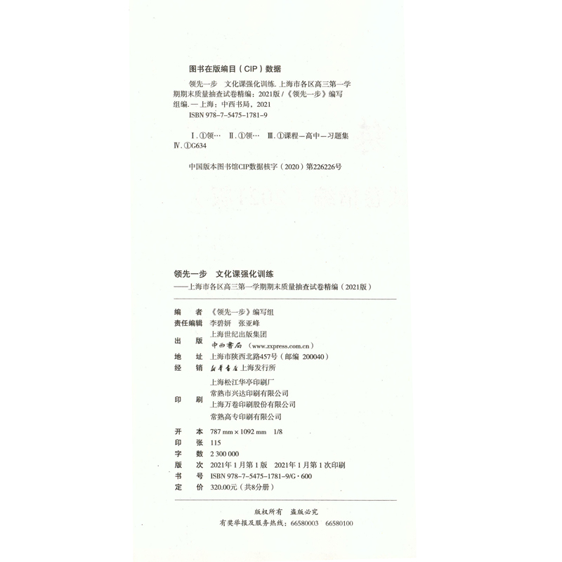 2021版领先一步高考一模卷 语文 文化课强化训练 高考一模卷语文试卷 上海市高三第一学期期末质量抽查试卷高中习题测试卷中西书局
