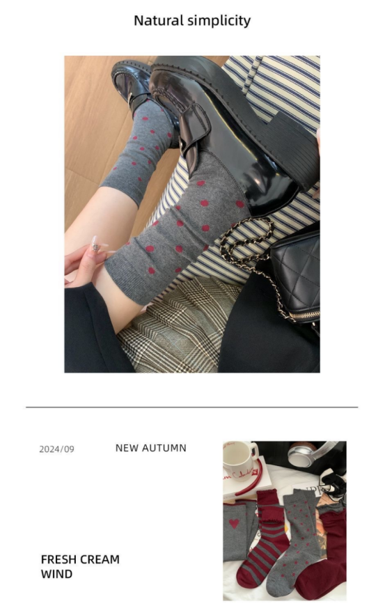 超级韩超随意自由 今年秋冬的时髦感少不了这款袜子 复古高级感十足 这款袜子文艺感很强 今年的流行的色系全部搭配上了 爱心 蝴蝶结 波点 条纹 假2件设计 全部展现的淋漓尽致❤️❤️ 越简单越舒适 纯色经典百搭 材质非常舒适 能驾驭所有穿搭 随便怎么穿都好看❗️ 有5款颜色 每款都是超级百搭的颜色 这个价格性价比 简直绝了