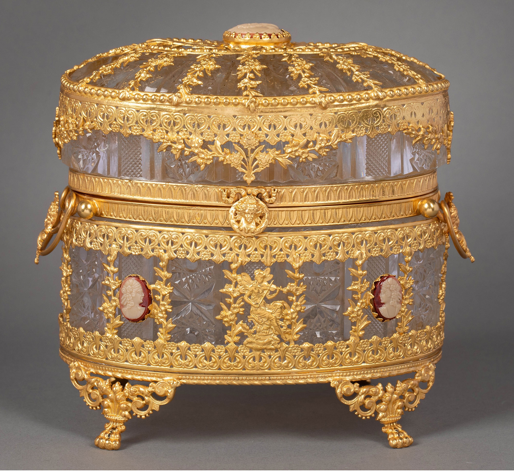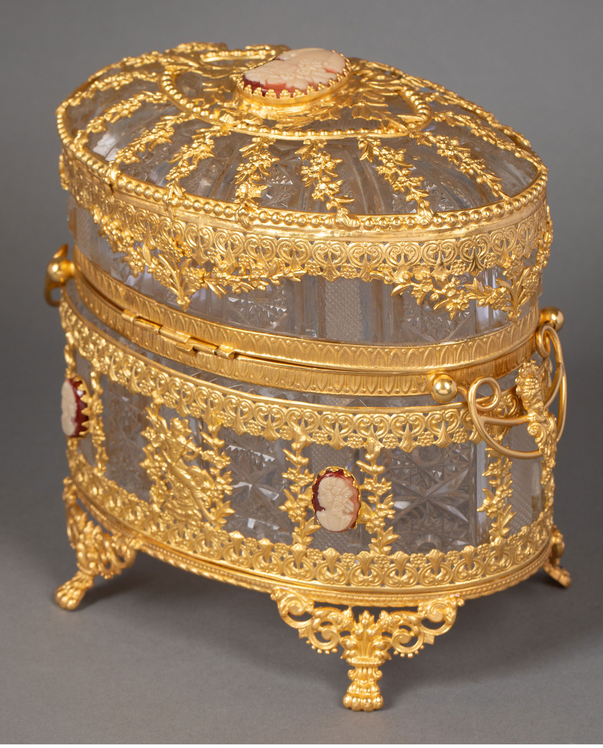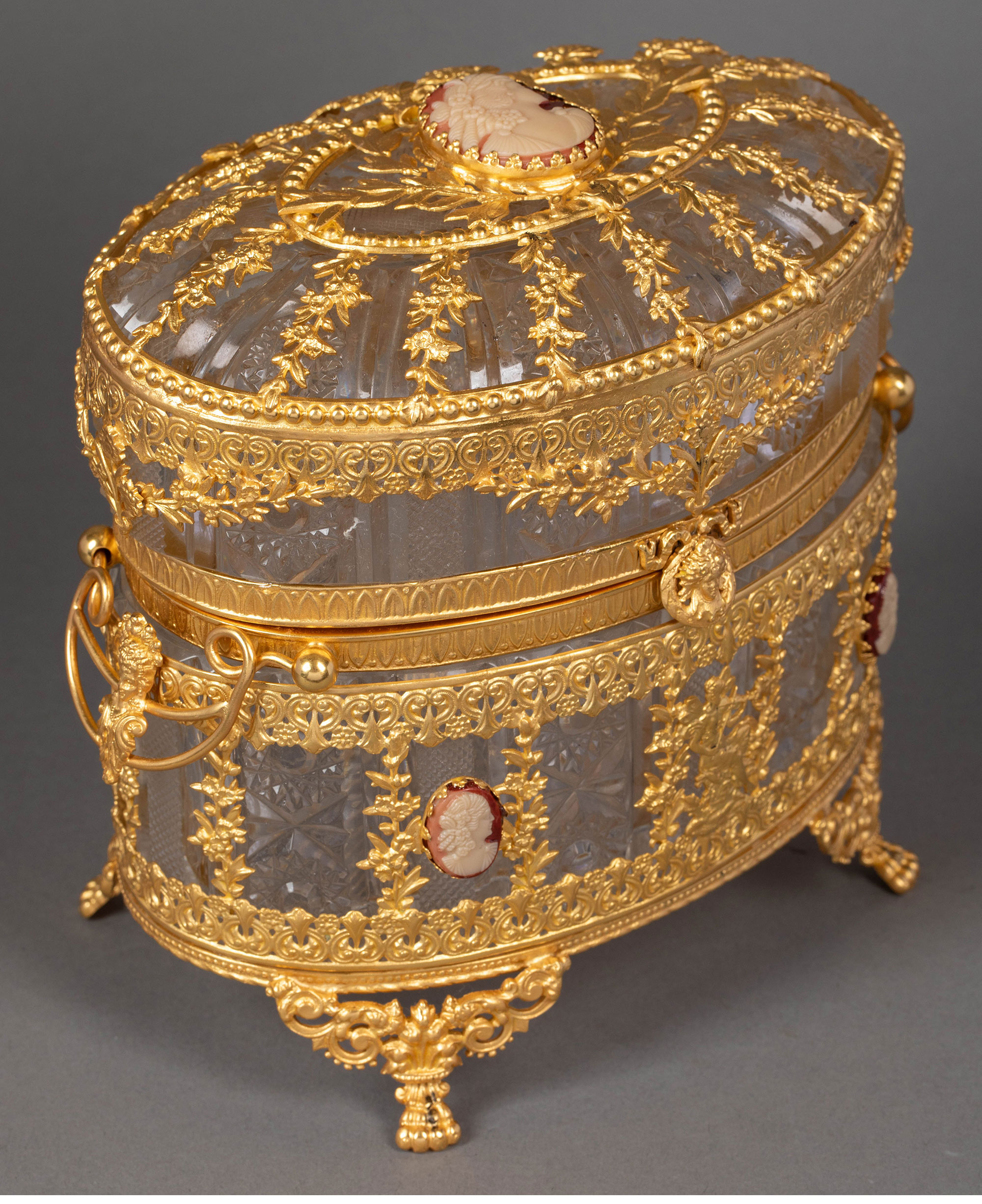 19世纪末法国出品精灵仙子主题铜鎏金精雕嵌古典女子肖像卡梅奥装饰水晶珍宝盒