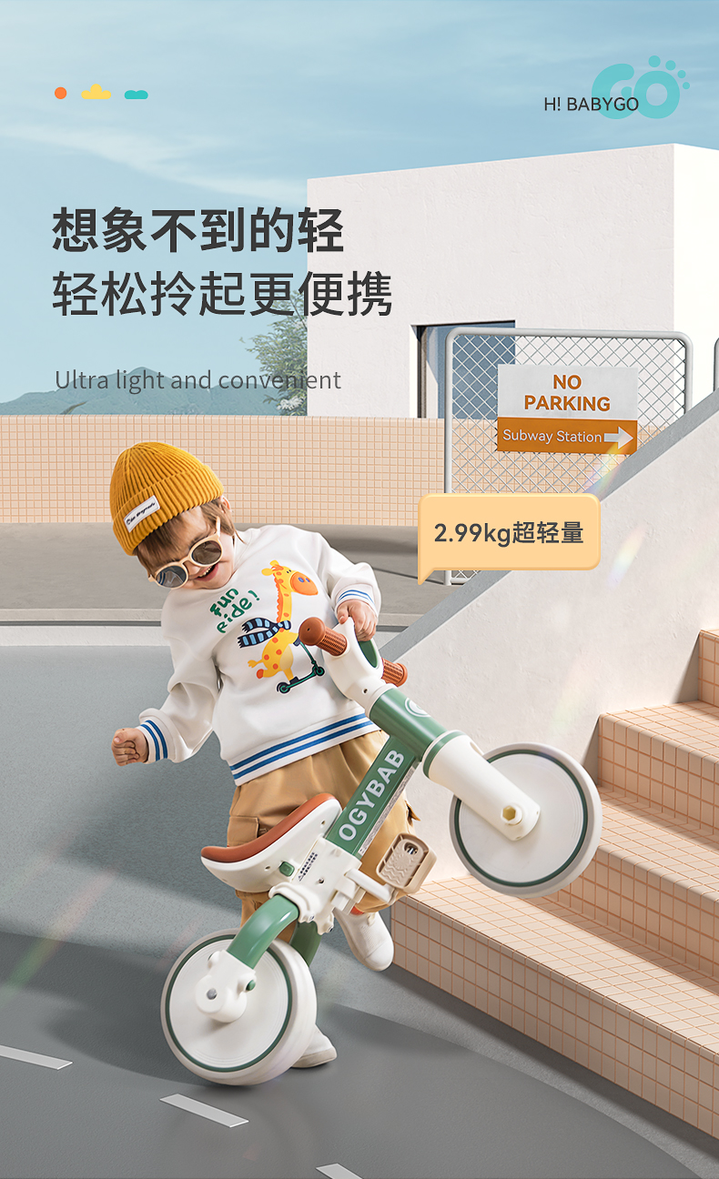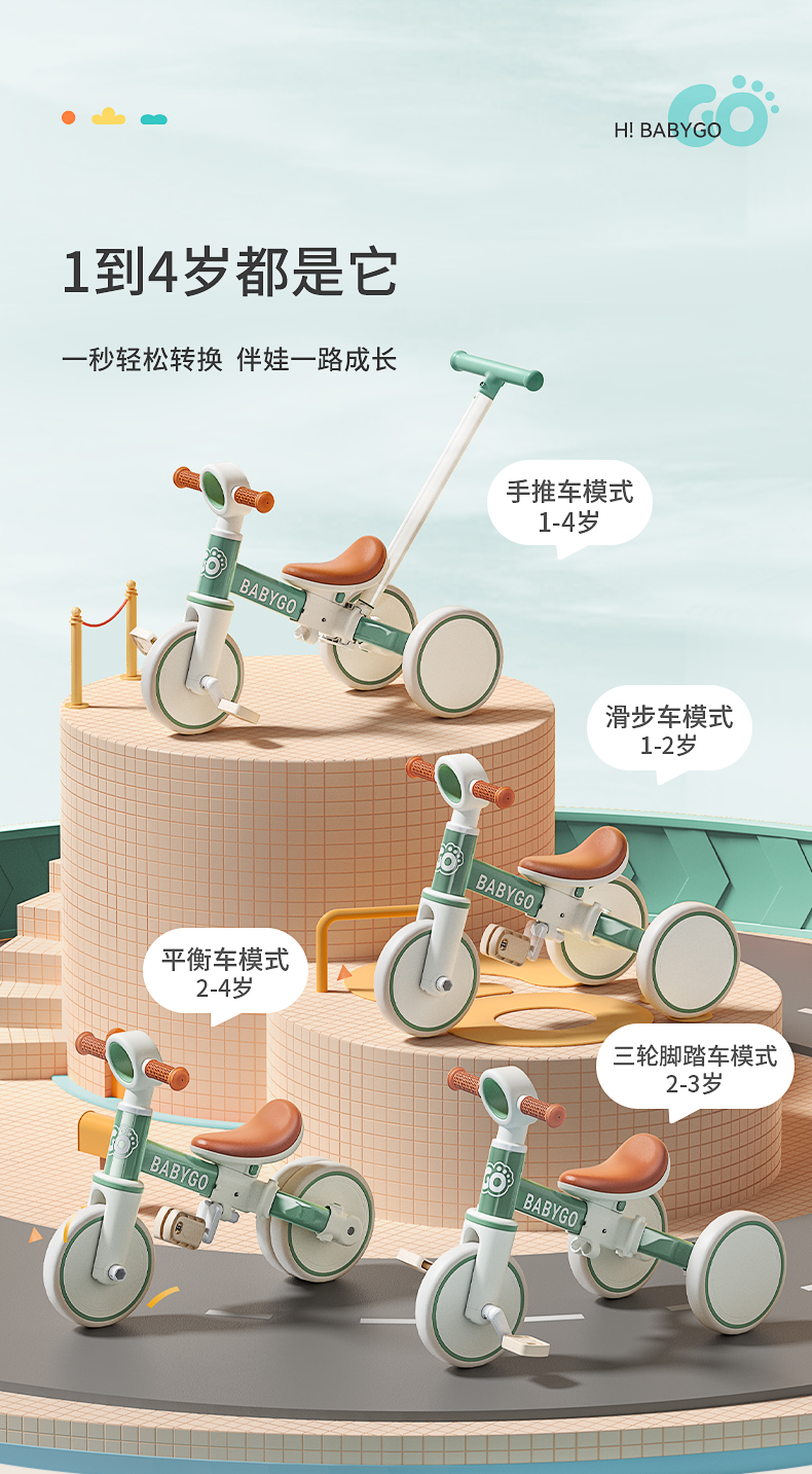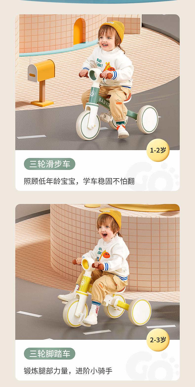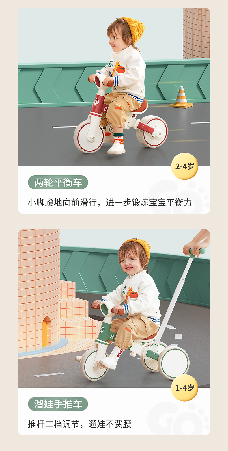 【佳琦力荐 一车三用 高颜值 高承重防侧翻 】babygo儿童三轮车脚踏车遛娃神器多功能轻便自行车宝宝小孩平衡车