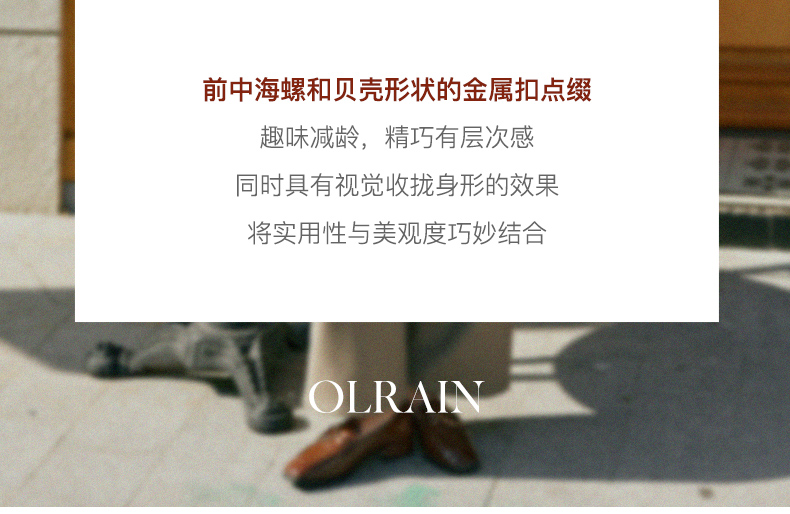 - “精致”是欧芮儿olrain品牌文化的核心,欧芮儿认为,精致的女人,不但要外在动人,更要内在迷人,内外兼修,有魅力、有气质、有内涵,自信而不自傲,优雅而不矫揉,自有万种风情而不轻浮,更不故作矜持。