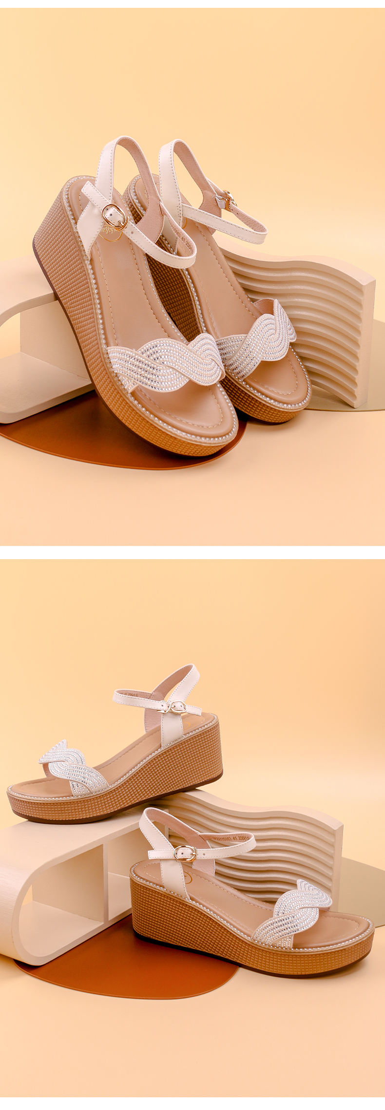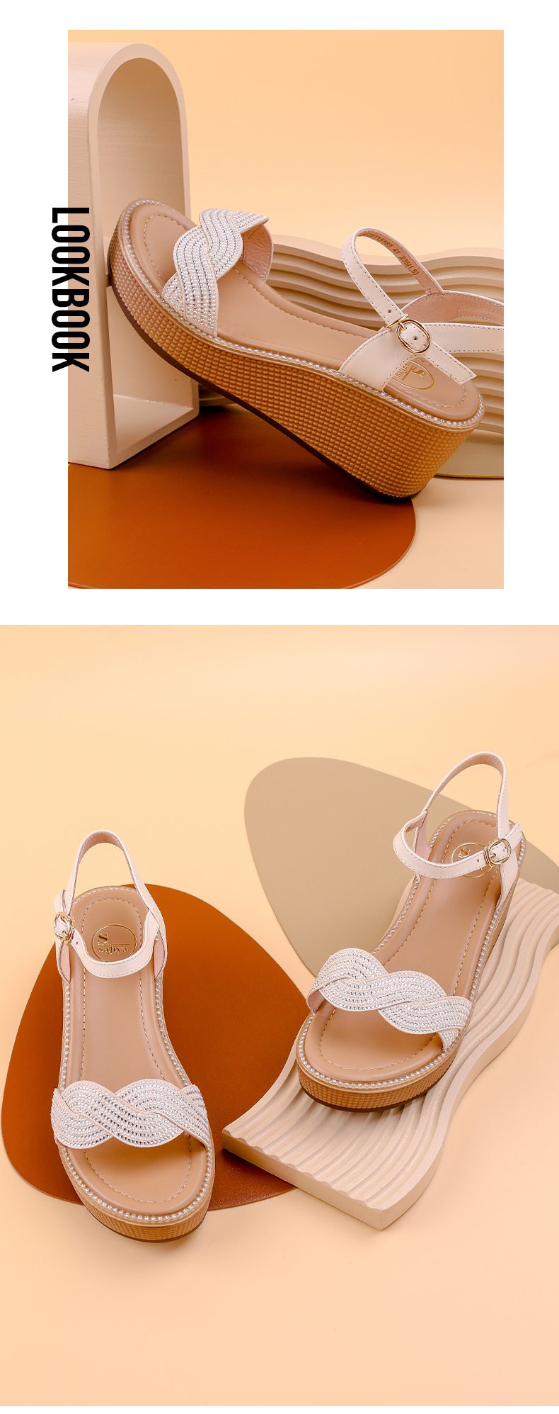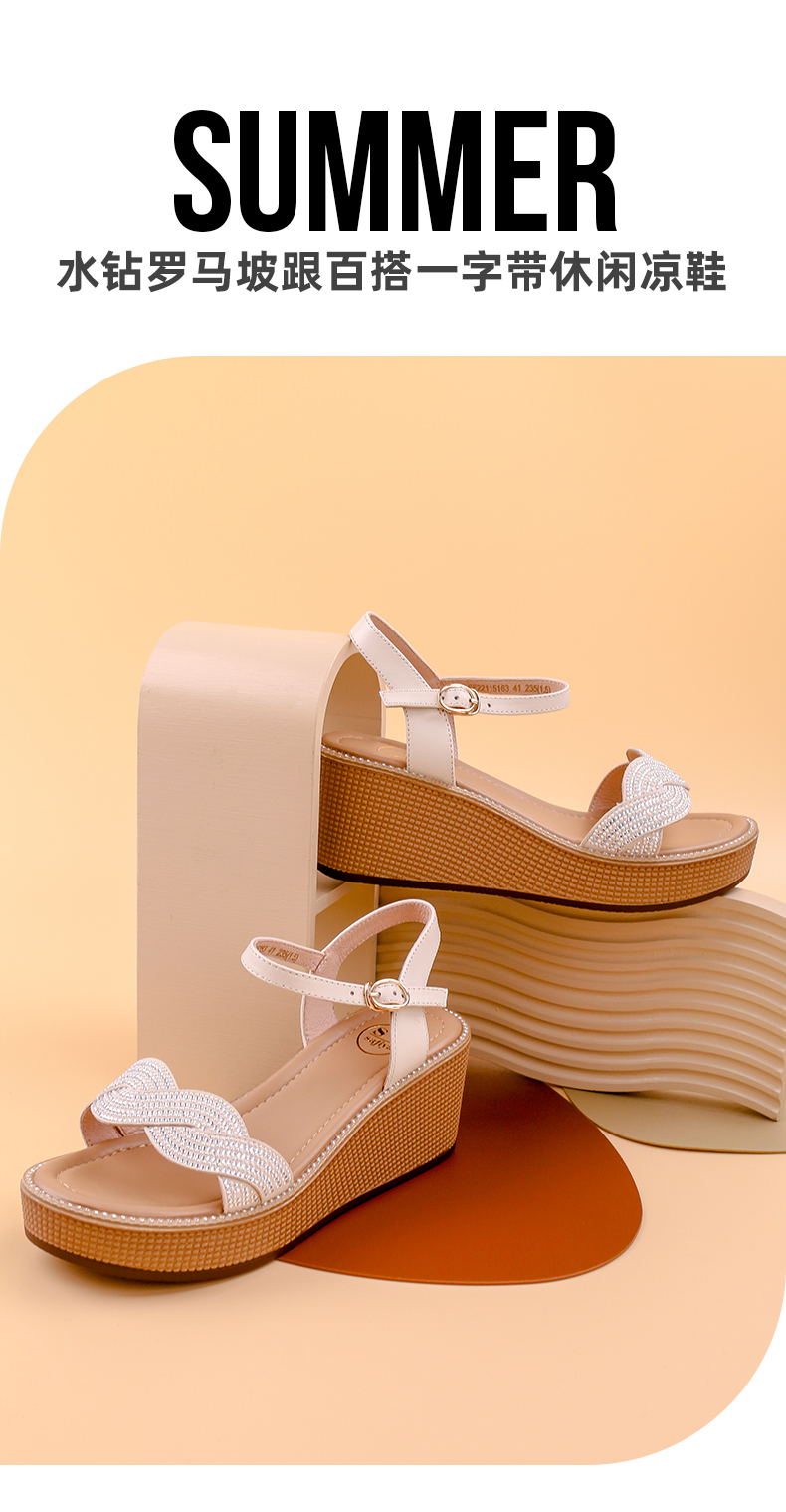 Safiya索菲娅羊皮烫钻罗马坡跟凉鞋2022新款一字带增高凉拖SF22115163