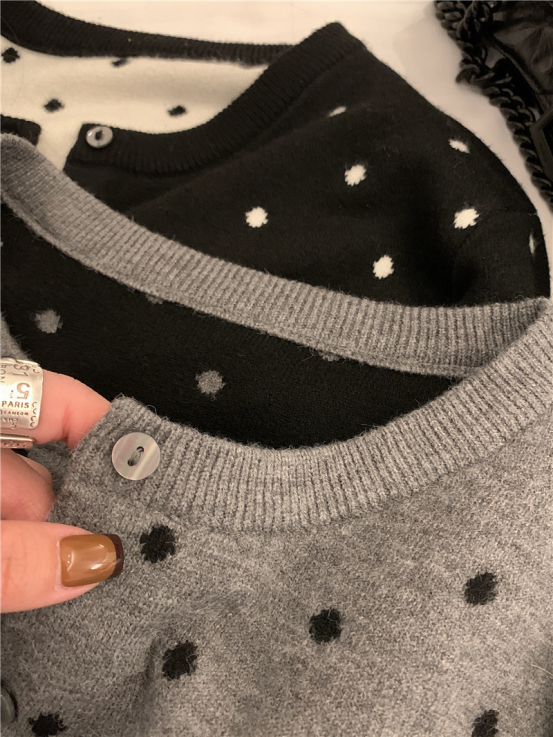 简单又好穿的波点小开衫真的很爱,强烈建议人手一件吧!!! 经典圆领设计,佰搭不挑剔脸型门襟纽扣开合, 穿脱方便简易小宽松版型,身材包容度也刚好不紧绷也不松弛, 显得小巧纤瘦搭配短款设计,主打就是拉腿显高 百搭的灰色,简约韩系风 选用柔软毛织面料,穿着软糯舒适