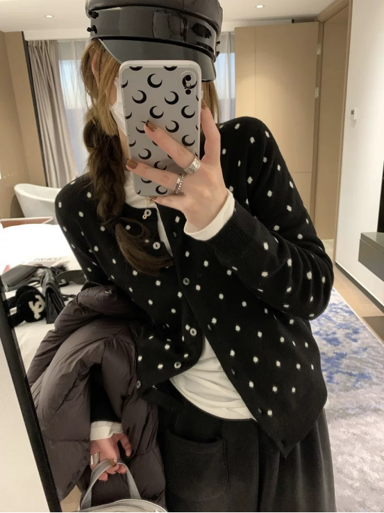 可爱的圆点元素遍布整件开衫, 为其增添了几分俏皮与活泼。 这些圆点分布均匀,大小适中, 既不会显得过于张扬,又能有效地吸引目光。