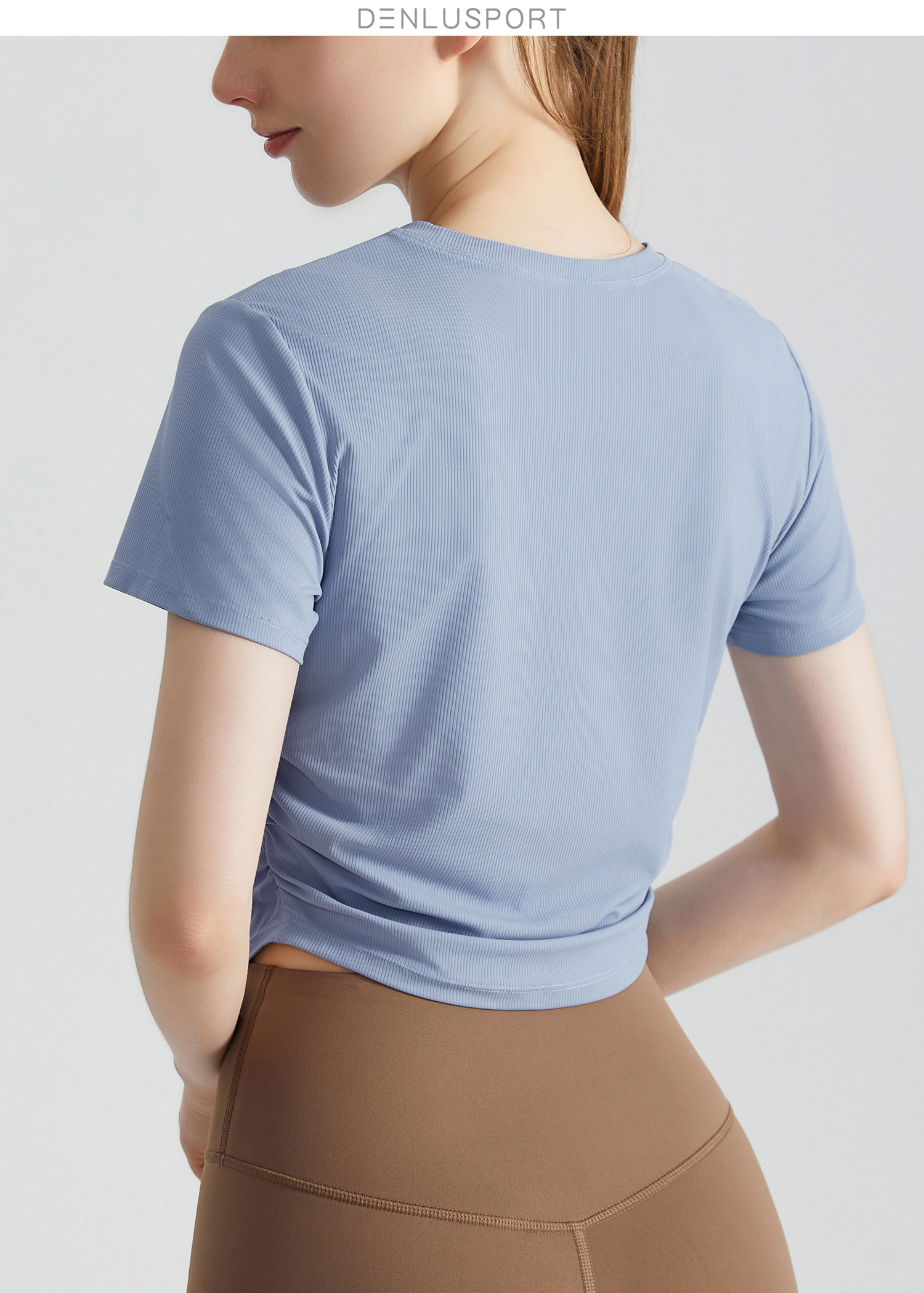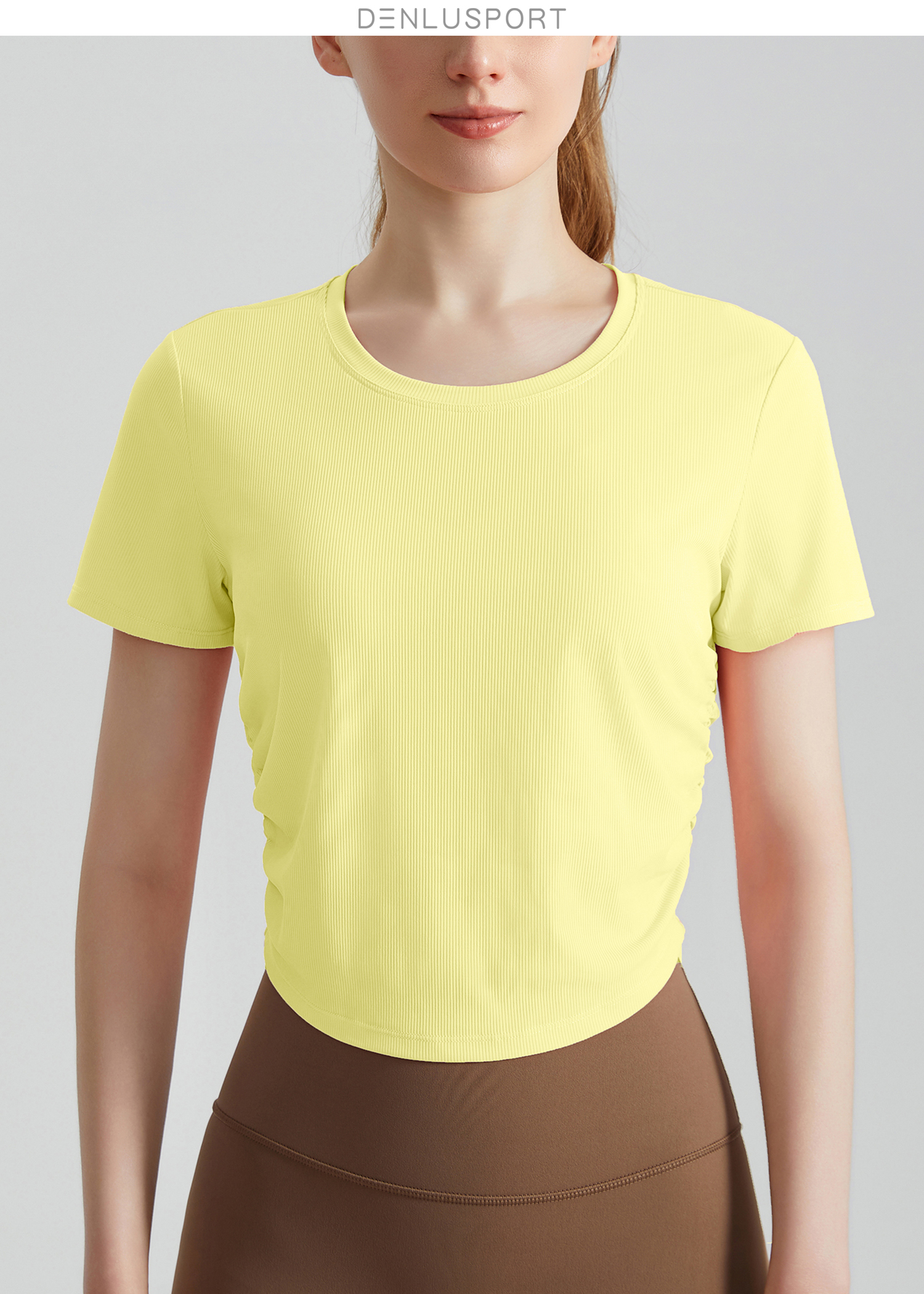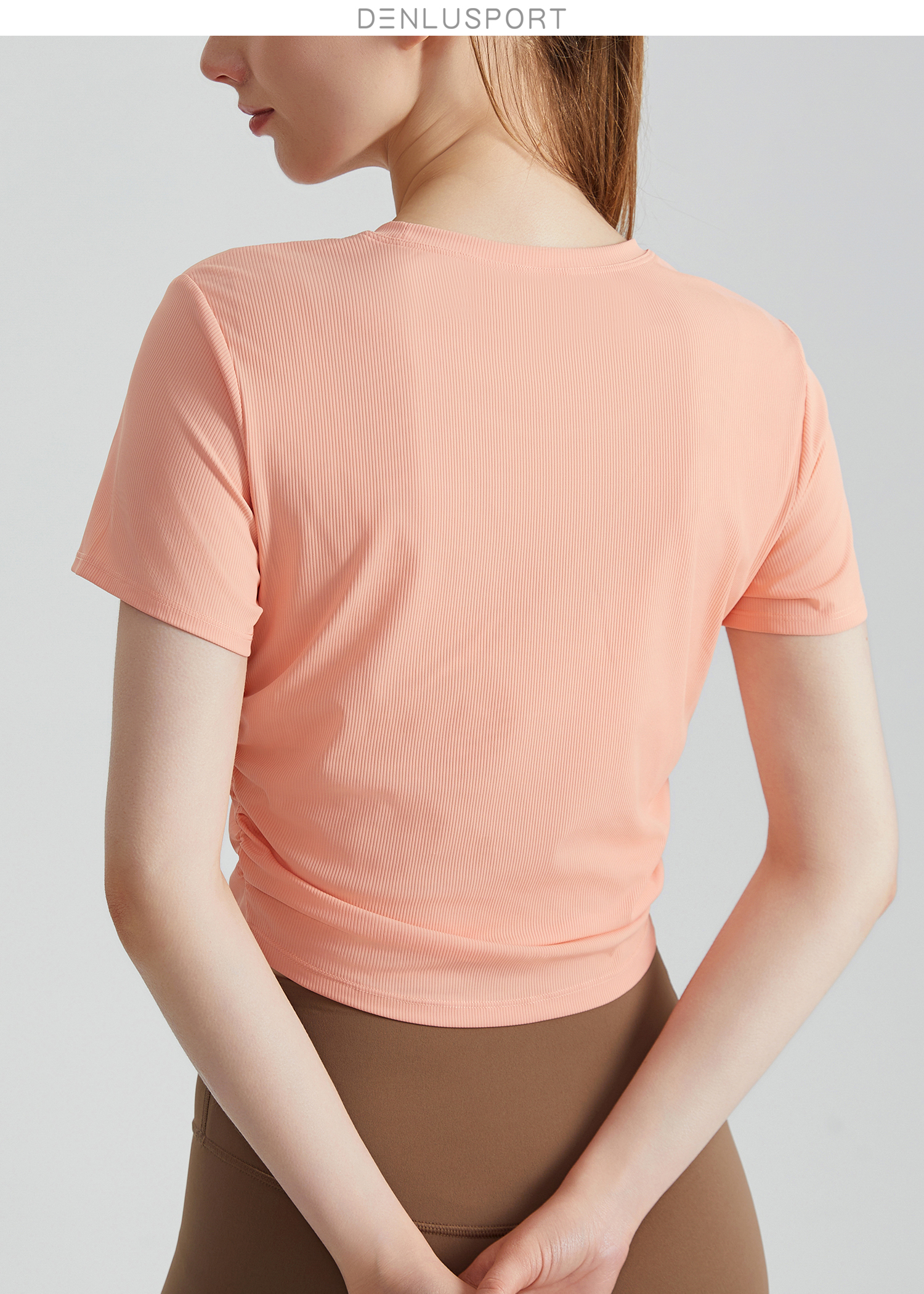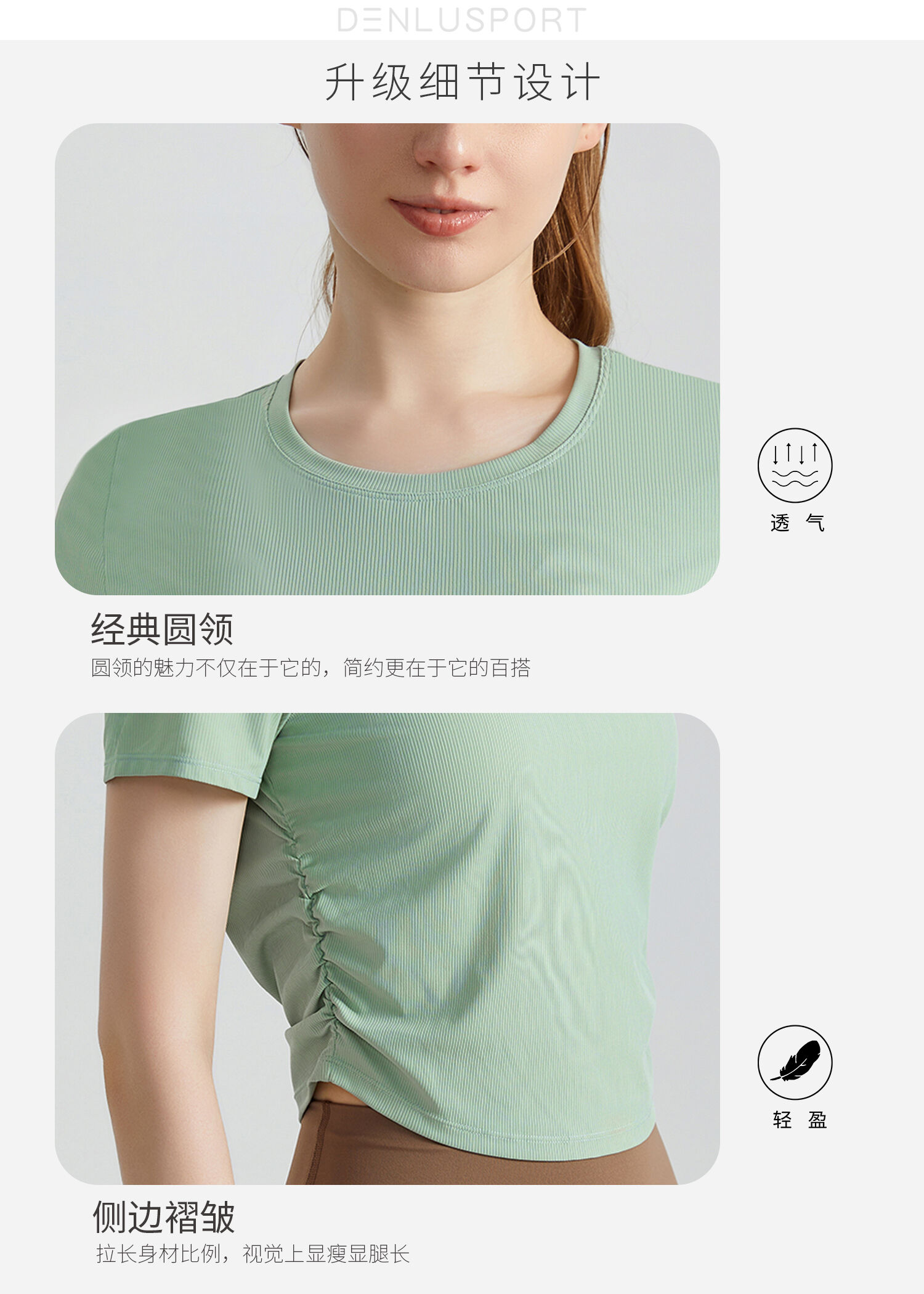 DENLUS速干运动上衣褶皱收腰修身显瘦圆领薄款透气瑜伽短袖健身T恤DY66180