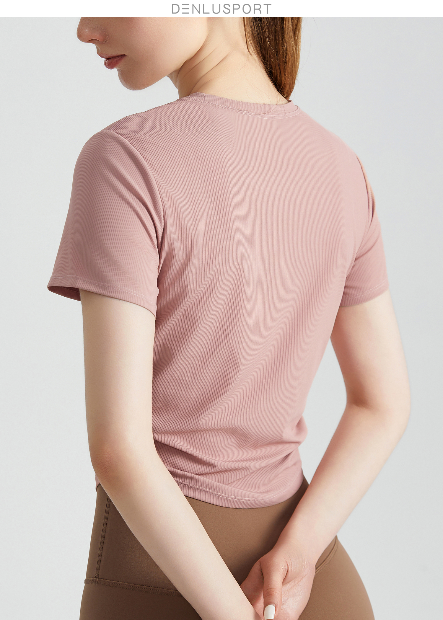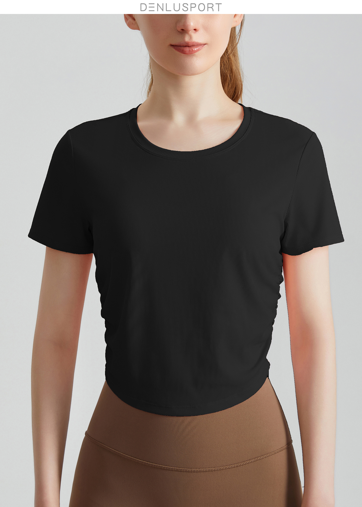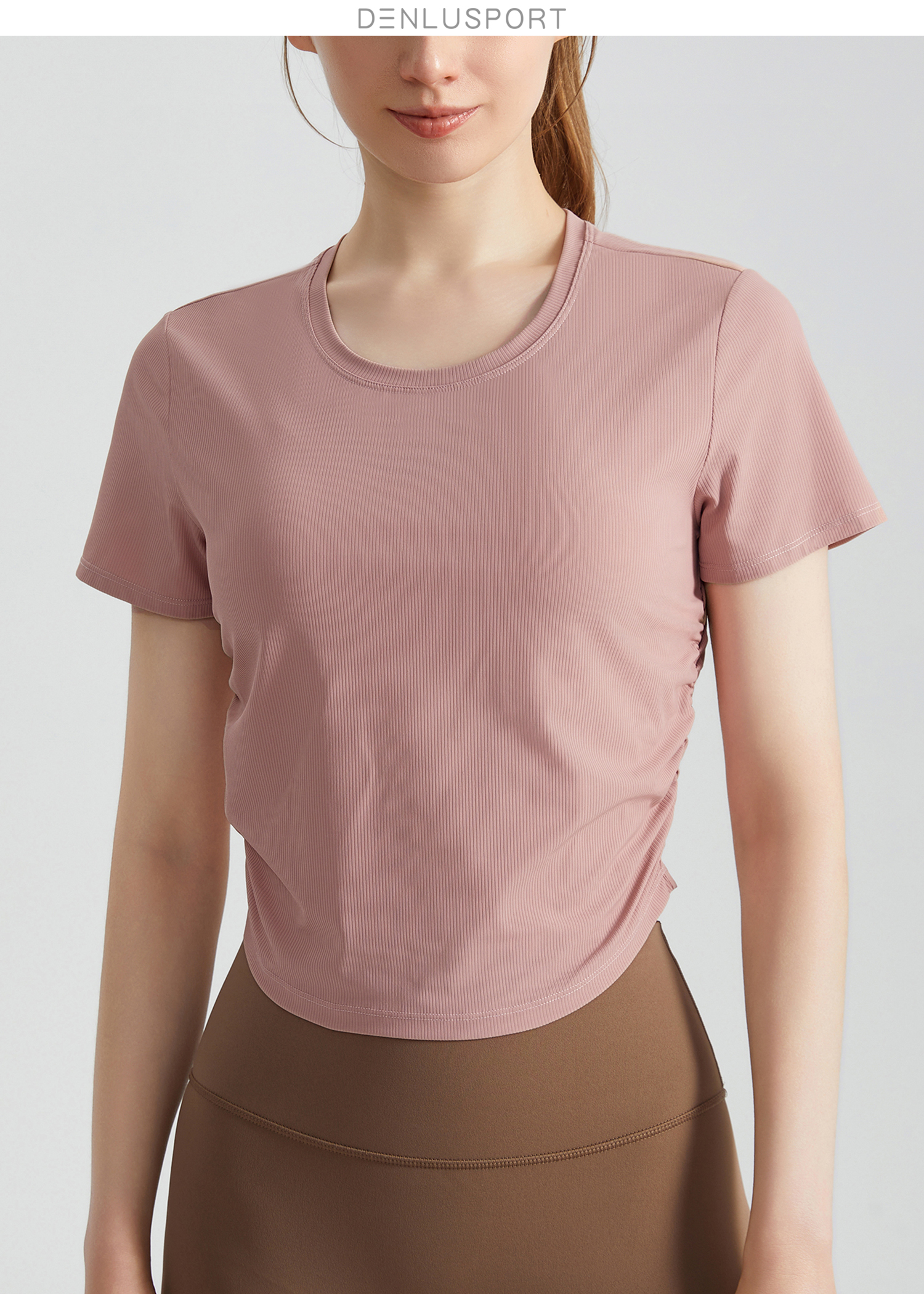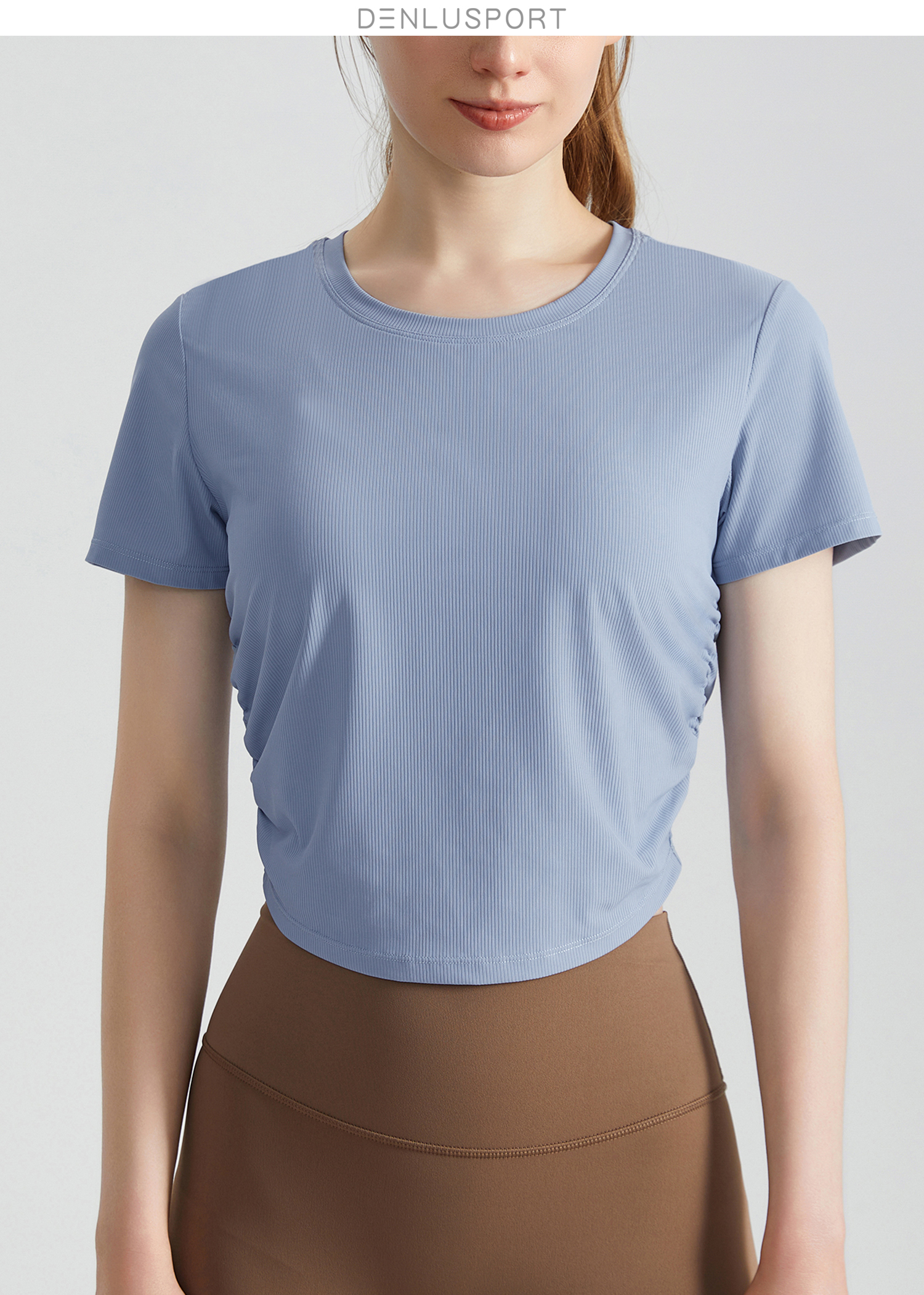 DENLUS速干运动上衣褶皱收腰修身显瘦圆领薄款透气瑜伽短袖健身T恤DY66180