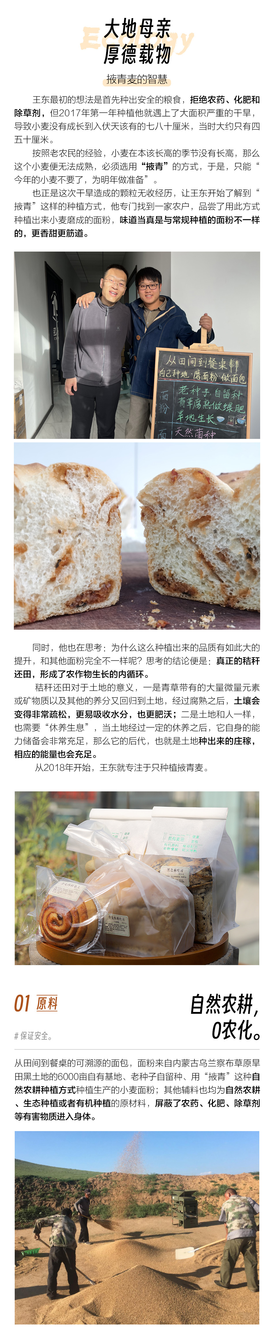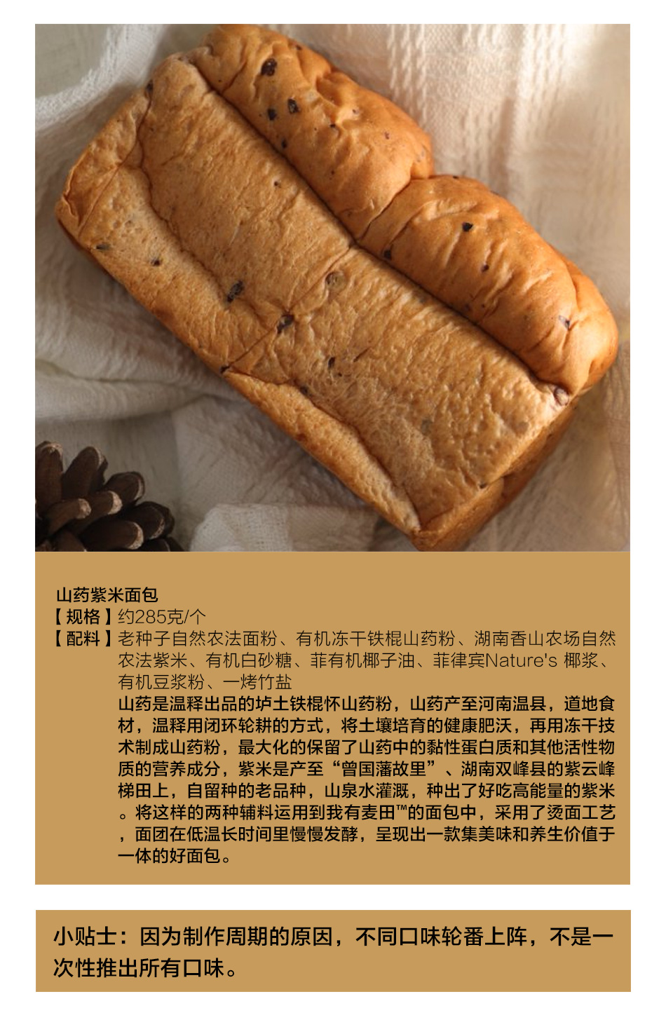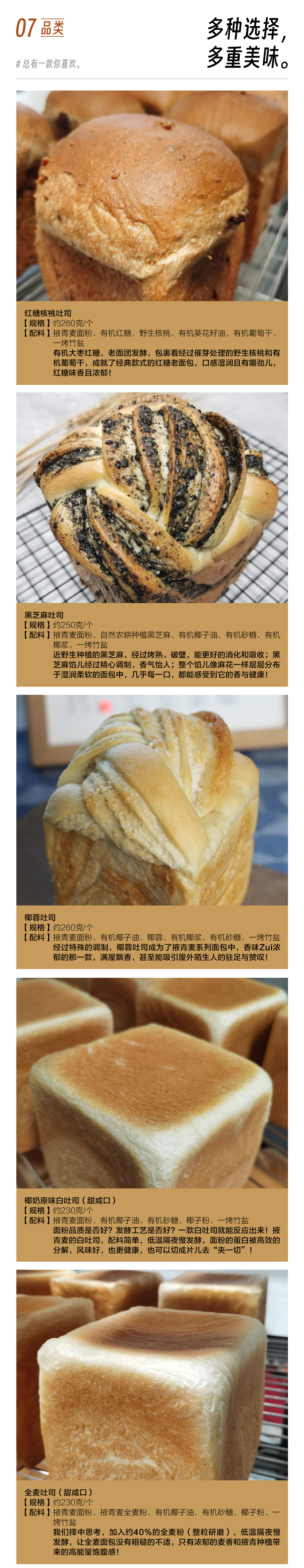 【配料】: 红糖核桃吐司:掖青麦面粉、有机红糖、野生核桃、有机葵花籽油、有机葡萄干、一烤竹盐; 黑芝麻吐司:掖青麦面粉、自然农耕种植黑芝麻、有机椰子油、有机砂糖、有机椰浆、一烤竹盐 椰蓉吐司:掖青麦面粉、有机椰子油、有机椰蓉、有机椰浆、有机砂糖、一烤竹盐; 椰奶原味白吐司(甜咸口):掖青麦面粉、有机椰子油、有机砂糖、有机椰子粉、一烤竹盐; 全麦吐司(甜咸口):掖青麦面粉、掖青麦全麦粉、有机椰子油、有机砂糖、有机椰子粉、一烤竹盐; 生可可小圆包:掖青麦面粉、有机生可可粉、法国巧克力豆、有机可可酱、野生核桃、有机砂糖、一烤竹盐; 全麦核桃吐司(无蔗糖):掖青麦面粉、掖青麦全麦粉、有机葵花籽油、有机椰子油、有机椰子花糖、野生核桃仁、一烤竹盐; 全麦植物肉松面包:掖青麦面粉、掖青麦全麦粉、台湾植物肉松、有机花生酱、有机葵花籽油、有机砂糖、一烤竹盐; 全麦汉堡胚子:掖青麦面粉、掖青麦全麦粉、生态白芝麻、有机椰子油、有机砂糖、一烤竹盐; 植物酸奶面包:掖青麦面粉、自制素酸奶(豆粉、椰浆)、有机葵花籽油、有机椰子油、有机砂糖、一烤竹盐; 红茶甜心面包:掖青麦面粉、伯爵红茶粉、有机椰子油、生态玉米面粉、有机椰奶、有机椰浆、有机砂糖、一烤竹盐; 全麦肉桂卷:掖青麦面粉、掖青麦全麦粉、有机肉桂粉、有机红糖、有机砂糖、有机椰子油、有机葵花籽油、野生蔓越莓干、一烤竹盐; 茯苓香香面包:掖青麦面粉、有机椰子油、有机椰子花糖、野生茯苓粉、一烤竹盐; 黑松露牛肝菌盐卷:掖青麦面粉、有机椰子油、有机葵花籽油、有机砂糖、一烤竹盐、野生黑松露、野生牛肝菌、植物基黄油(乳木果油、椰子油、椰子粉); 纯全麦五仁桃酥:掖青麦全麦粉、有机葵花籽油、有机砂糖、生态花生、生态南瓜子、生态白芝麻、野生松子仁、野生核桃仁、食用碳酸氢钠(小苏打)、食用碳酸氢铵; 山药紫米面包:老种子自然农法面粉、有机冻干铁棍山药粉、湖南香山农场自然农法紫米、有机白砂糖、有机椰子油、椰浆、有机豆浆粉、一烤竹盐 【生产日期】:见喷码处 【保质期】:夏季5天,春、秋、冬季7天;冷冻30天 【生产地址】:北京市昌平区百善镇吕各庄村 【储藏方式】:常温或冷藏(夏季入伏后可以冷藏,其他时候常温即可)保存,短时间吃不完可以冷冻保存,再吃之前自然解冻至常温