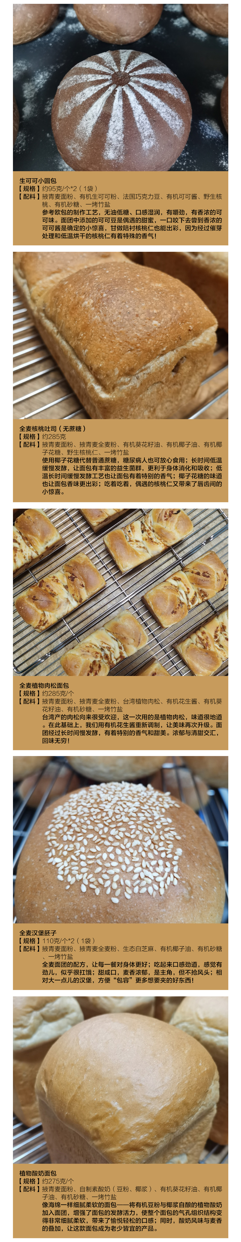 【新农人】:王东 【规格】: 红糖核桃吐司:约260克/个 黑芝麻吐司:约250克/个 椰蓉吐司:约260克/个 椰奶原味白吐司(甜咸口):约230克/个 全麦吐司(甜咸口):约230克/个 生可可小圆包:约95克/个*2(1袋) 全麦核桃吐司(无蔗糖):约285克/个 全麦植物肉松面包:约285克/个 全麦汉堡胚子:约110克/个*2(1袋) 植物酸奶面包:约275克/个 红茶甜心面包:约300克/个 全麦肉桂卷:约115克/个*2(1袋) 茯苓香香面包:约275克/个 黑松露牛肝菌盐卷:约100克/个 纯全麦五仁桃酥:约235克/盒(6块) 山药紫米面吧:约285g/个