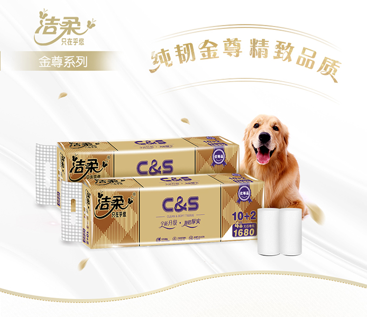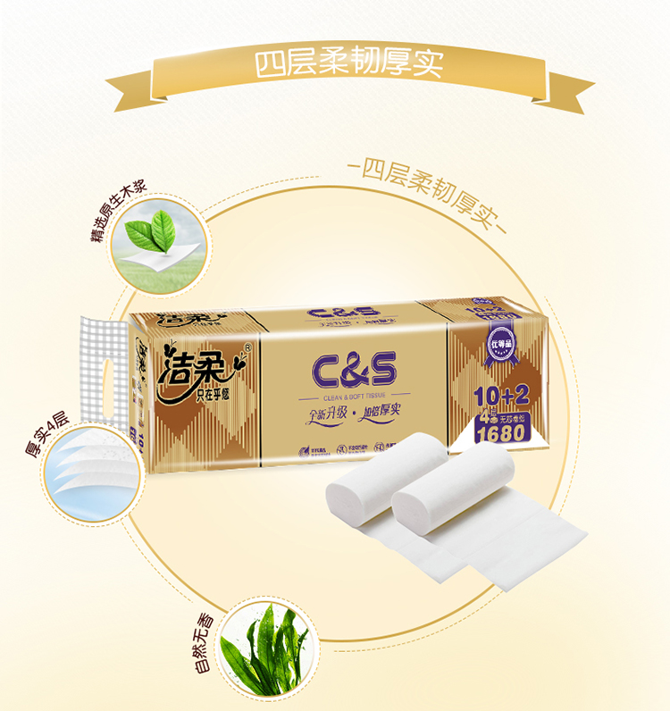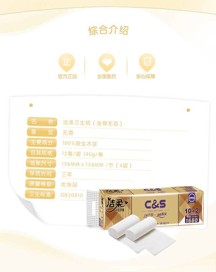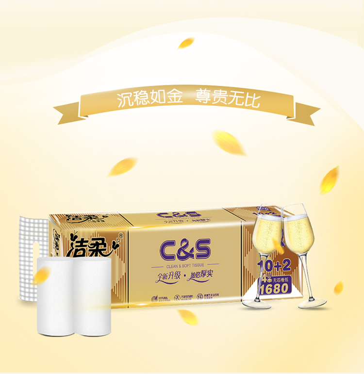 洁柔(C&S)无芯卷纸 加厚4层140克卫生纸*12卷 (大气如金 尊贵享受实芯卷纸)冲厕易溶解 新老包装交替发货