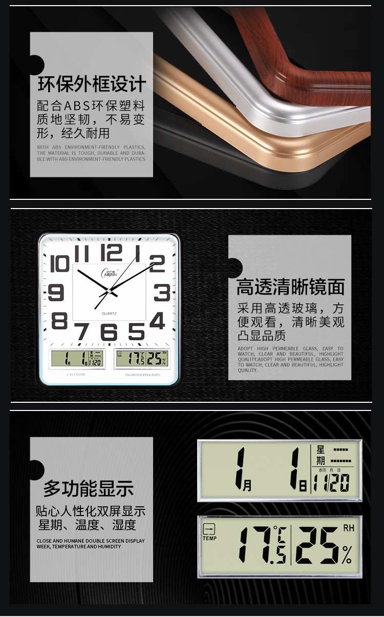 康巴丝(Compas)挂钟16英寸万年历温湿度钟表创意客厅静音时钟简约挂表方形日历石英钟C2983黑白