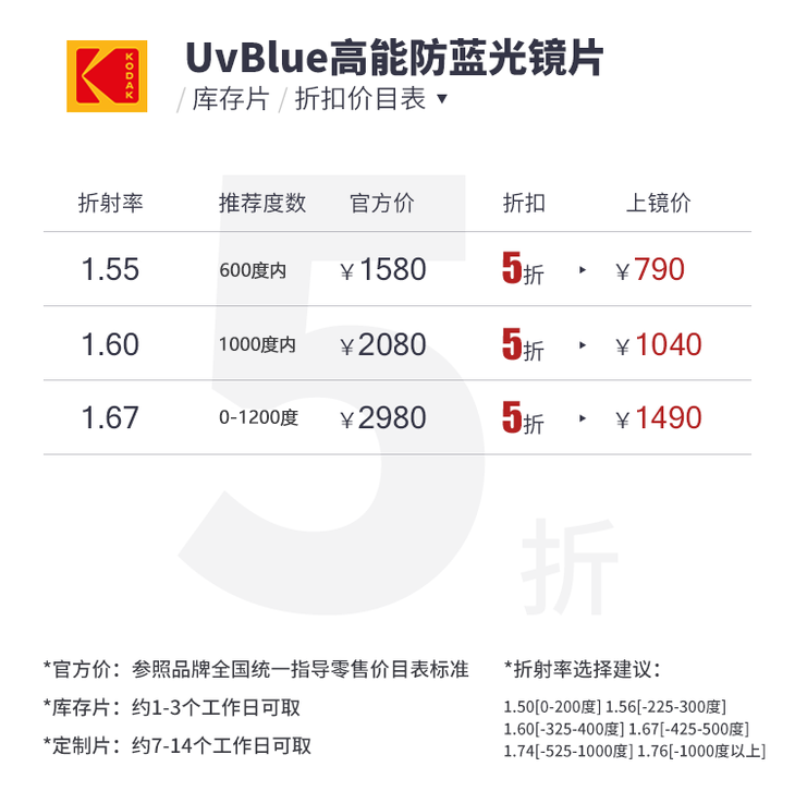 美国 Kodak柯达「 UVBlue 」高能蓝光防护镜片 库存