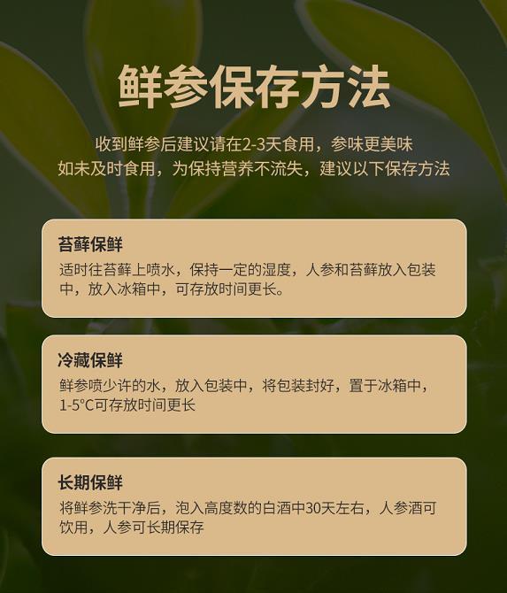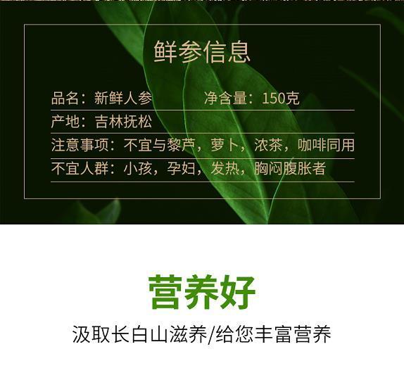 【产品规格】鲜人参150g(5-6支);鲜人参150g(3支);鲜人参150g(2支);鲜人参200g(2支)礼盒装