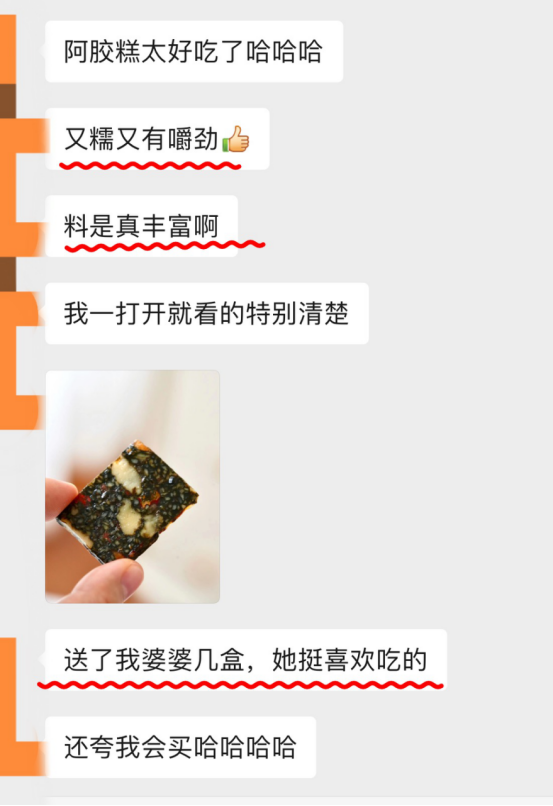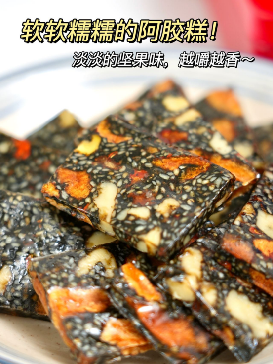 阿胶对女人来讲是刚需的润物无声型滋补品 可以买回去和长辈、妈妈、奶奶一起吃啊~ 完全不会踩雷!做好的、切好的、即食的 一口下去满满的芝麻香味😋😋 核桃红枣大块,甜丝丝~又糯又香,越嚼越香浓!