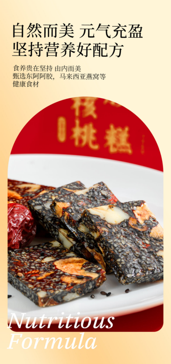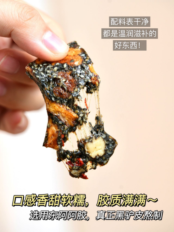 小口细细咀嚼,阿胶胶原蛋白弹弹的口感里 能吃得到香脆脆的核桃黑芝麻~ 还有枸杞红枣的甘甜味儿😋😋 每一口都能尝到不同的原料, 口感丰富,咀嚼间碰撞出不同的原料醇香