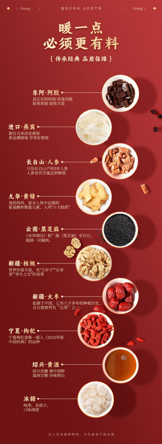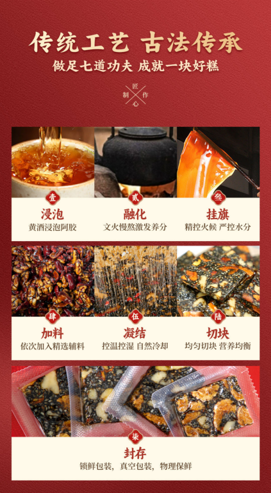 这个阿胶糕的配方都是从老祖宗那改进的 所用的食材也是代代筛选、总结、创新 精选正宗东阿阿胶、马来西亚燕窝、5年人参…… 食药同源相辅相成,补血养颜的效果太牛了❗