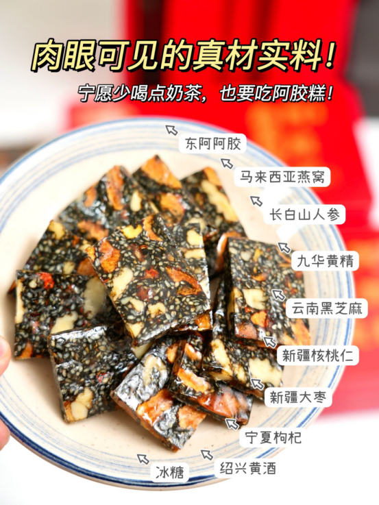 一块阿胶糕,除了用整张驴皮熬制 还聚齐全球各地食养熬制小小一块,营养满满,吃起来特别香~ ✅马来西亚🇲🇾燕窝 ✅长白山种植5年人参 ✅安徽九华黄精 ✅云南黑芝麻 ✅新疆红枣、核桃仁 ✅宁夏枸杞 ✅绍兴黄酒 ✅河北冰糖