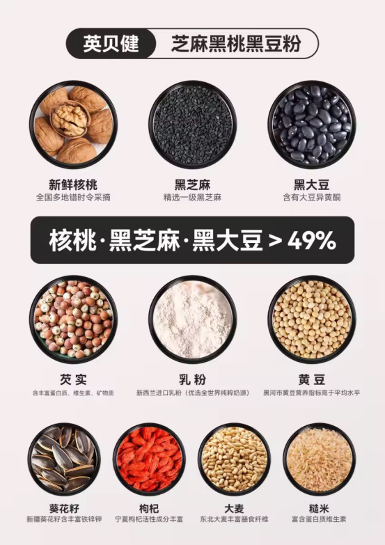 英贝健精挑颗粒饱满的五谷杂粮,真材实料,添加量非常高好原料带来加倍的好效果‼ 25%乌发养颜圣品黑豆 12%八谷之冠黑芝麻 12%补脑之“王”核桃