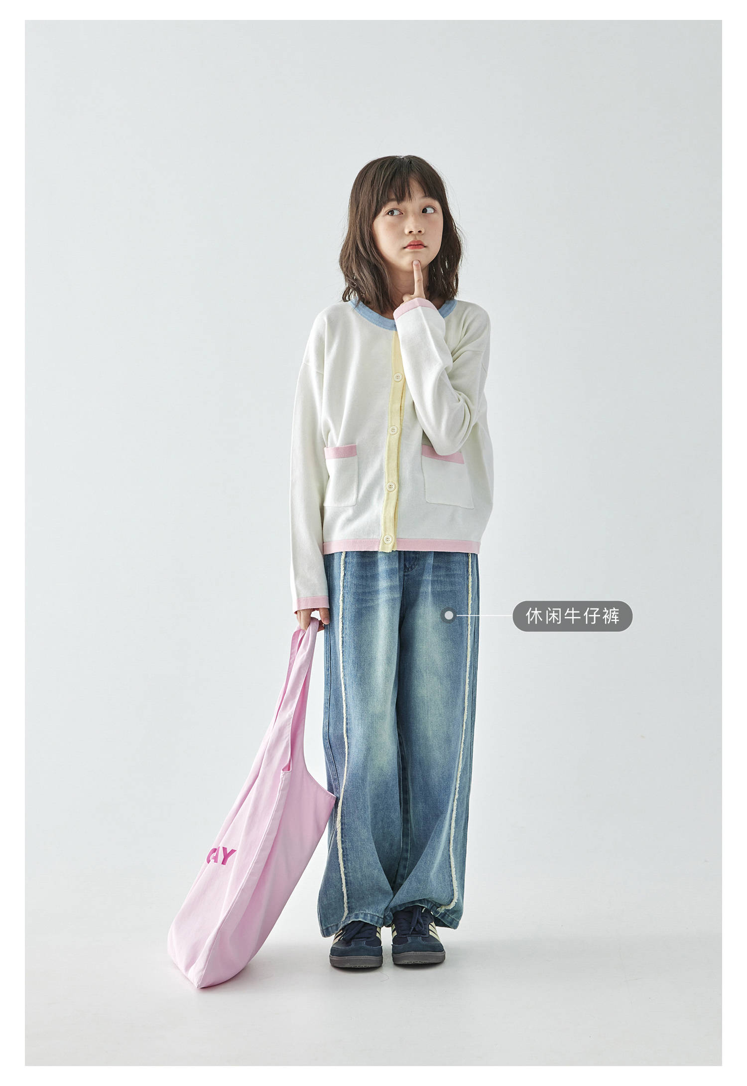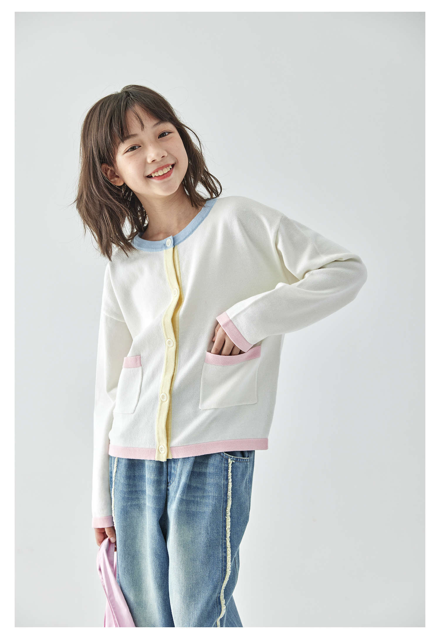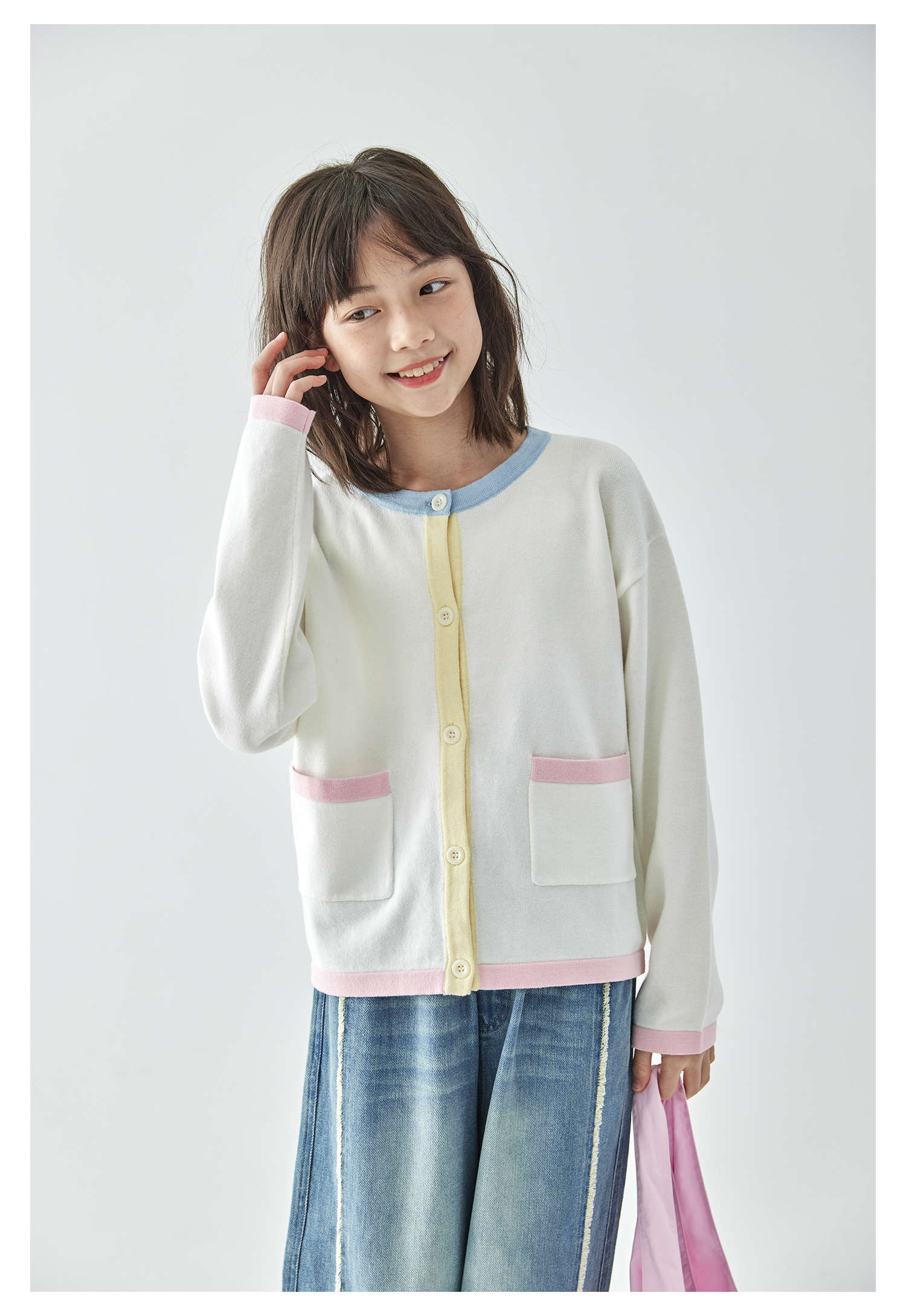 棵初25年春季新款女童彩色撞色拼接感针织开衫小巧口袋单排扣上衣