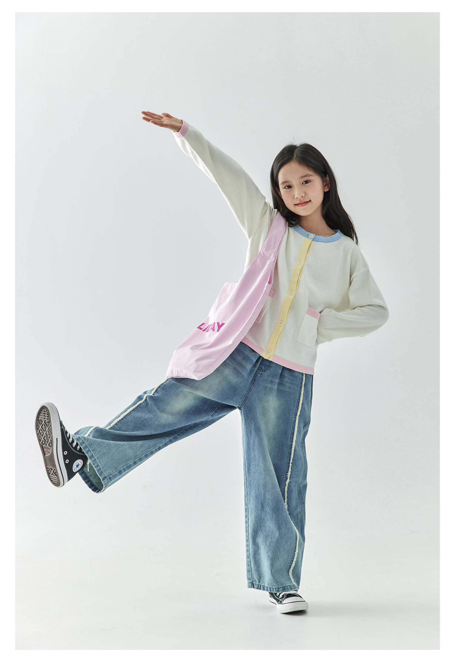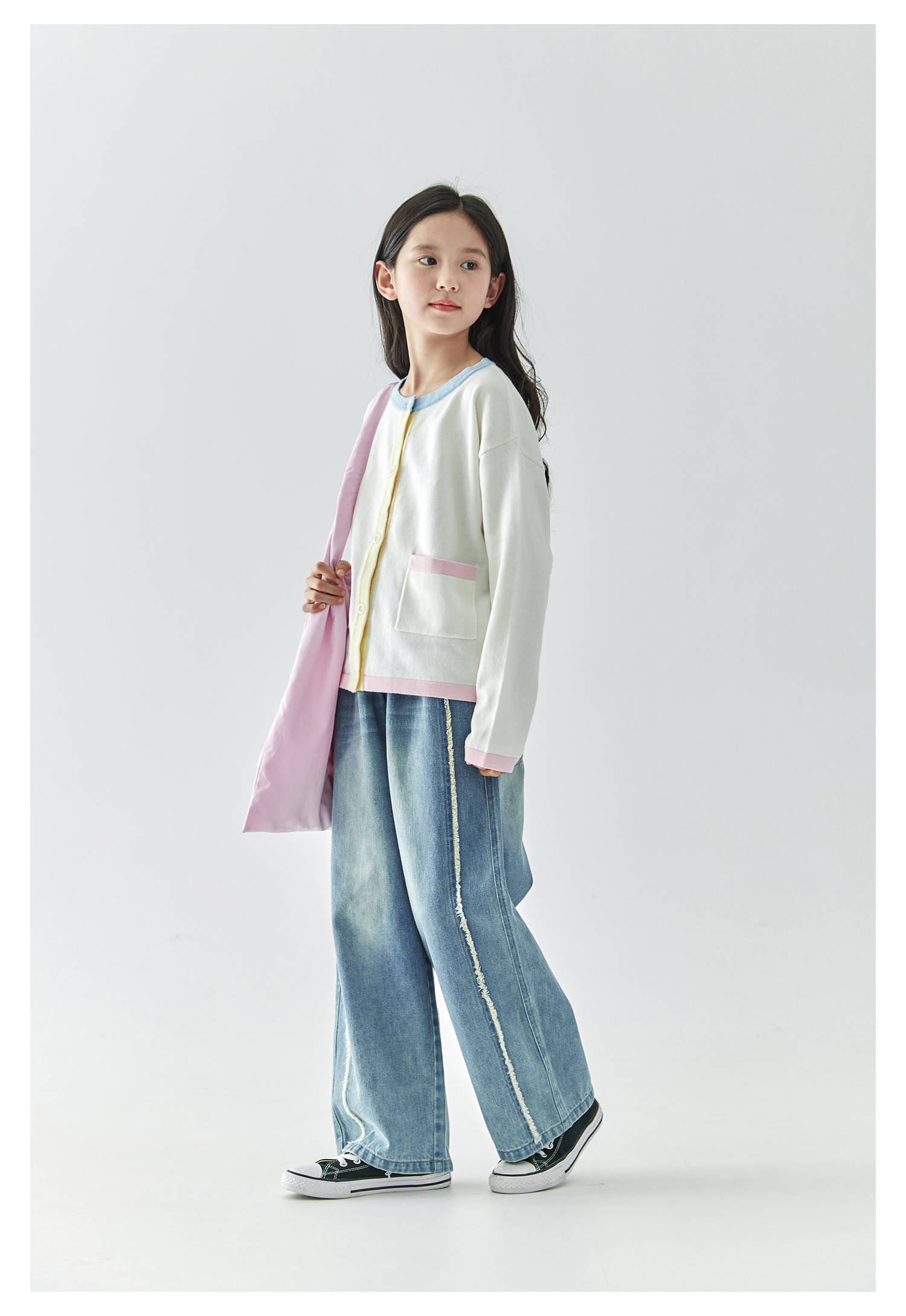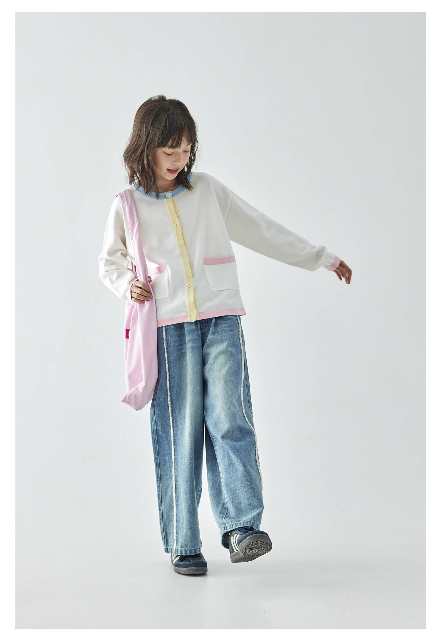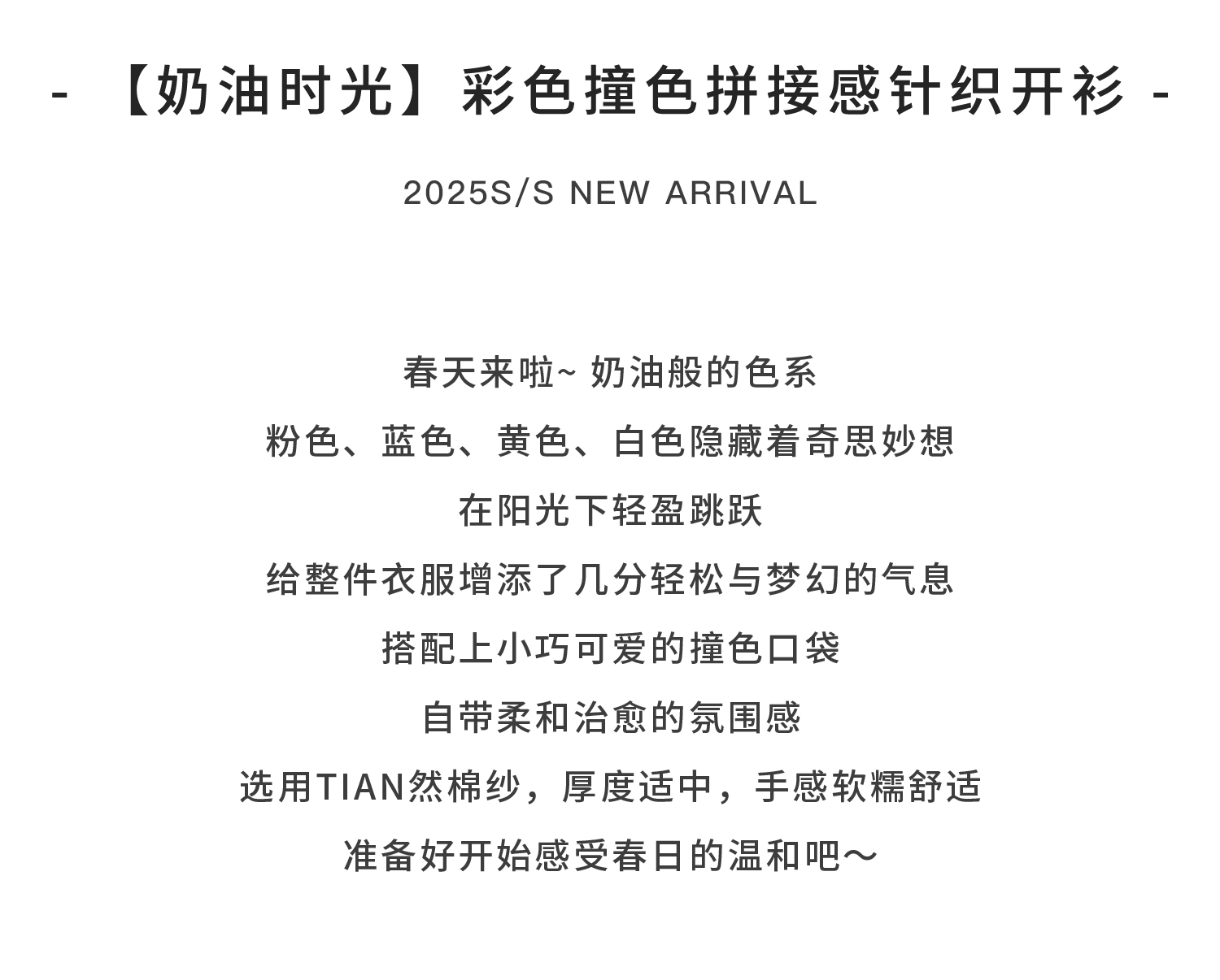 棵初25年春季新款女童彩色撞色拼接感针织开衫小巧口袋单排扣上衣