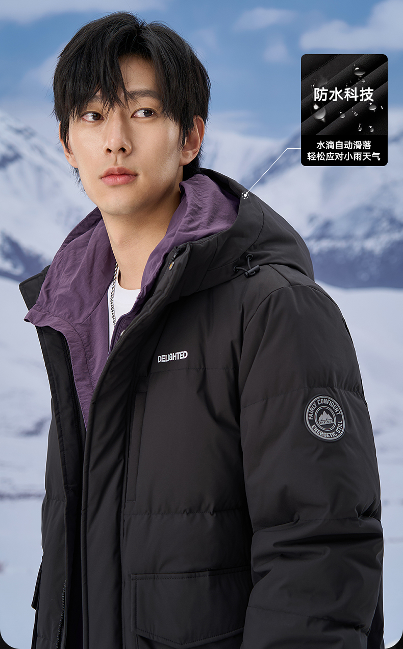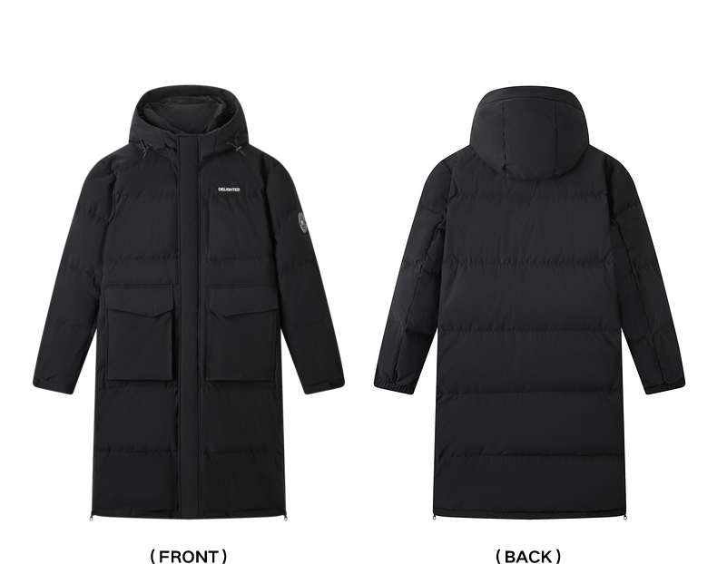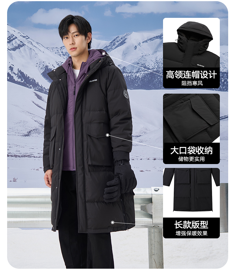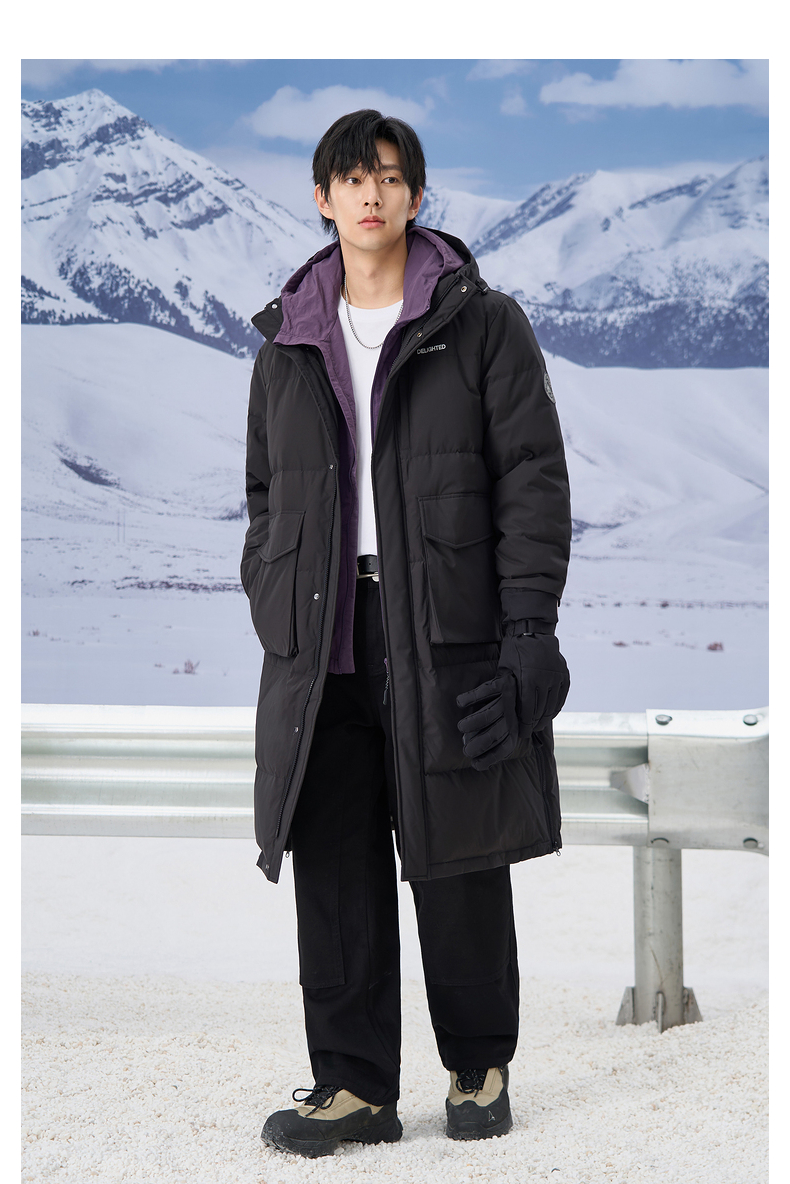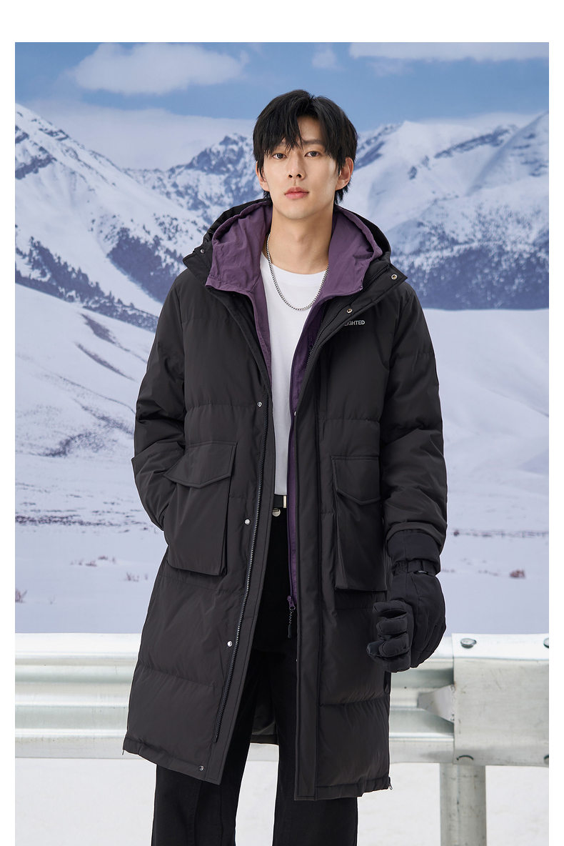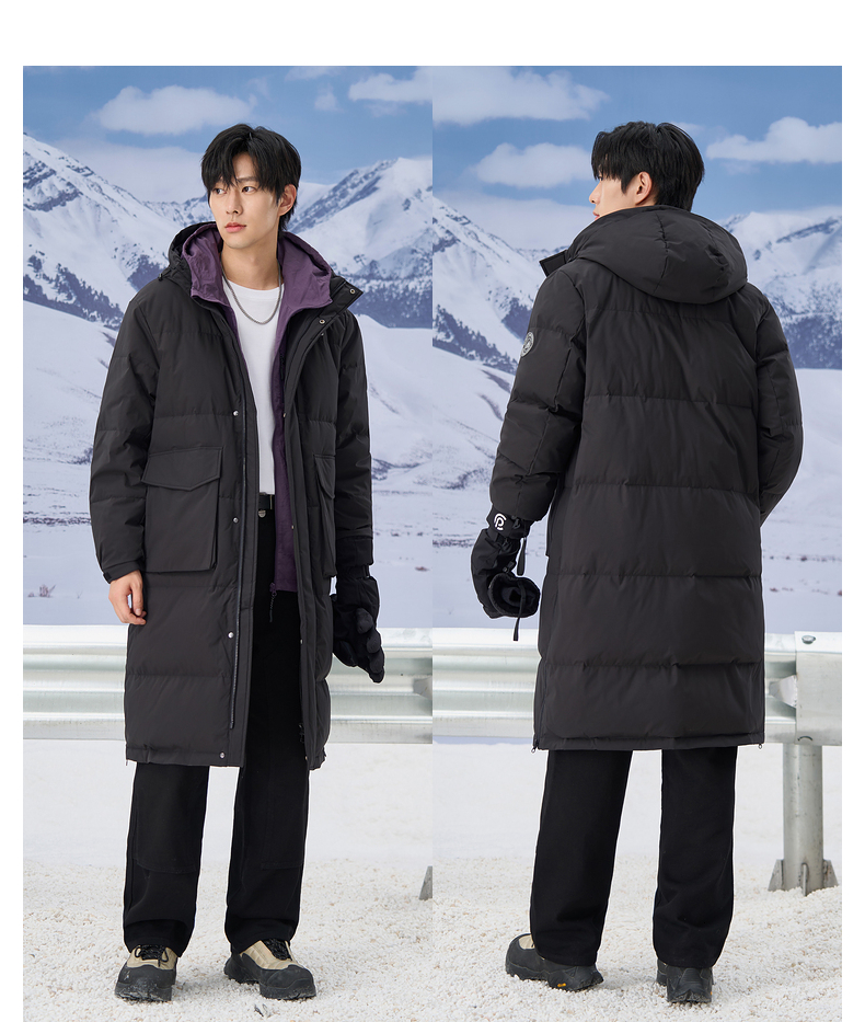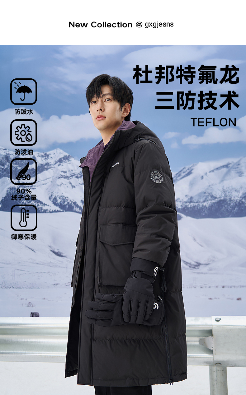 gxgjeans男装2024年冬季热卖黑色加厚过膝保暖长款连帽羽绒服男