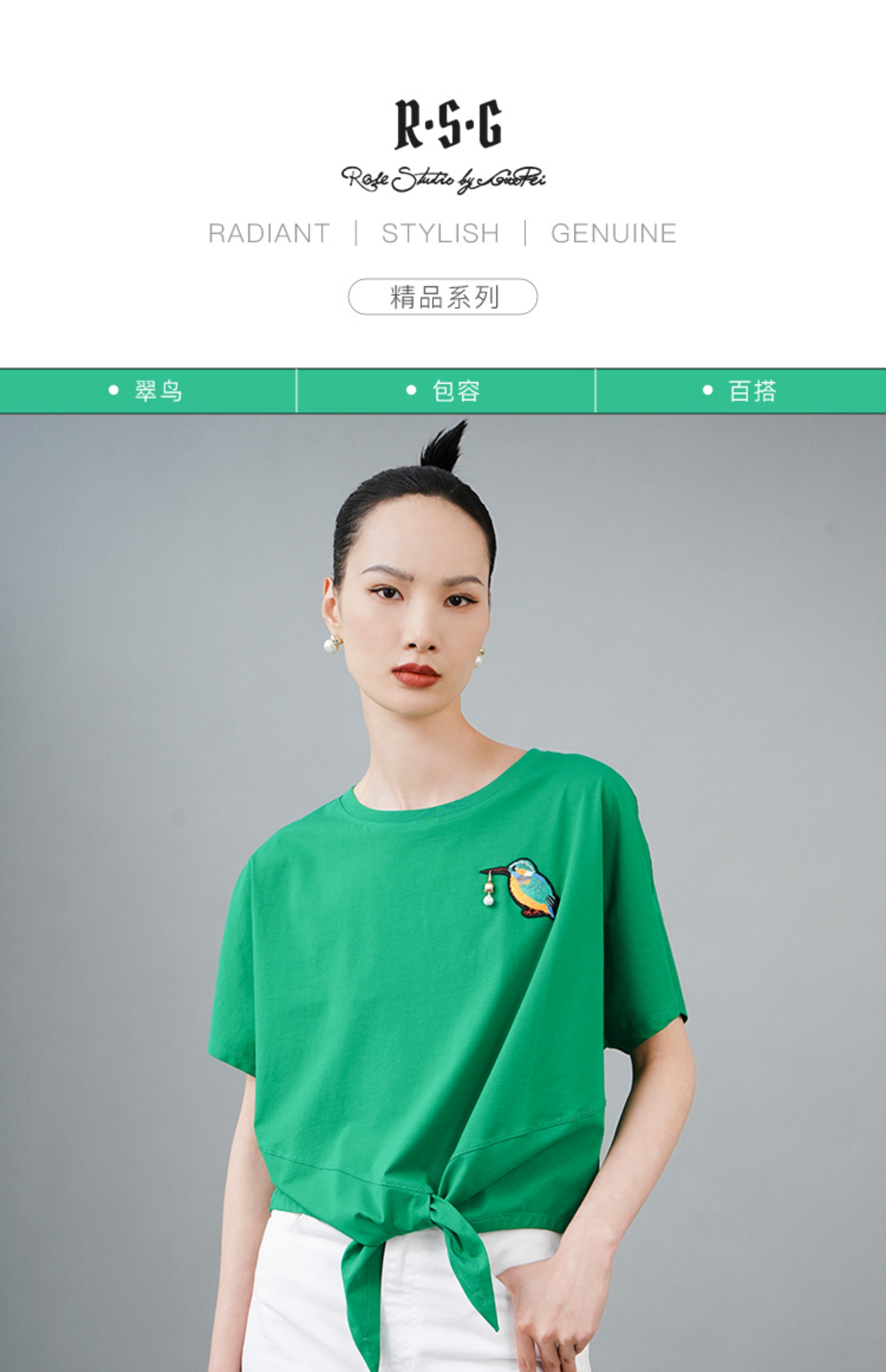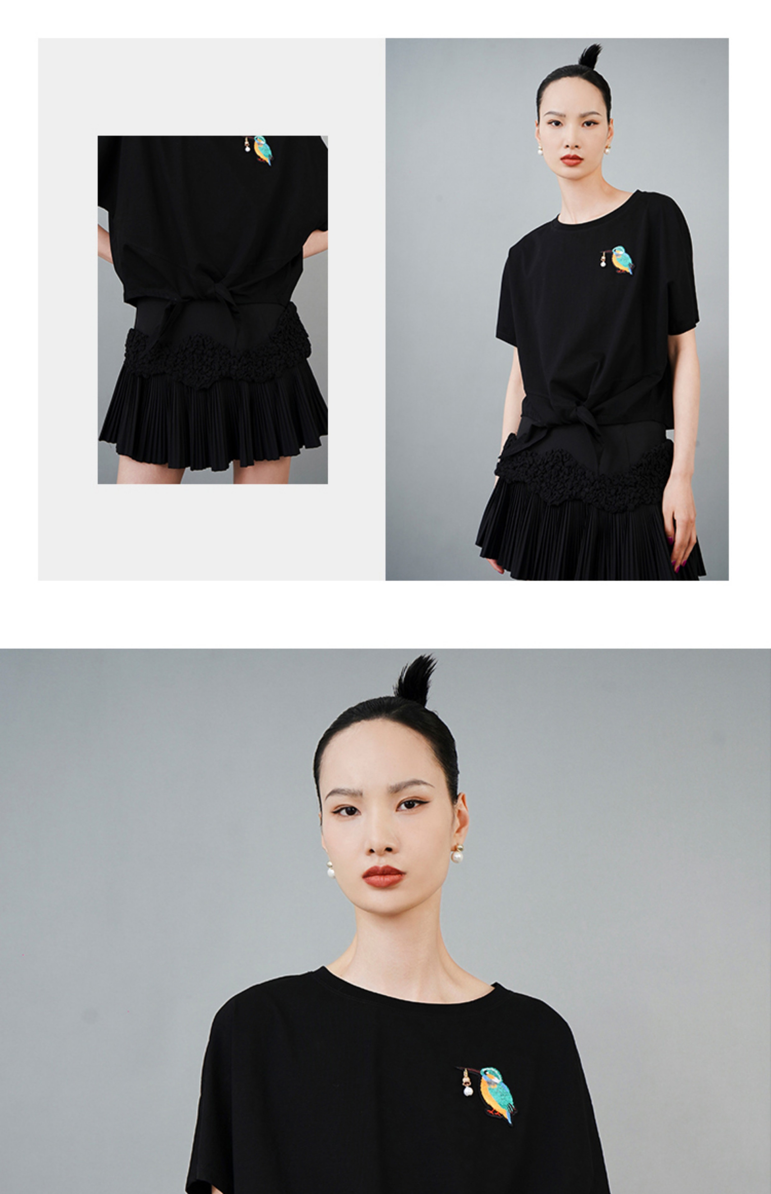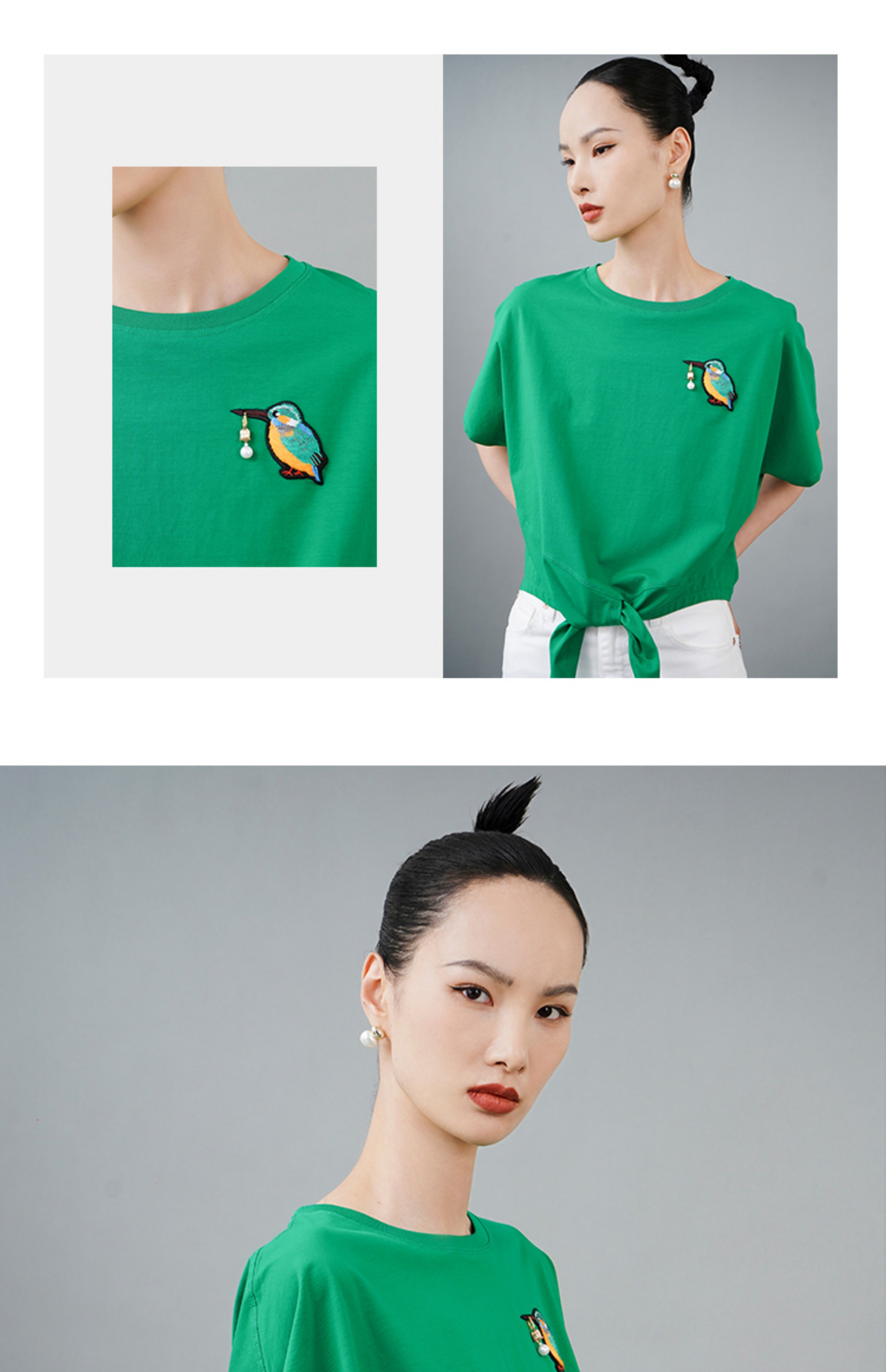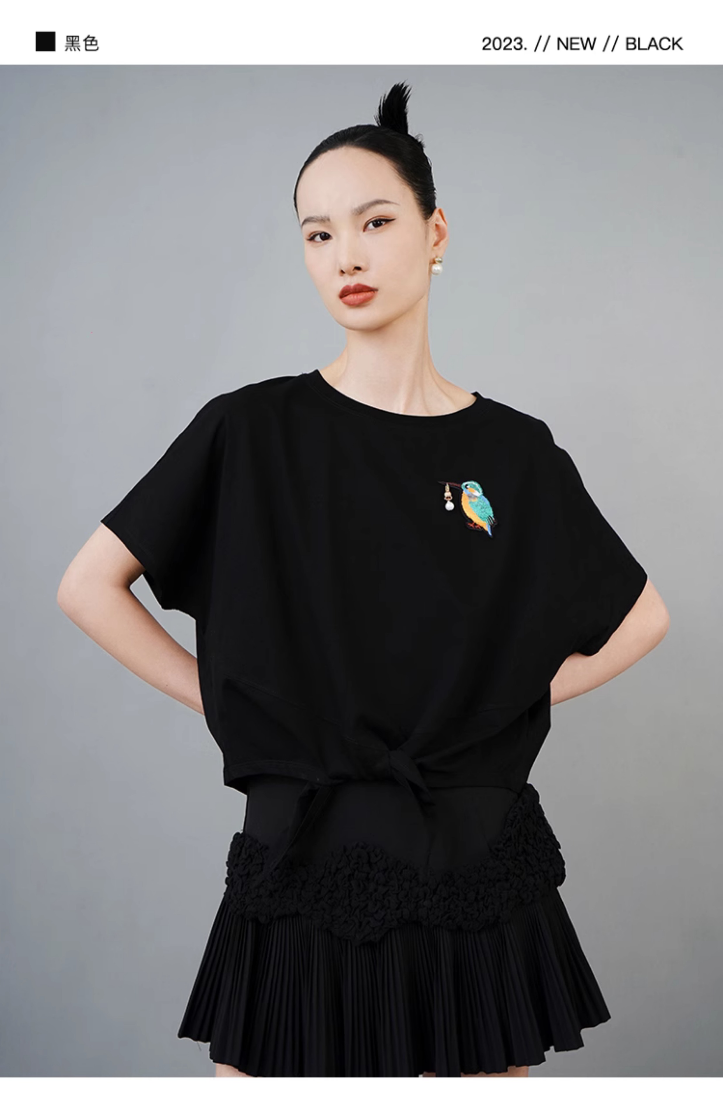 RSG郭培成衣品牌国风翠鸟刺绣下摆打结宽松T恤