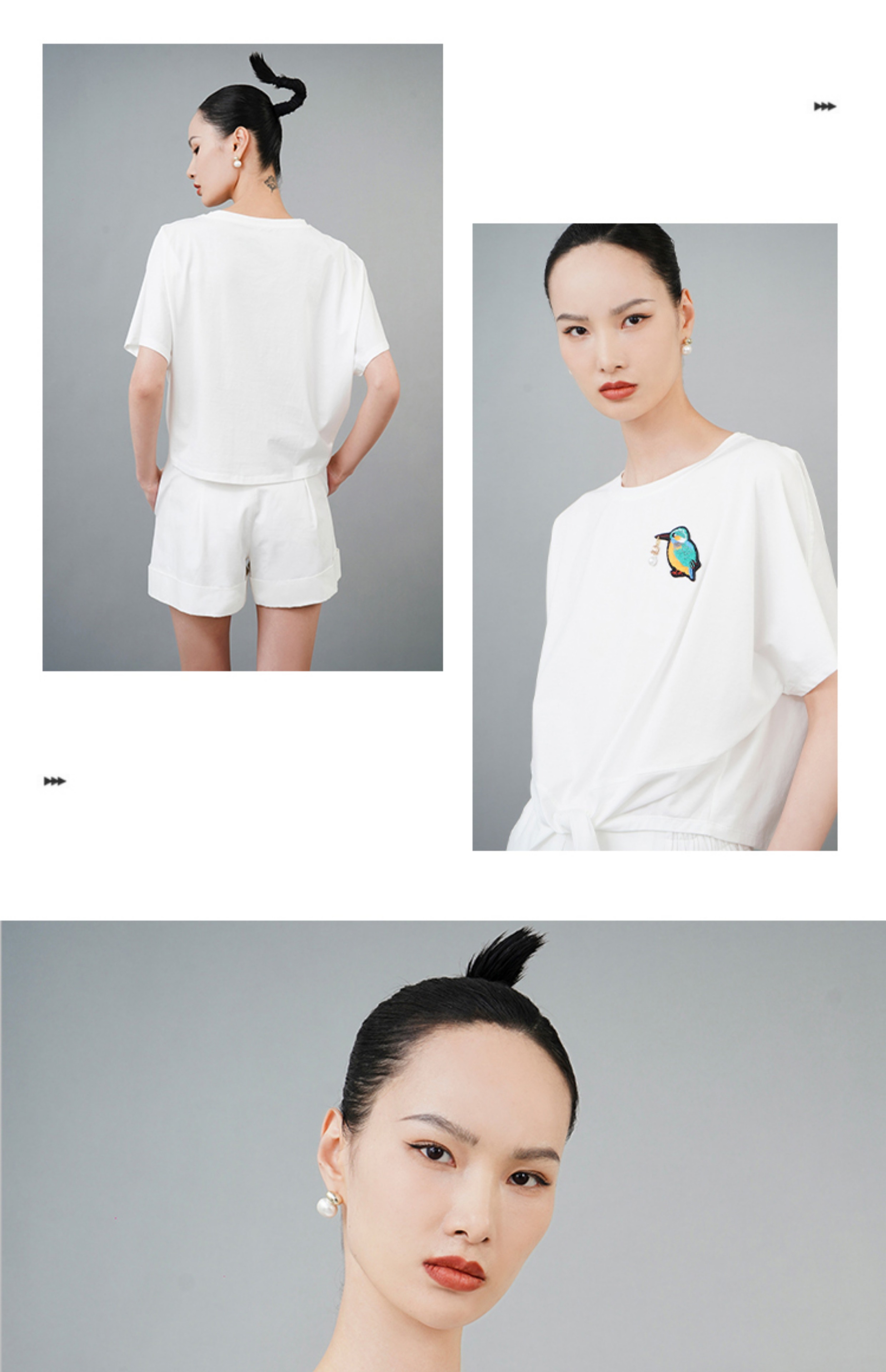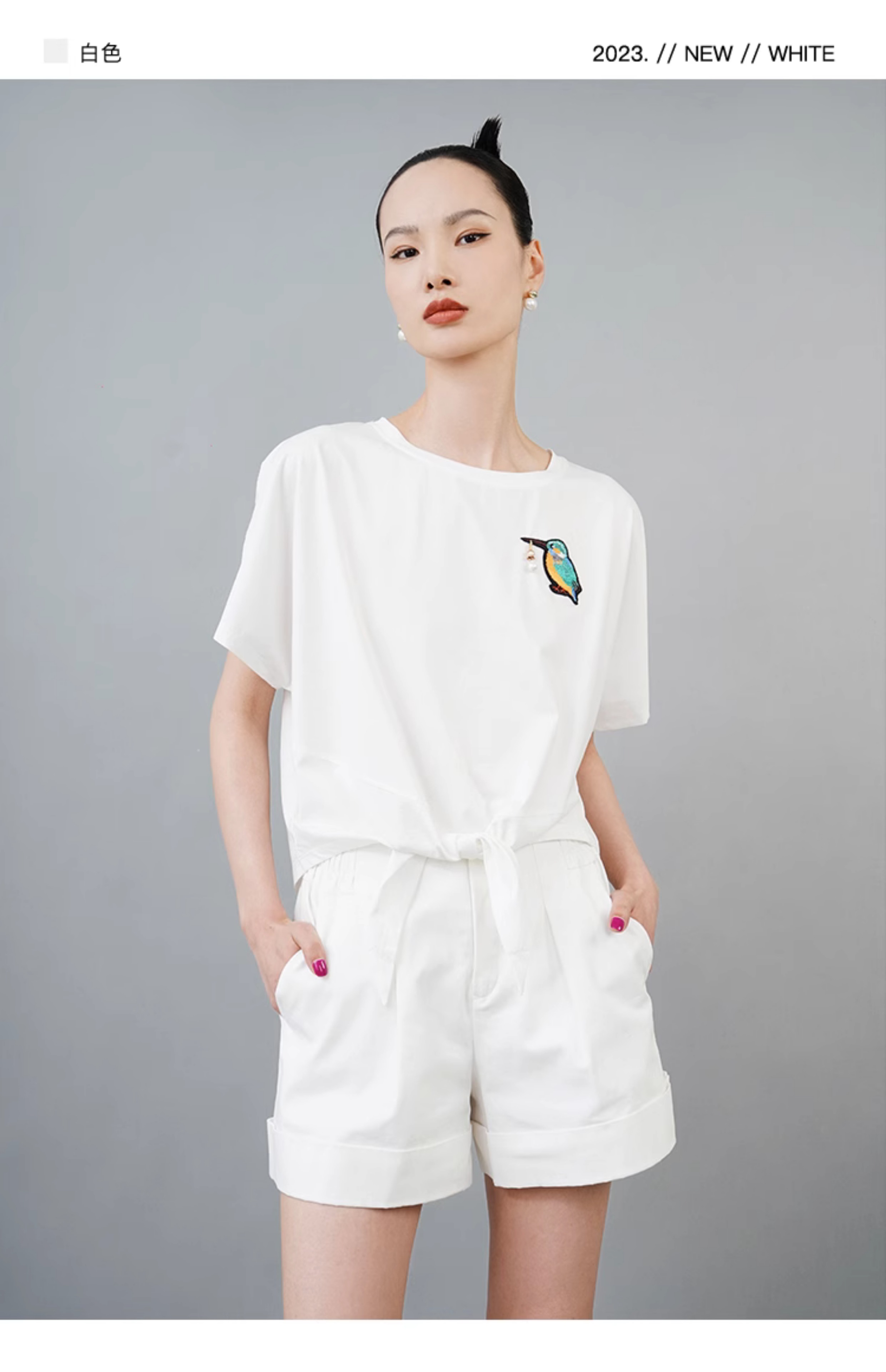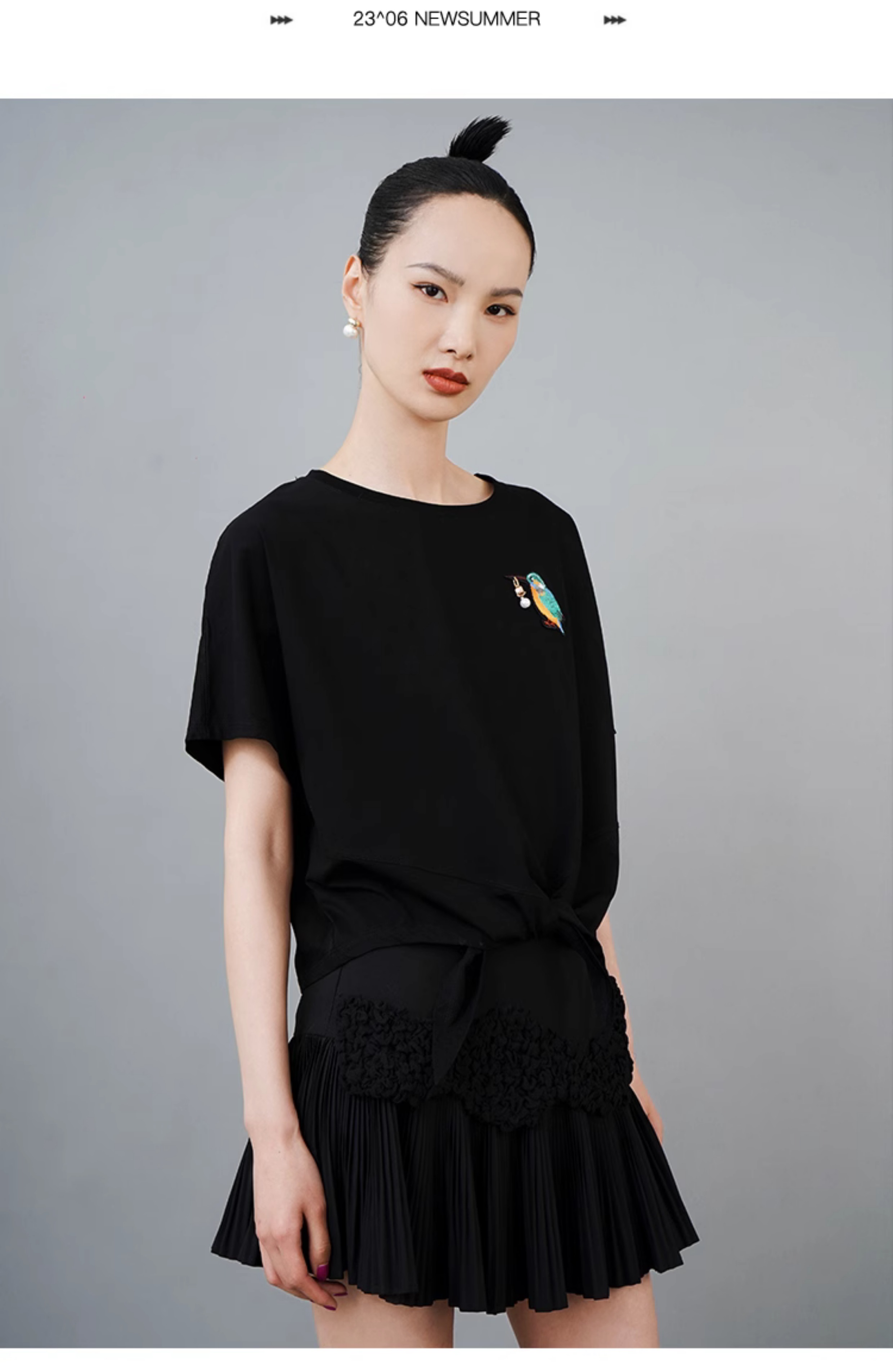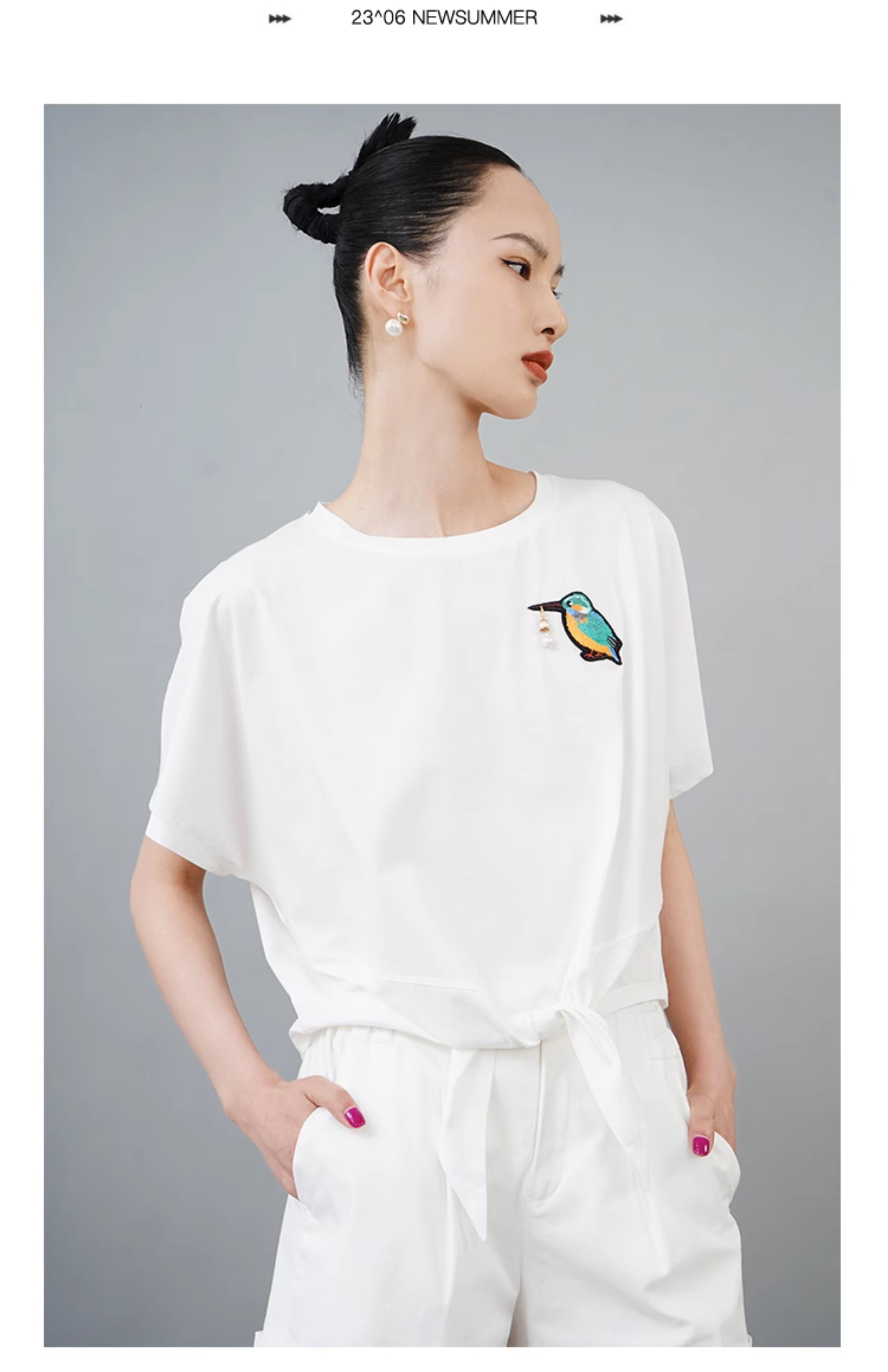 RSG郭培成衣品牌国风翠鸟刺绣下摆打结宽松T恤