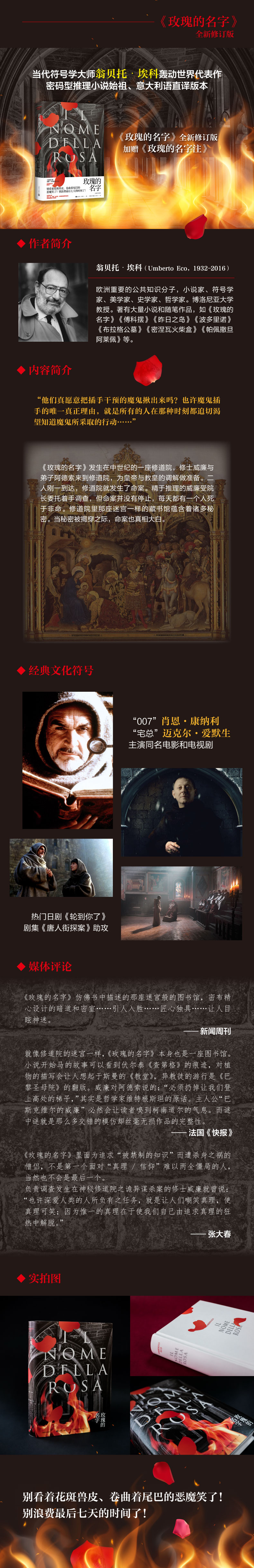 《玫瑰的名字》是一则发生在意大利中世纪修道院的神秘故事,在推理文学大国日本甚至被选为"这本推理小说了不起"大奖创设20年以来总评榜第一名。主人公方济各会修士威廉与弟子阿德索来到修道院,为神圣罗马帝国皇帝与教皇的调解做准备。二人刚一到达,修道院就发生了命案。精于推理的威廉受修道院院长的委托着手调查。命案并没有停止,每天都有一个人死于非命。迷宫似的修道院蕴含着诸多秘密。当秘密被揭穿之际,命案也真相大白。修道院在大火中付之一炬。 中文版的修订依然请沈萼梅女士操刀,并在结构上进行了调整,收入了"玫瑰的名字注"。