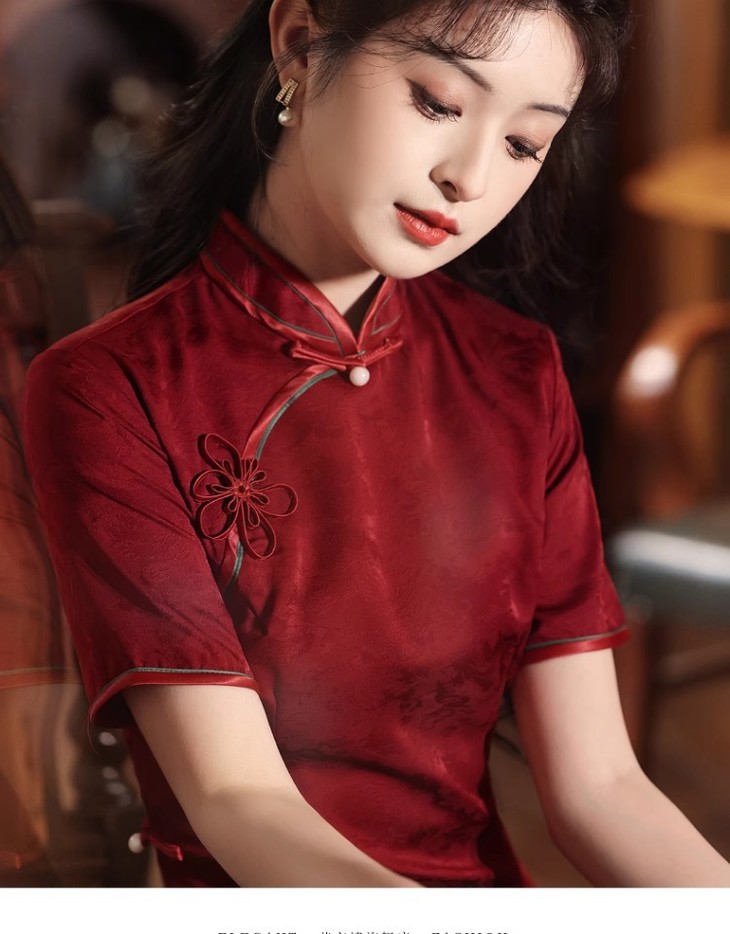 红色刺绣衬衫女设计感小众2022春季立领衬衣七分袖上衣 KIS1002