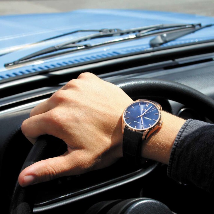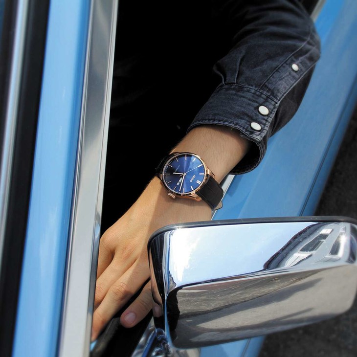 镜面 材质 | 蓝宝石水晶玻璃 | 表盘 | PVD镀玫瑰金表壳 深蓝色表盘 大三针 日期 星期显示 透底 |