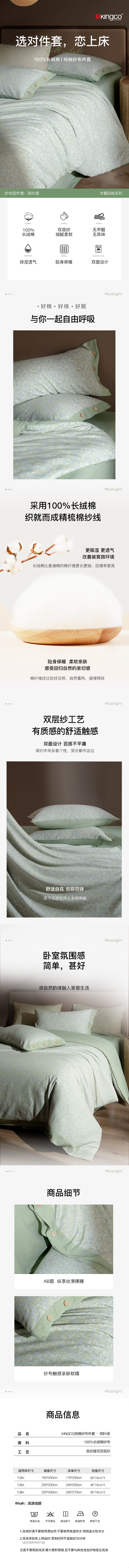kingco京彩家居纱布四件套琼叶绿