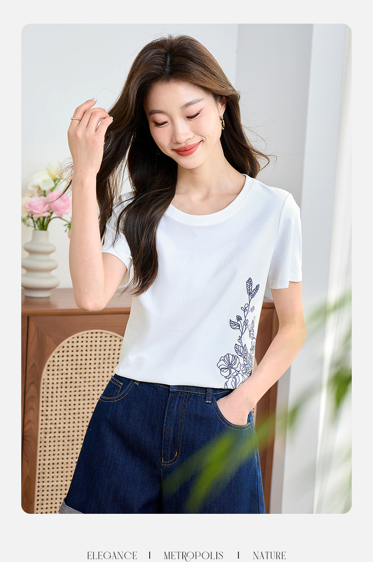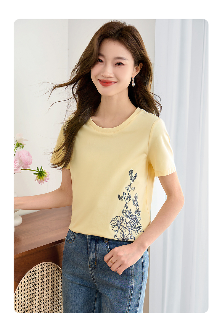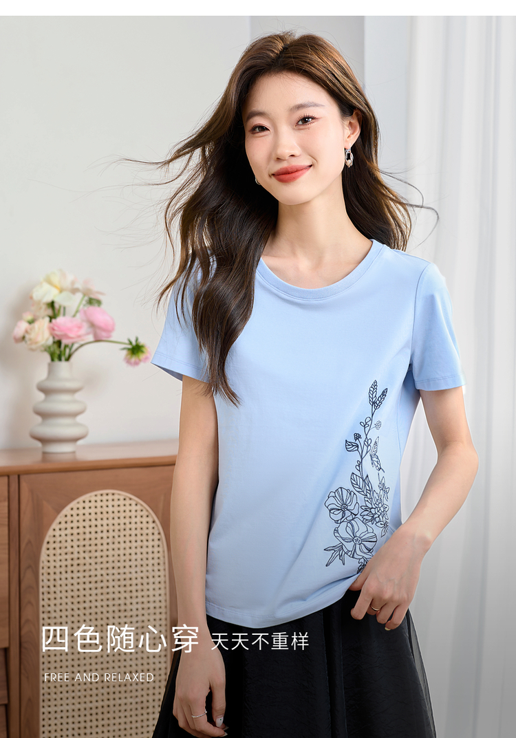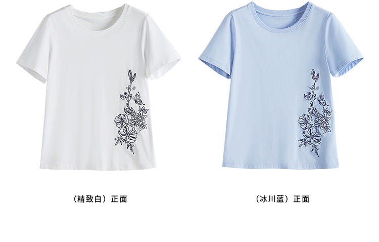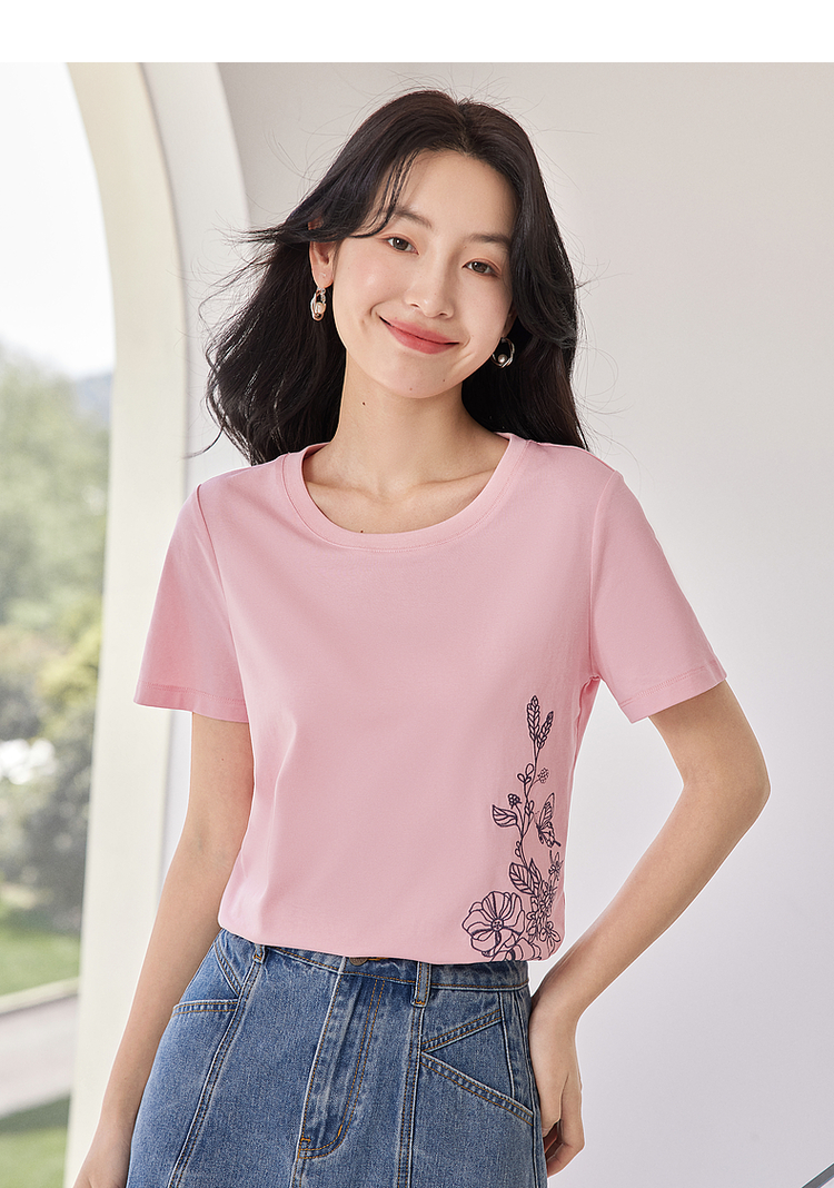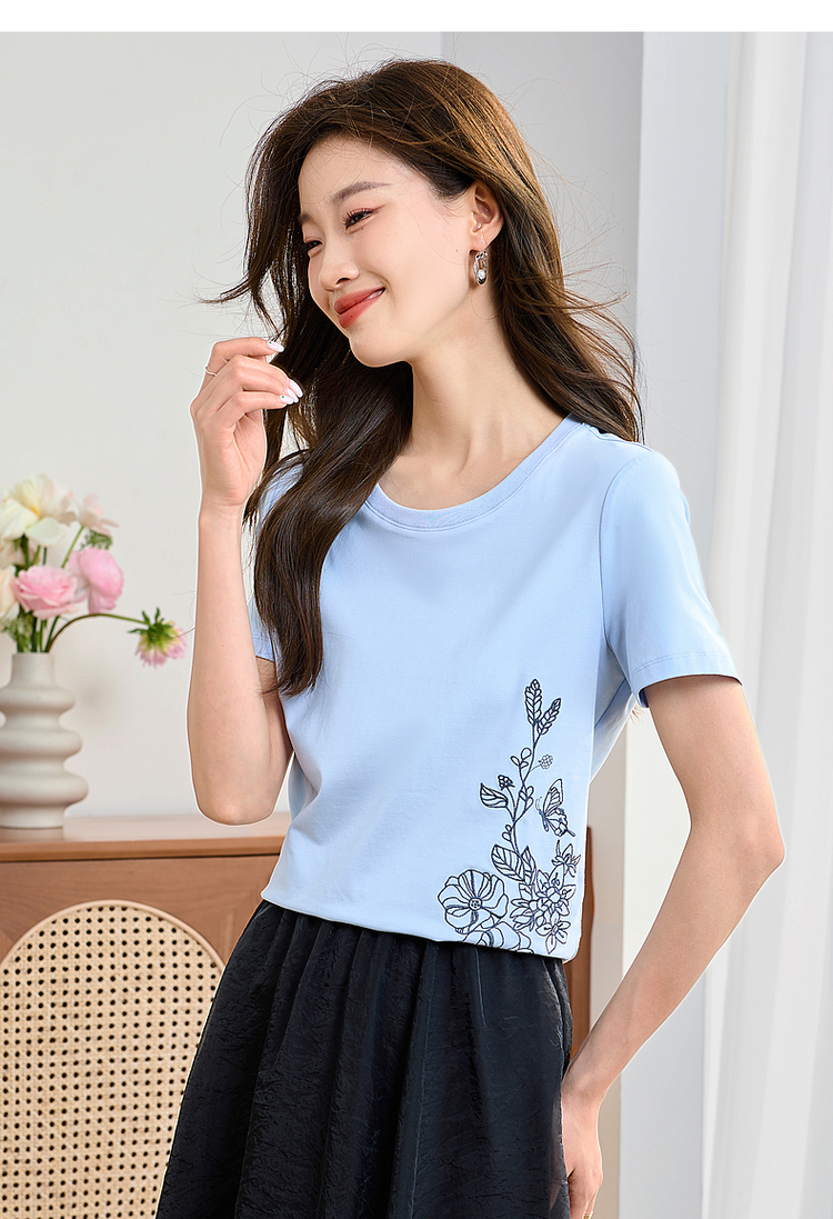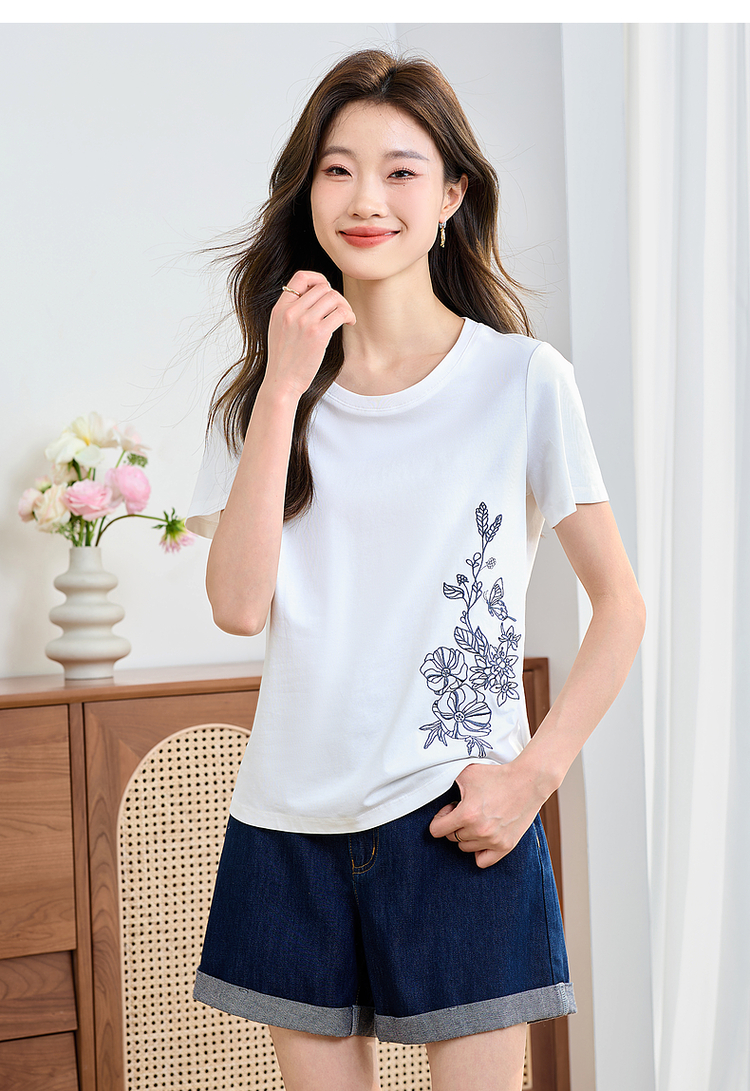 【专属特价】熙世界2025夏新款蝴蝶花卉绣花凉感T恤女短袖休闲独特圆领上衣