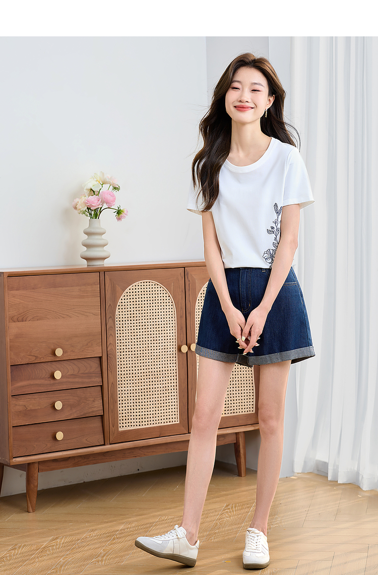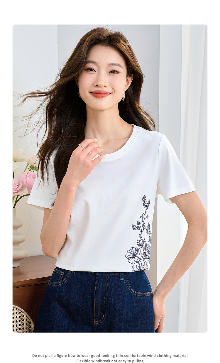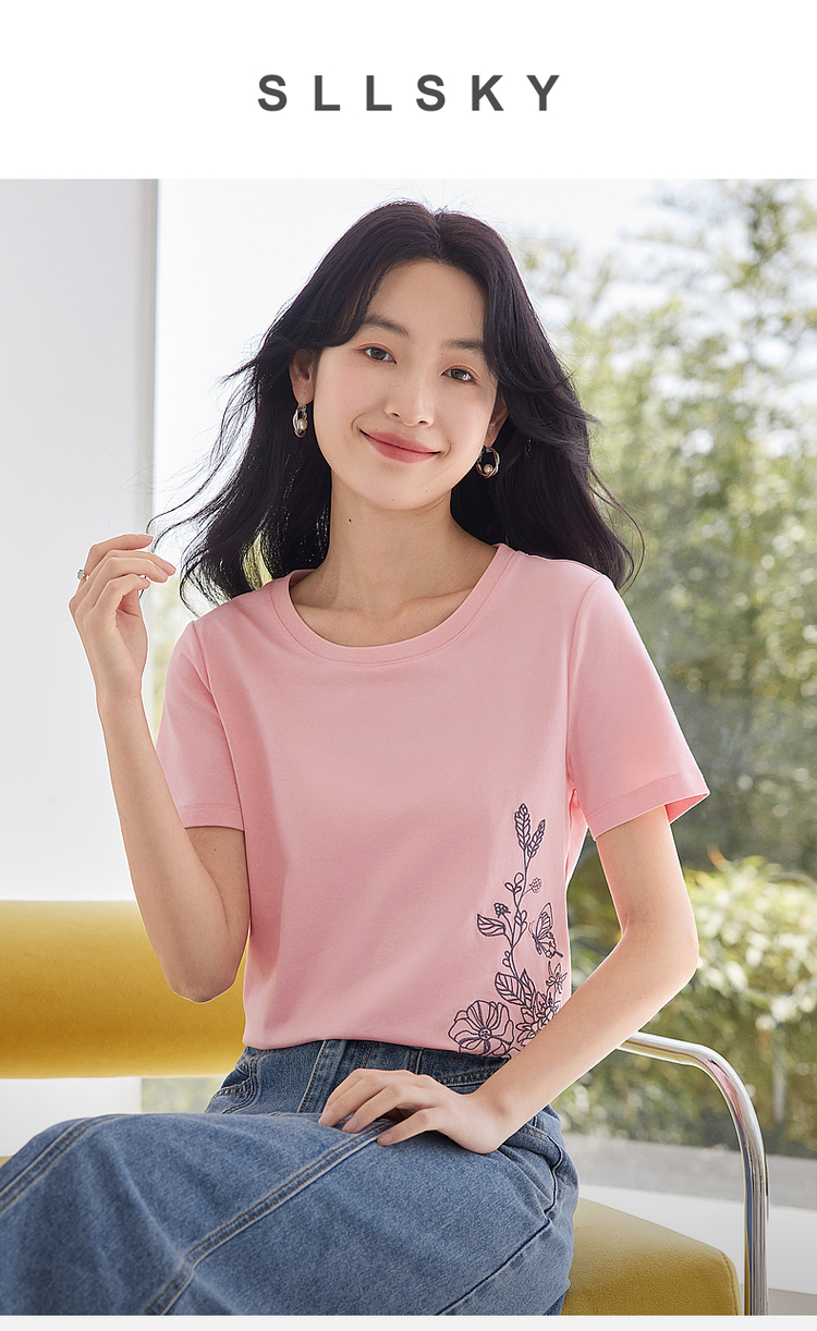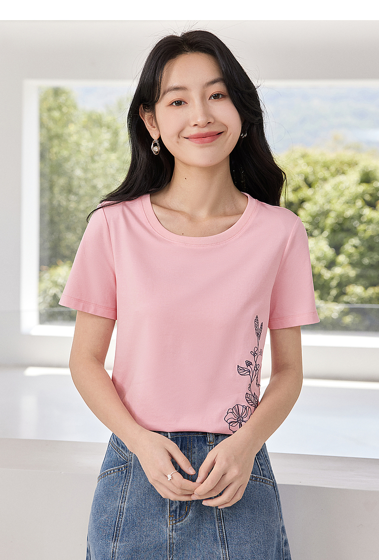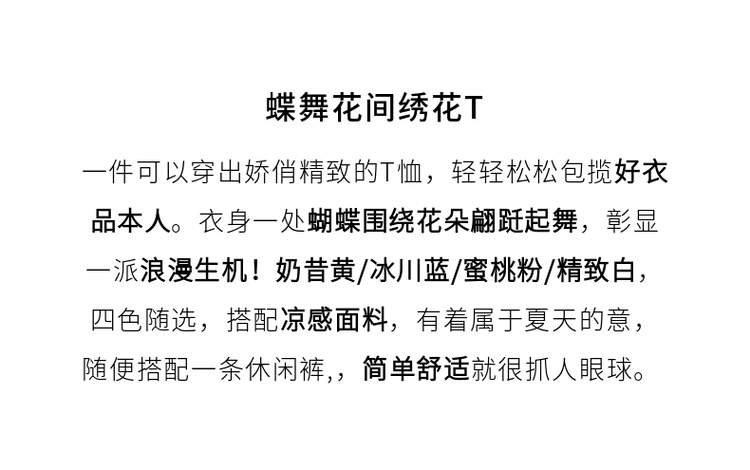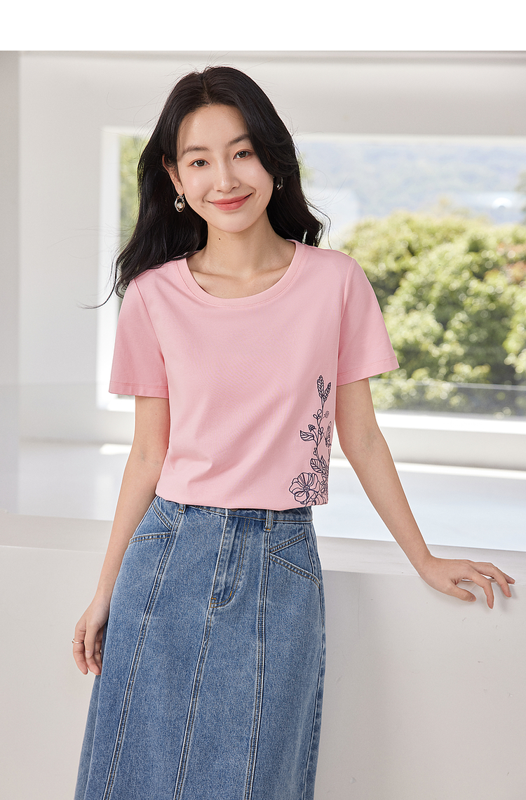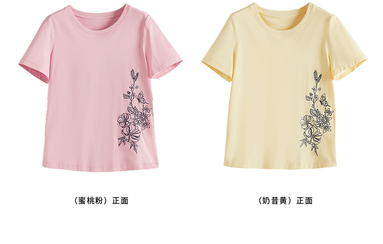 【专属特价】熙世界2025夏新款蝴蝶花卉绣花凉感T恤女短袖休闲独特圆领上衣
