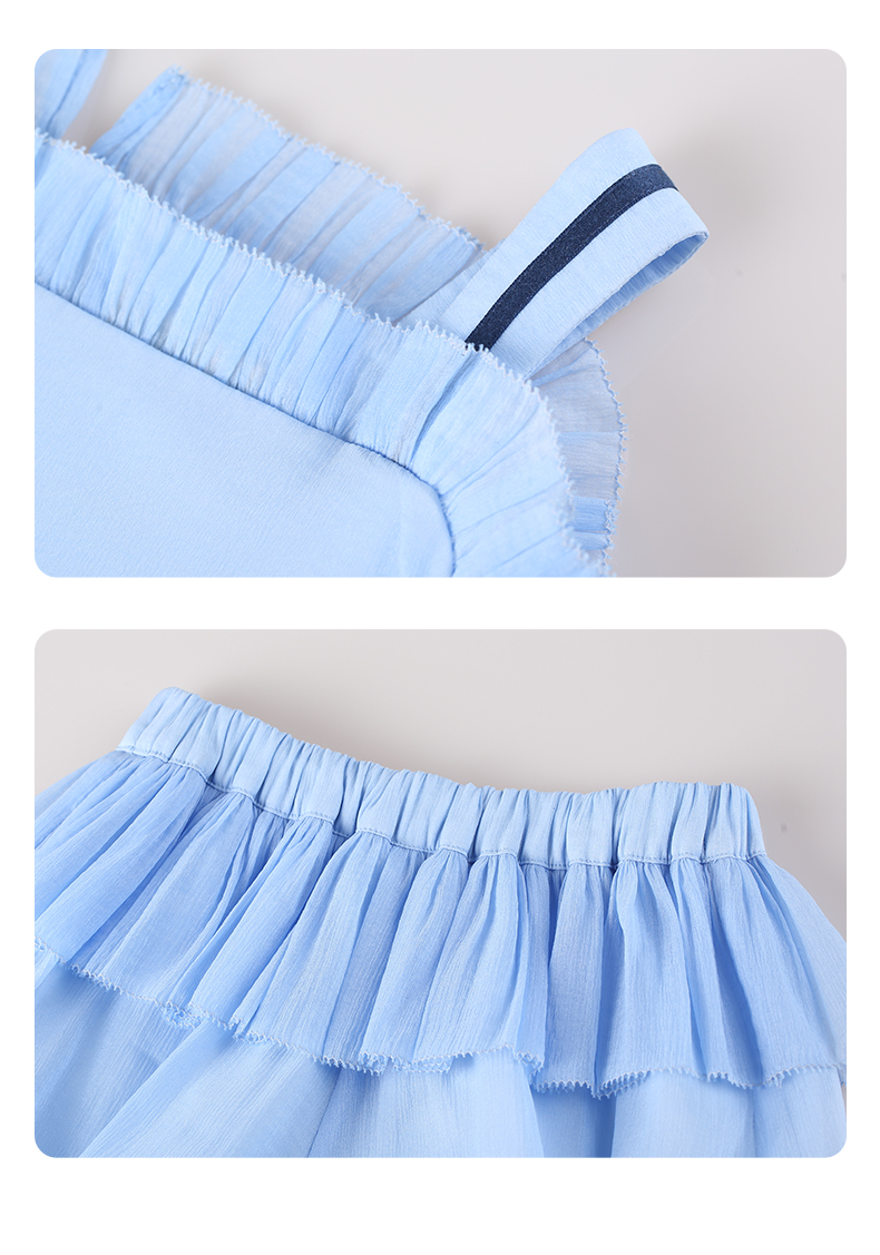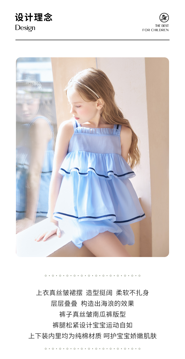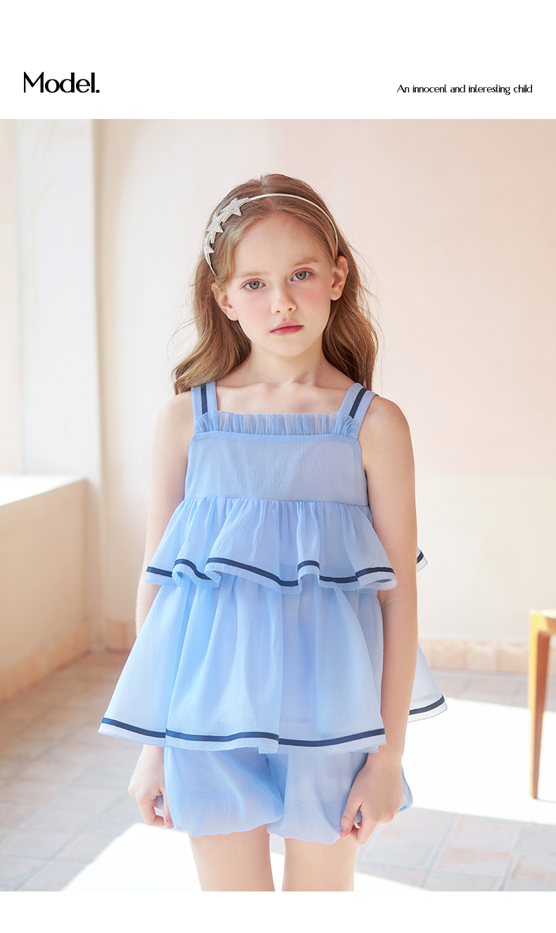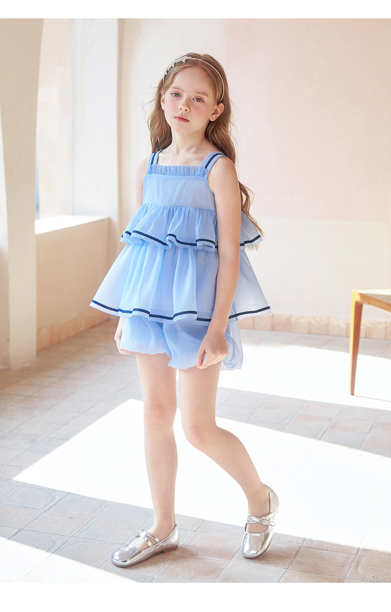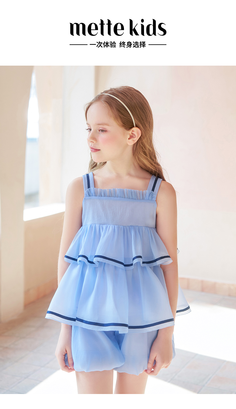 mettekids女童吊带背心套装夏季儿童蓝色短裤中大童洋气南瓜裤