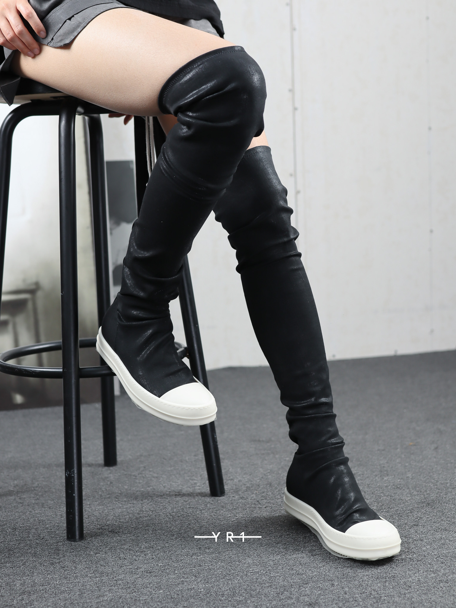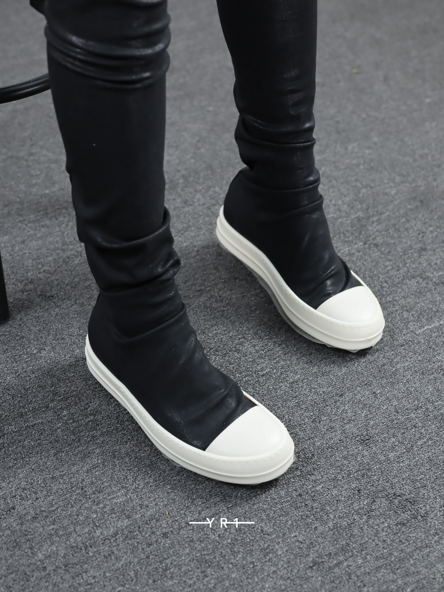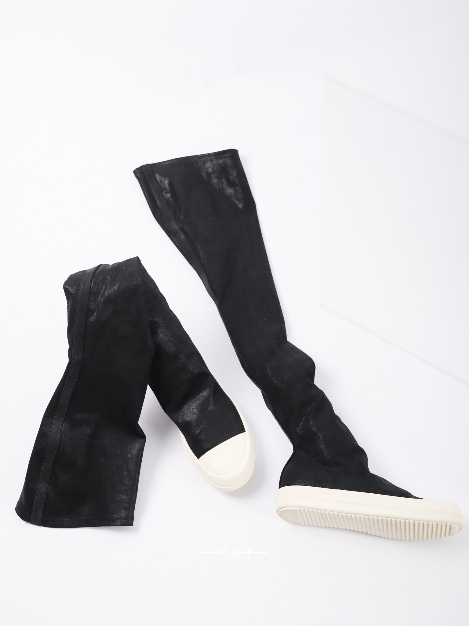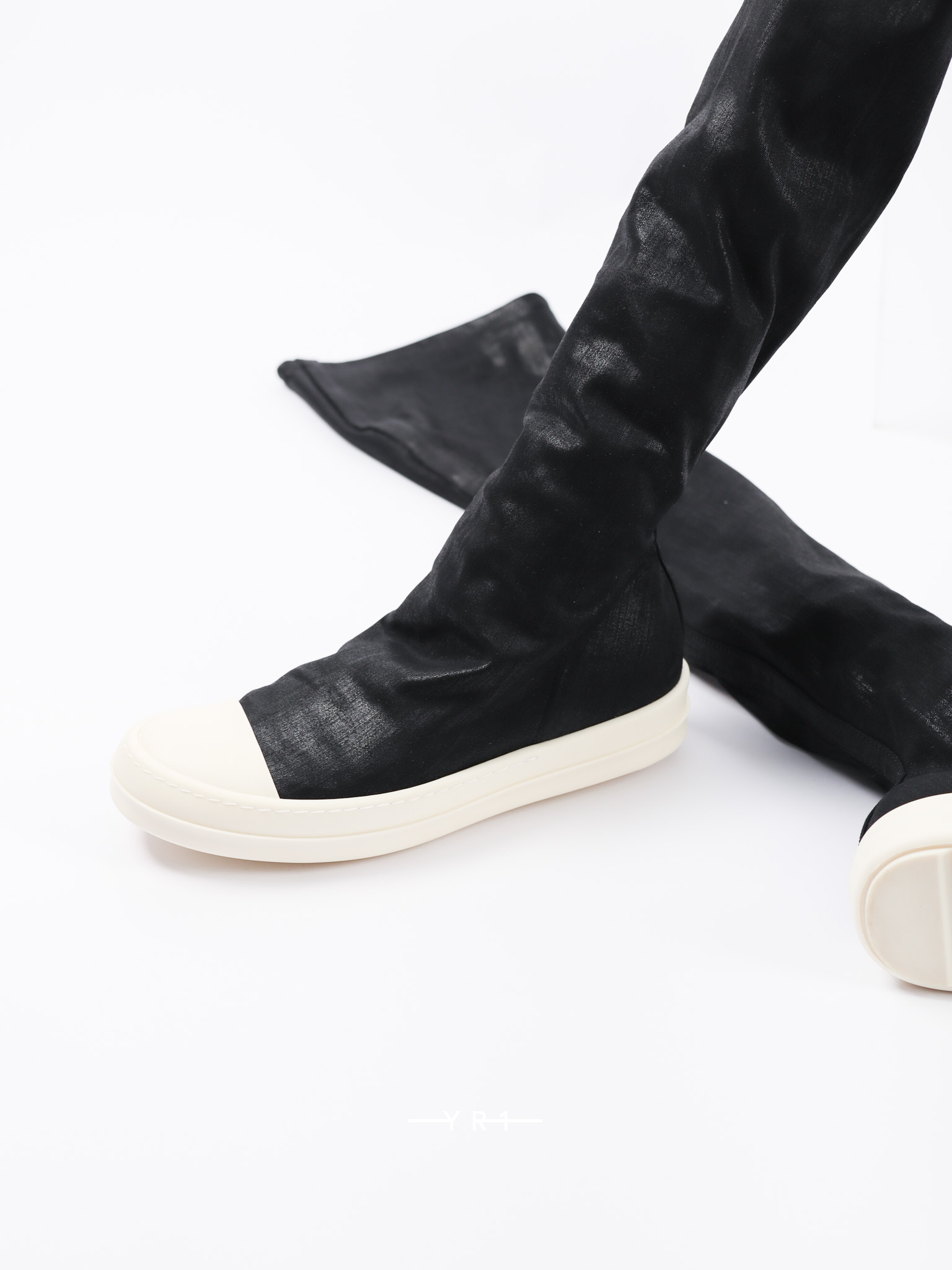 它们有弹性牛仔布袜面,覆盖脚面和脚踝,鞋头和鲨鱼齿鞋底。