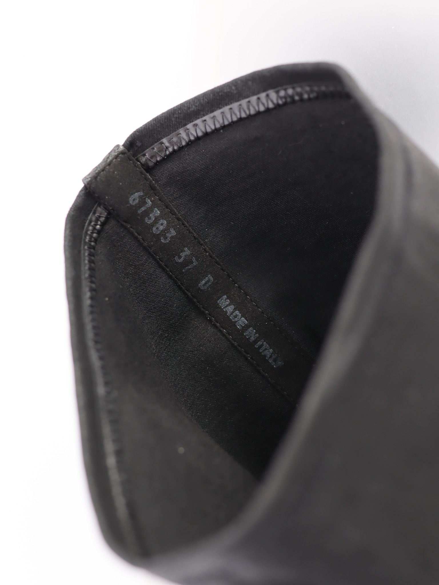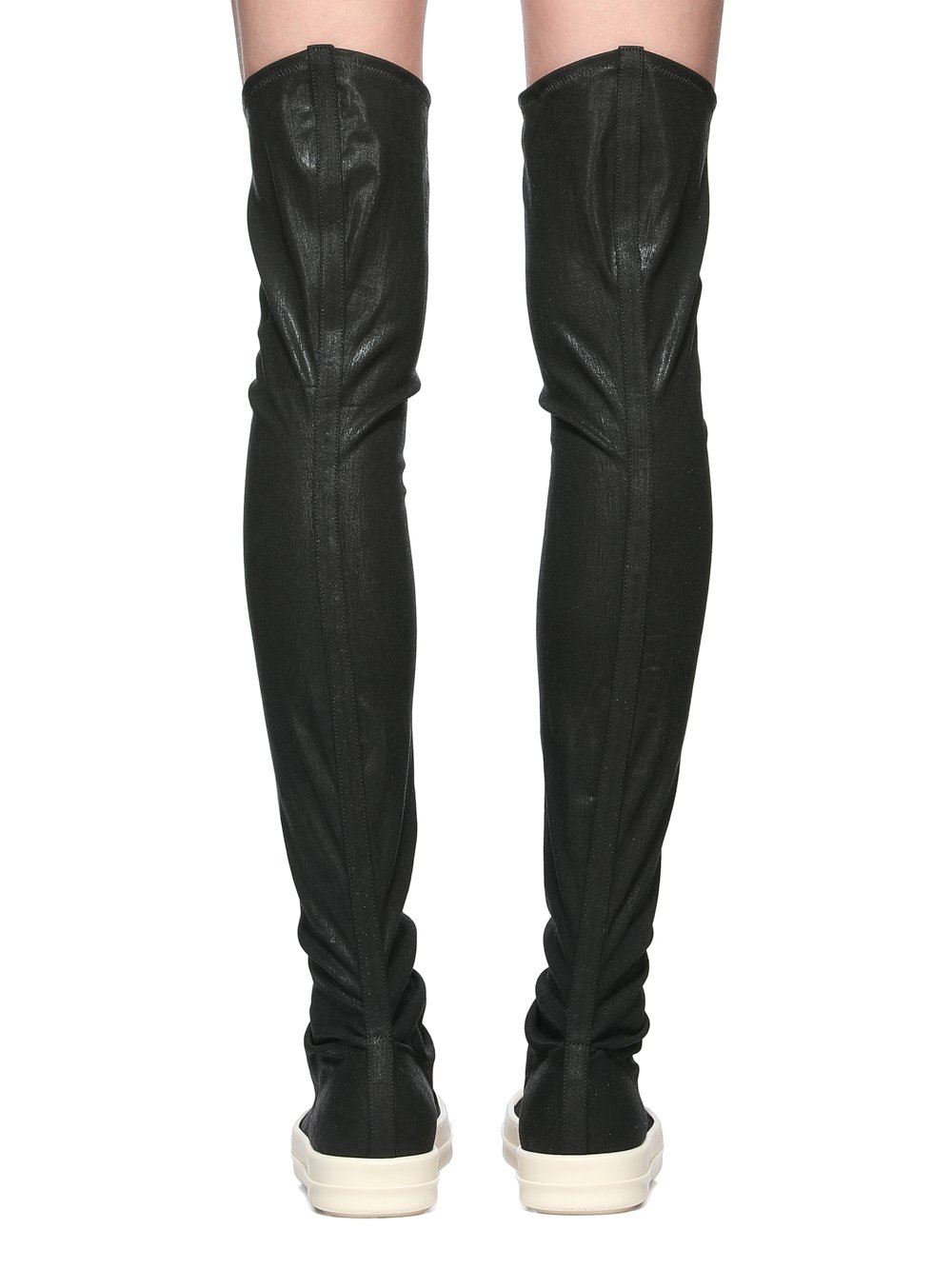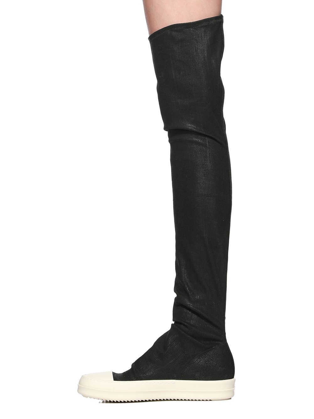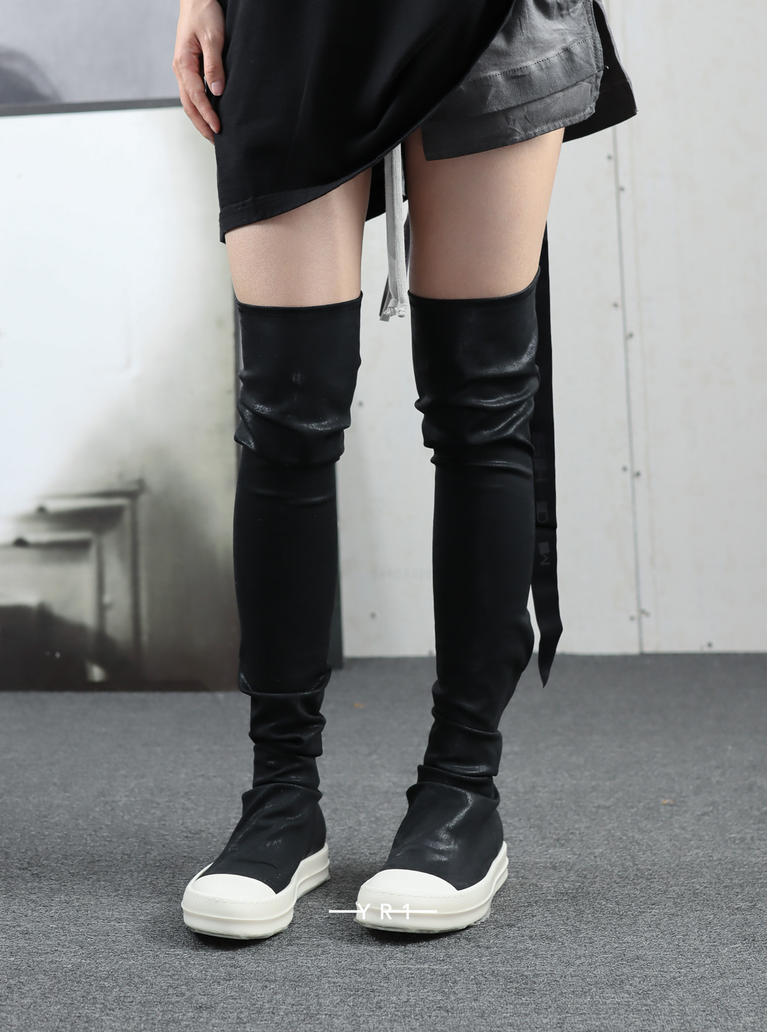 它们有弹性牛仔布袜面,覆盖脚面和脚踝,鞋头和鲨鱼齿鞋底。