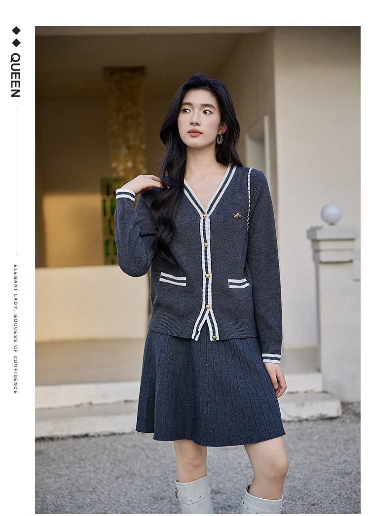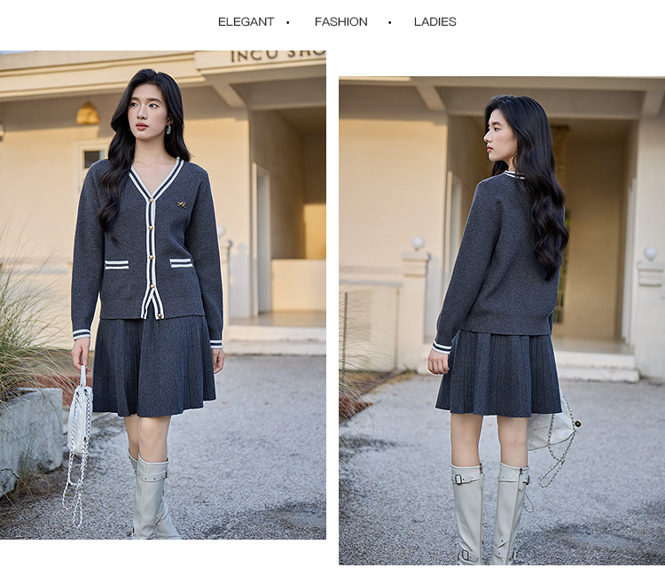 奢姿大码女装2025冬季胖妹妹时尚撞白V领针织开衫搭百褶裙两件套9654991037AB