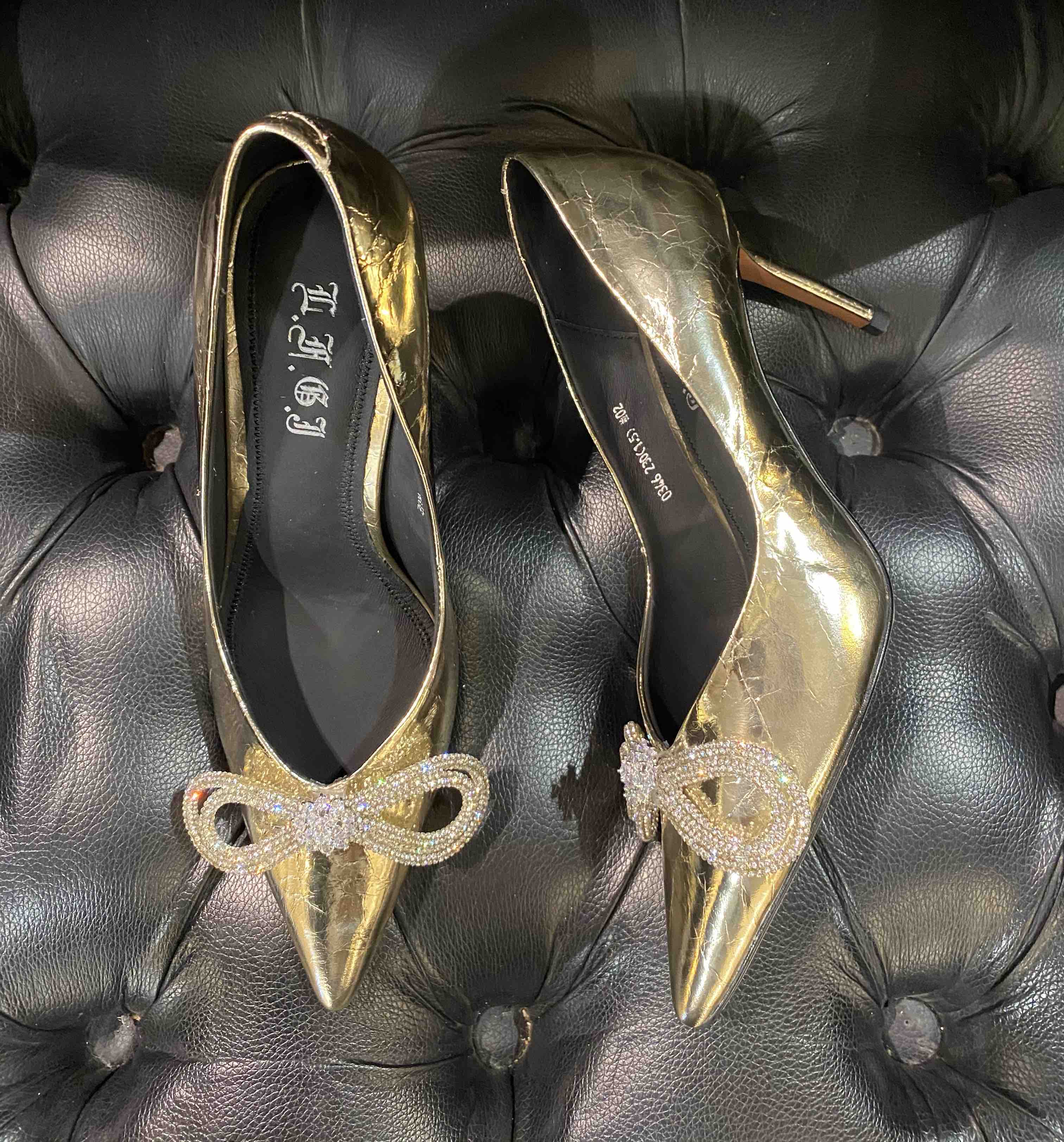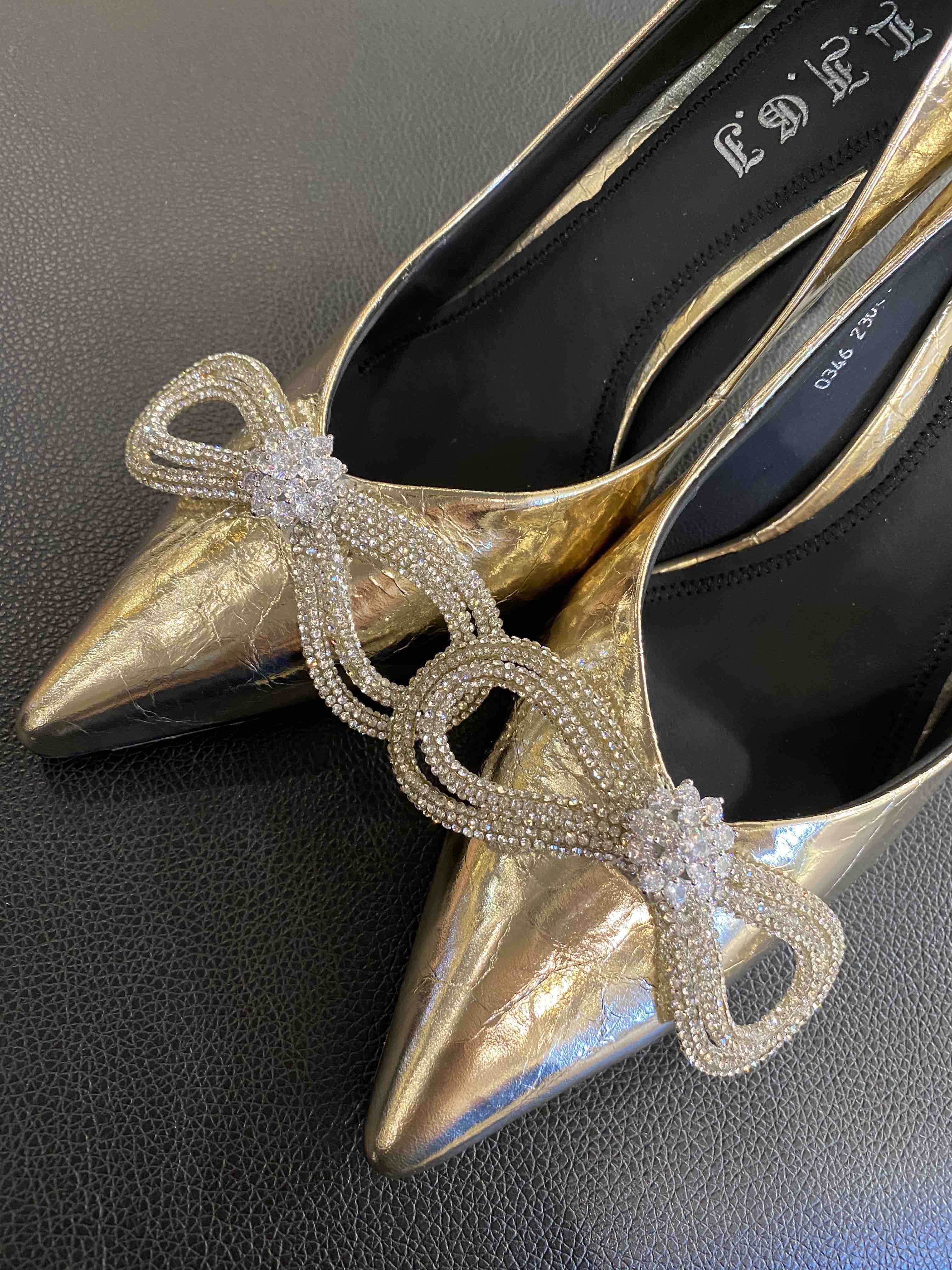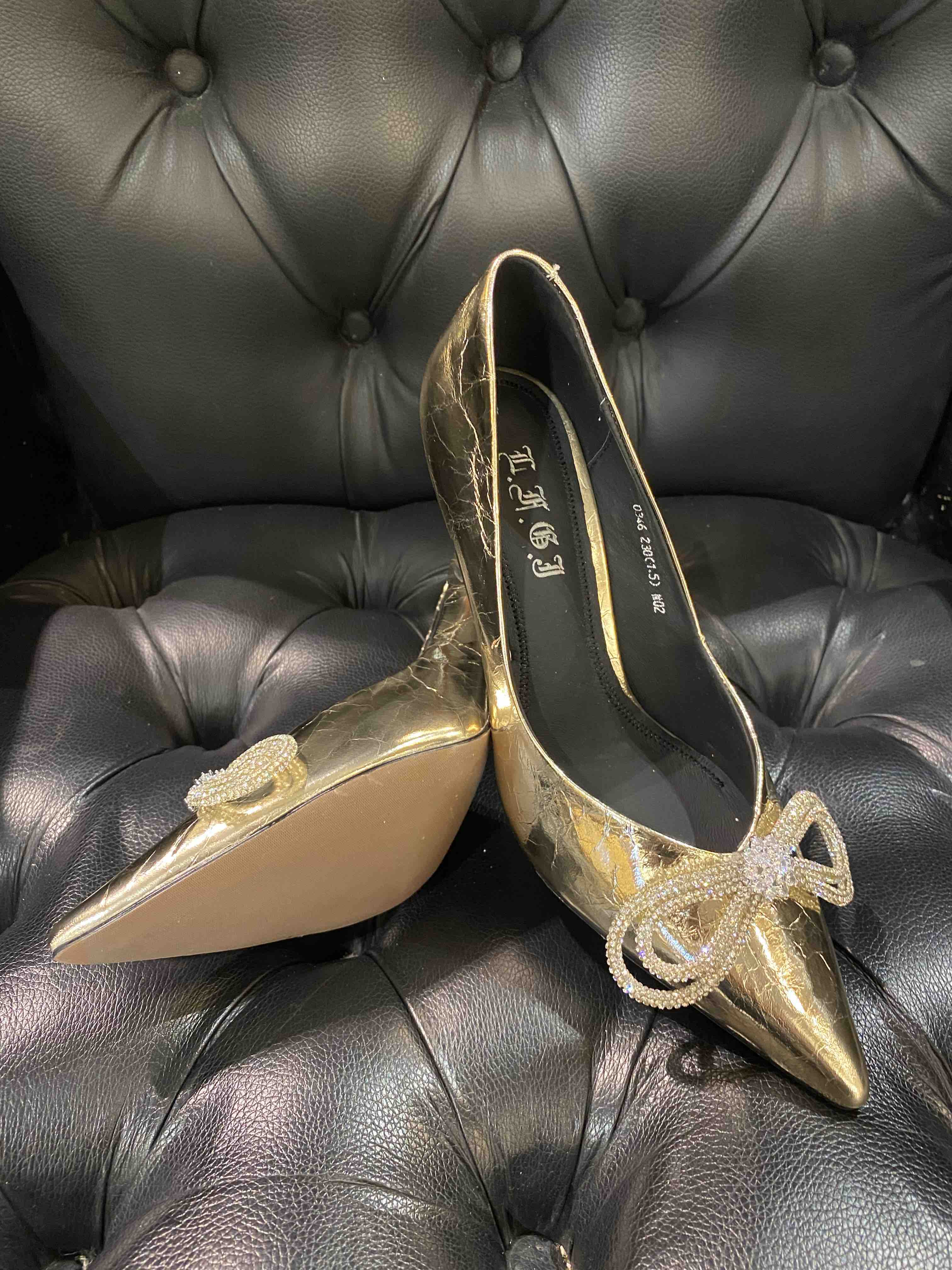 LFGJ 0346 金属色尖头细跟水钻蝴蝶结单鞋女