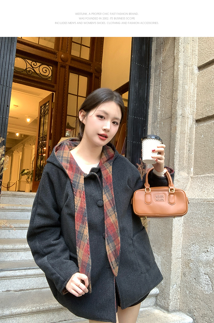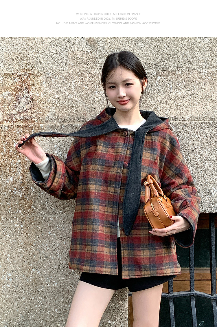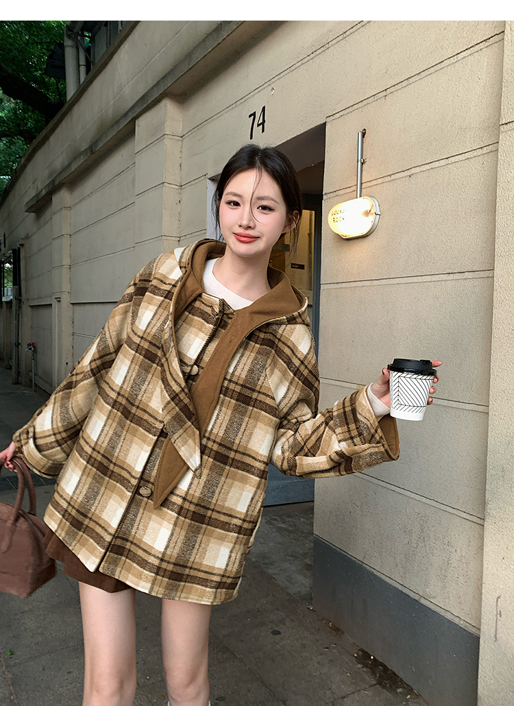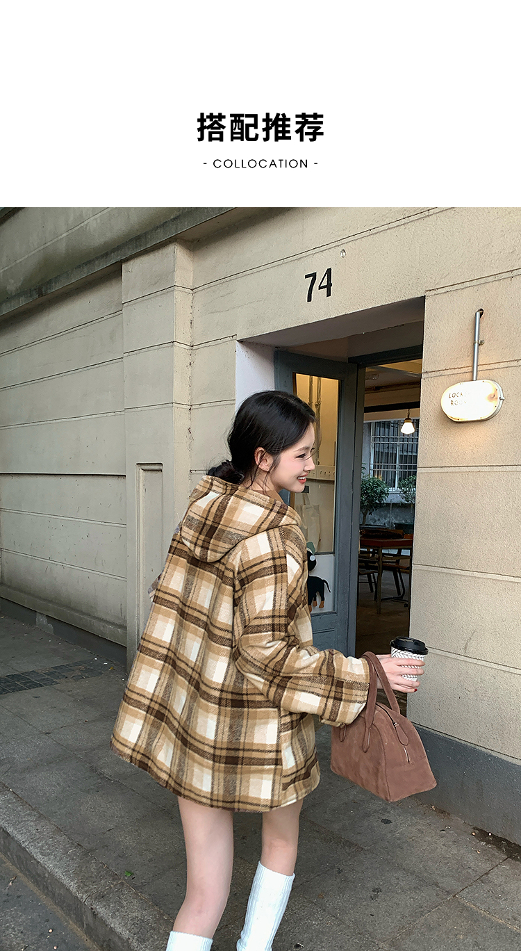 西遇连帽格子毛呢大衣女冬季新款棕色宽松小个子短款外套SS141377