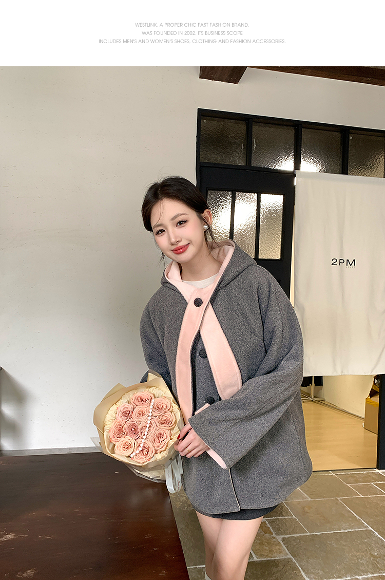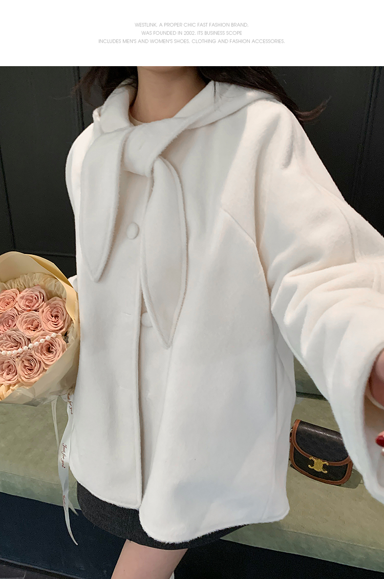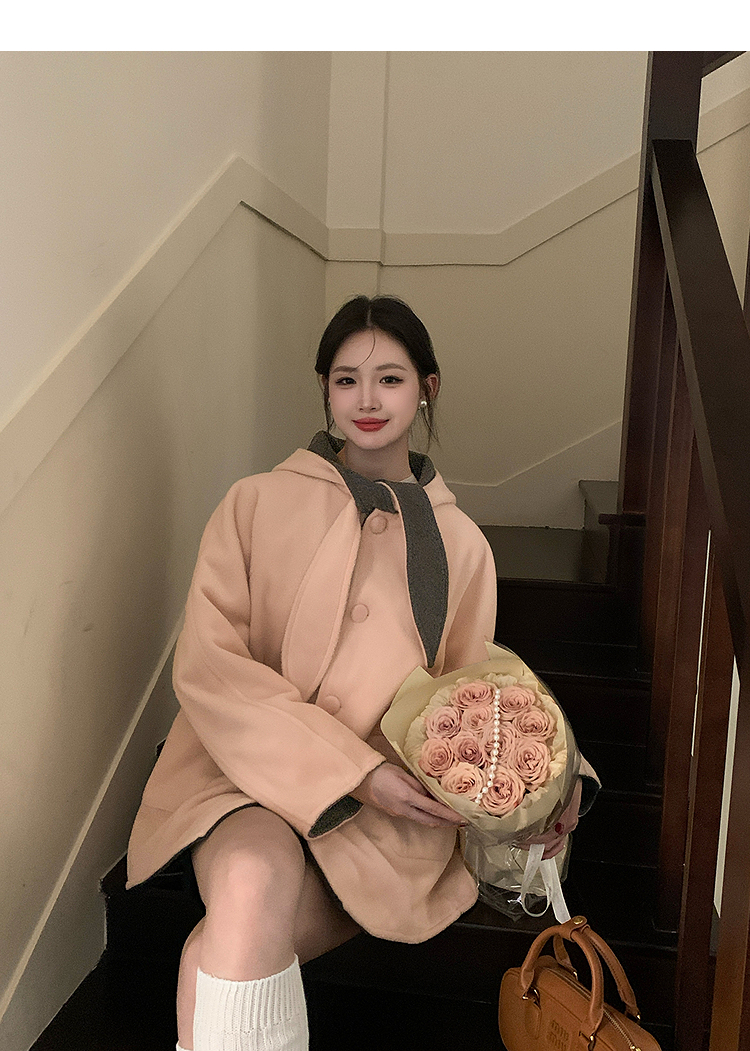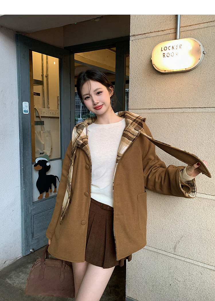 西遇连帽格子毛呢大衣女冬季新款棕色宽松小个子短款外套SS141377