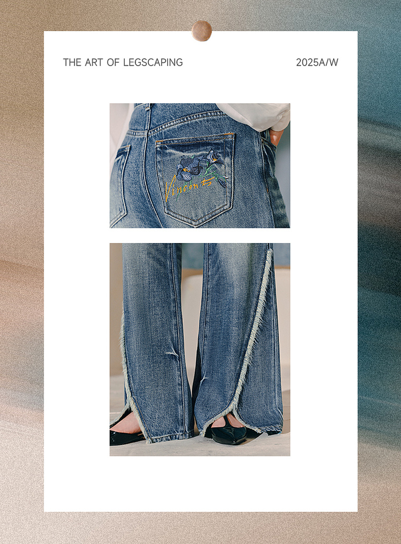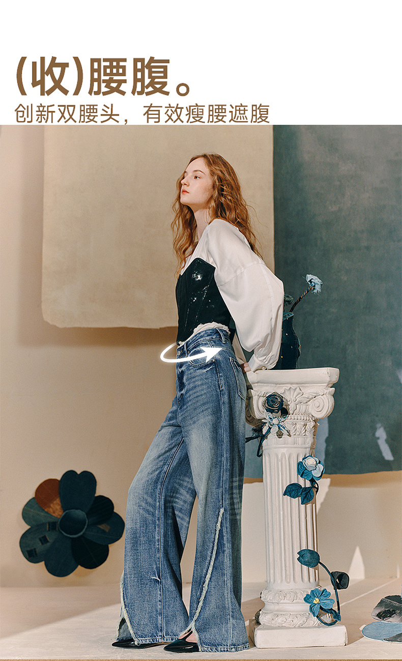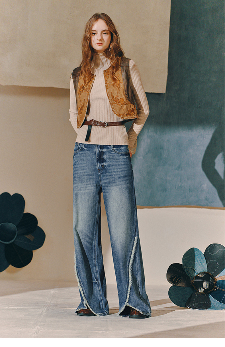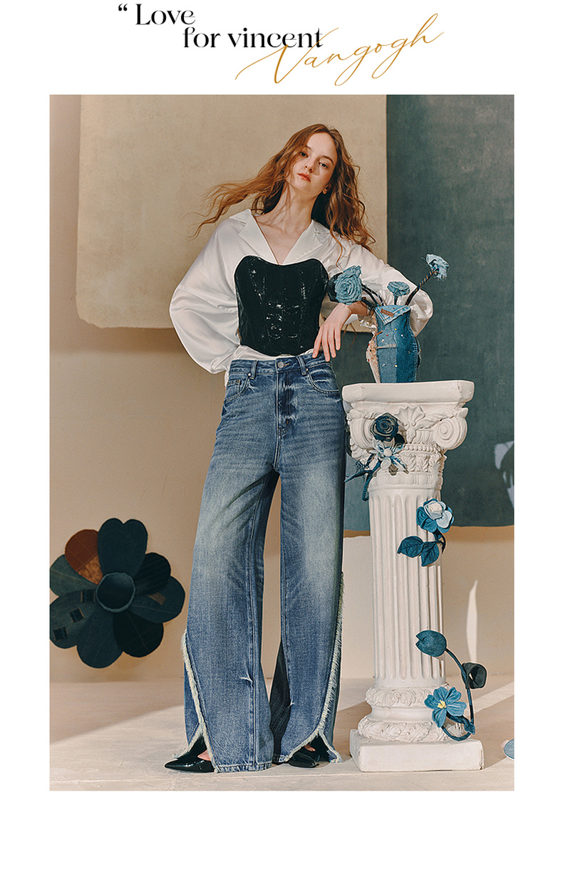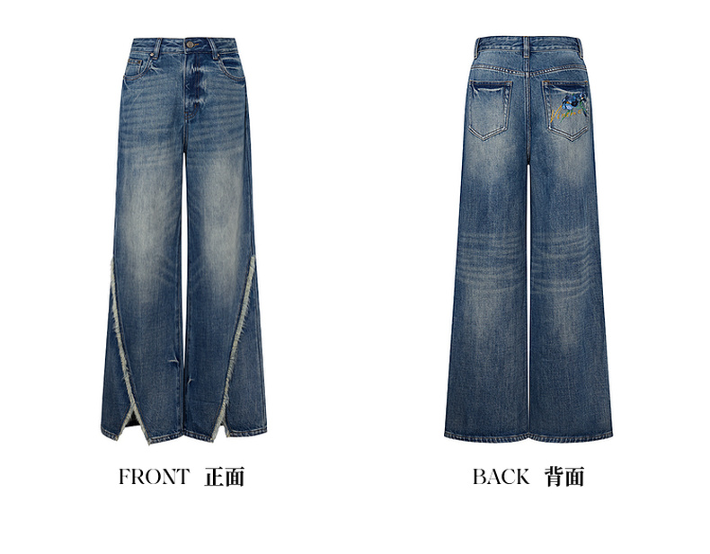 两三事梵高文艺星云裂隙2025秋新款绣花水洗做旧毛边阔腿牛仔裤女