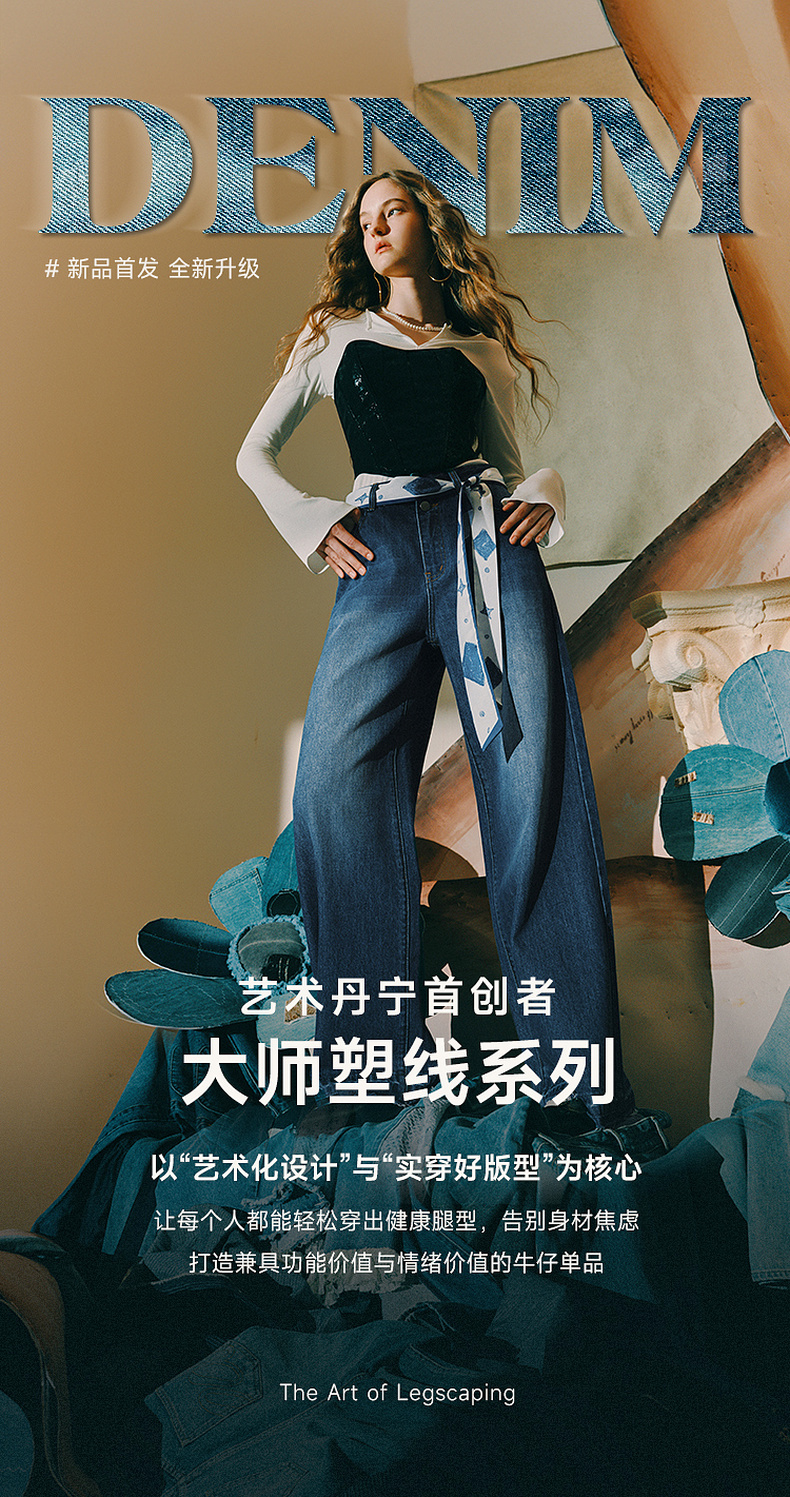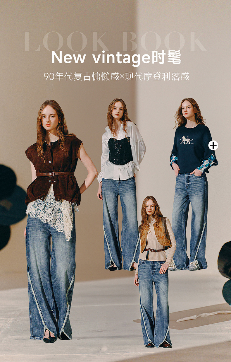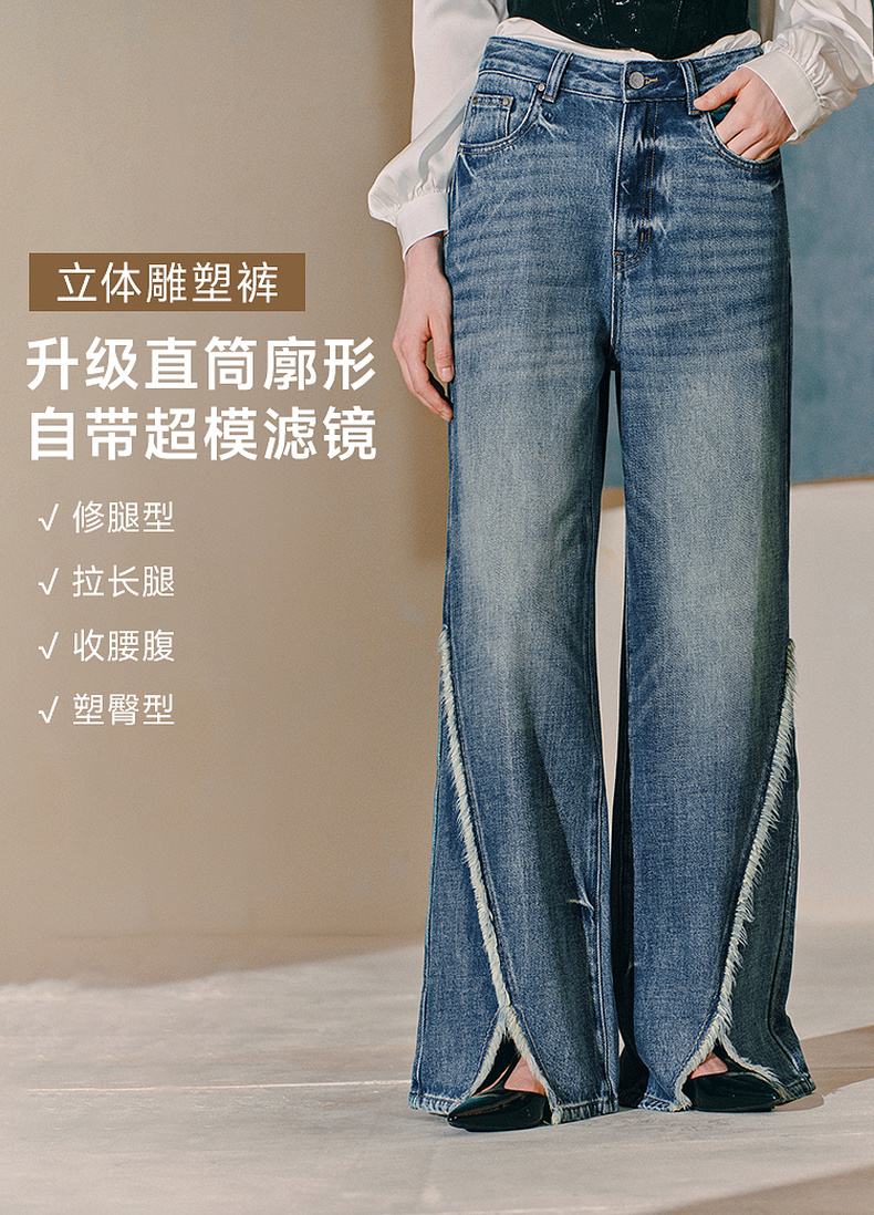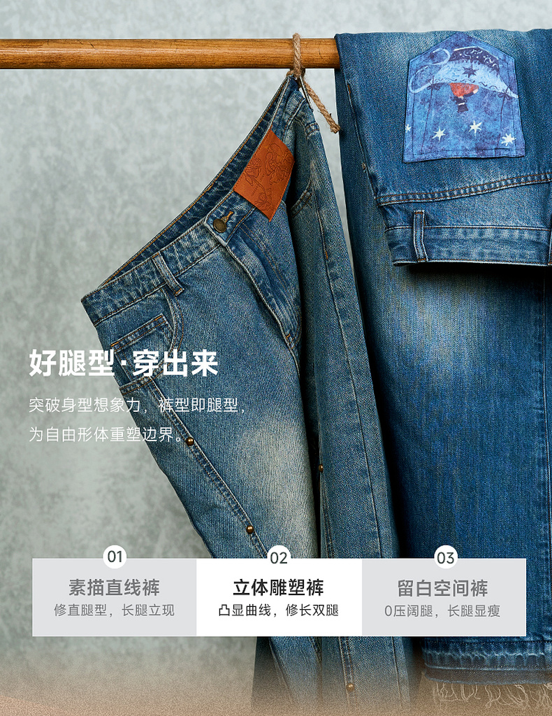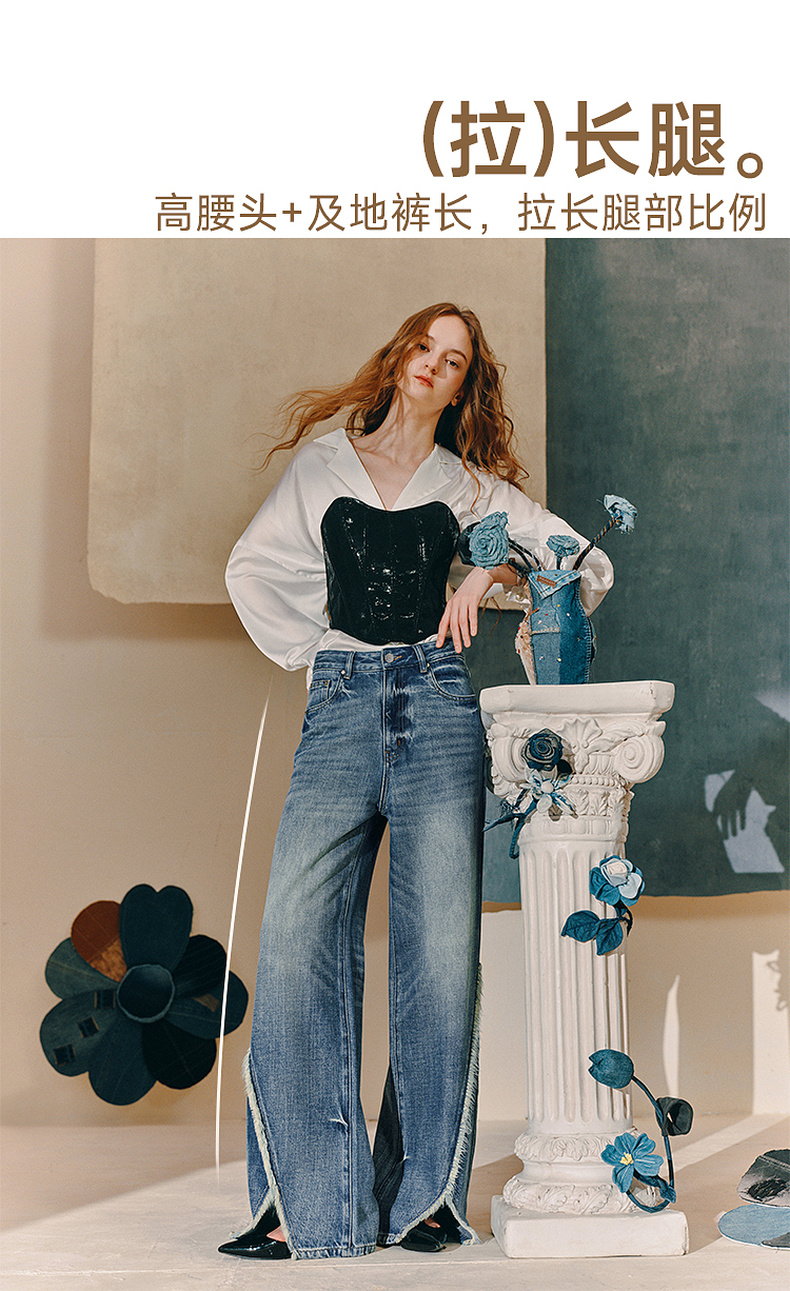 两三事梵高文艺星云裂隙2025秋新款绣花水洗做旧毛边阔腿牛仔裤女