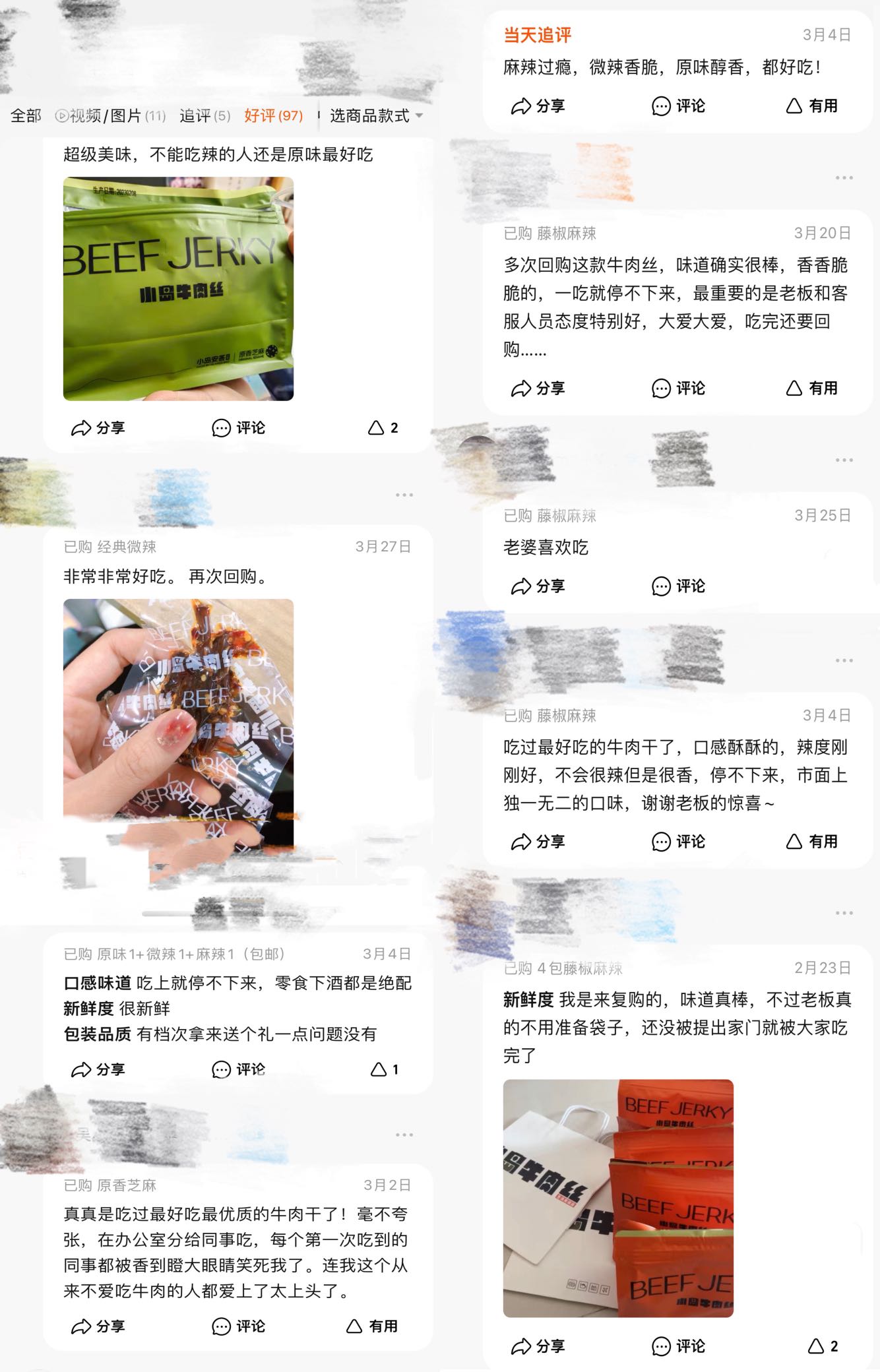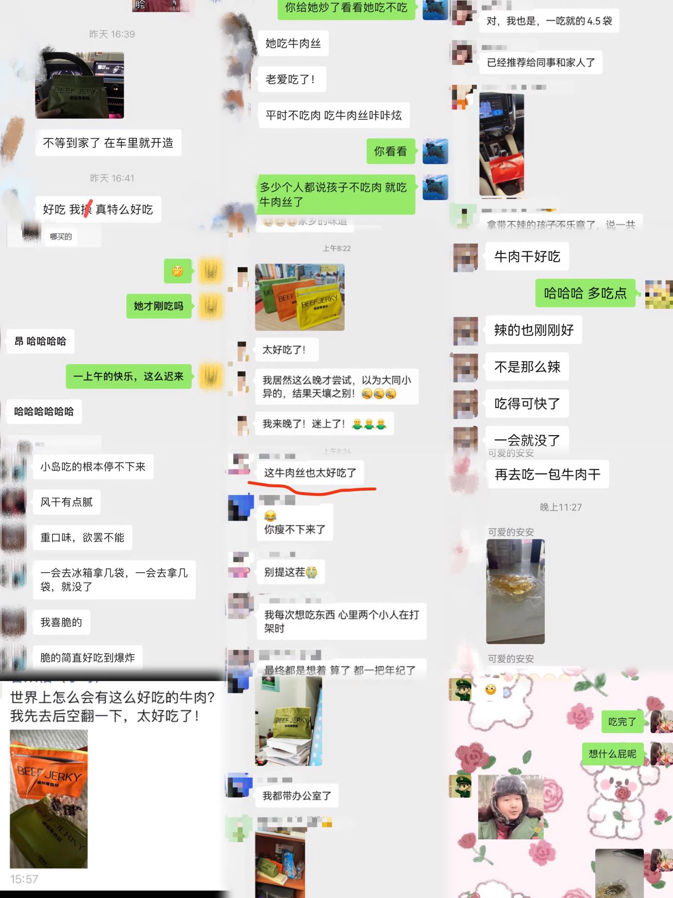 敲黑板划重点:因为物理防腐需要控制含水量,我们含水量要控制在12%左右,所以十斤鲜牛肉只能出两斤半的成品喔!丧心病狂的老板在出炉之后还要磕掉大部分附着在牛肉丝上的调料和肉渣渣,坚决不让调料卖出牛肉价!!!一分钱一分货,不要只算一斤多少钱,还要看多少钱才能出来这一斤,含水量50%的产品跟含水量10%的产品成本的计算方式是截然不同哒~~~好吃,健康,适合分享,这是我们物有所值之处🤩🤩🤩